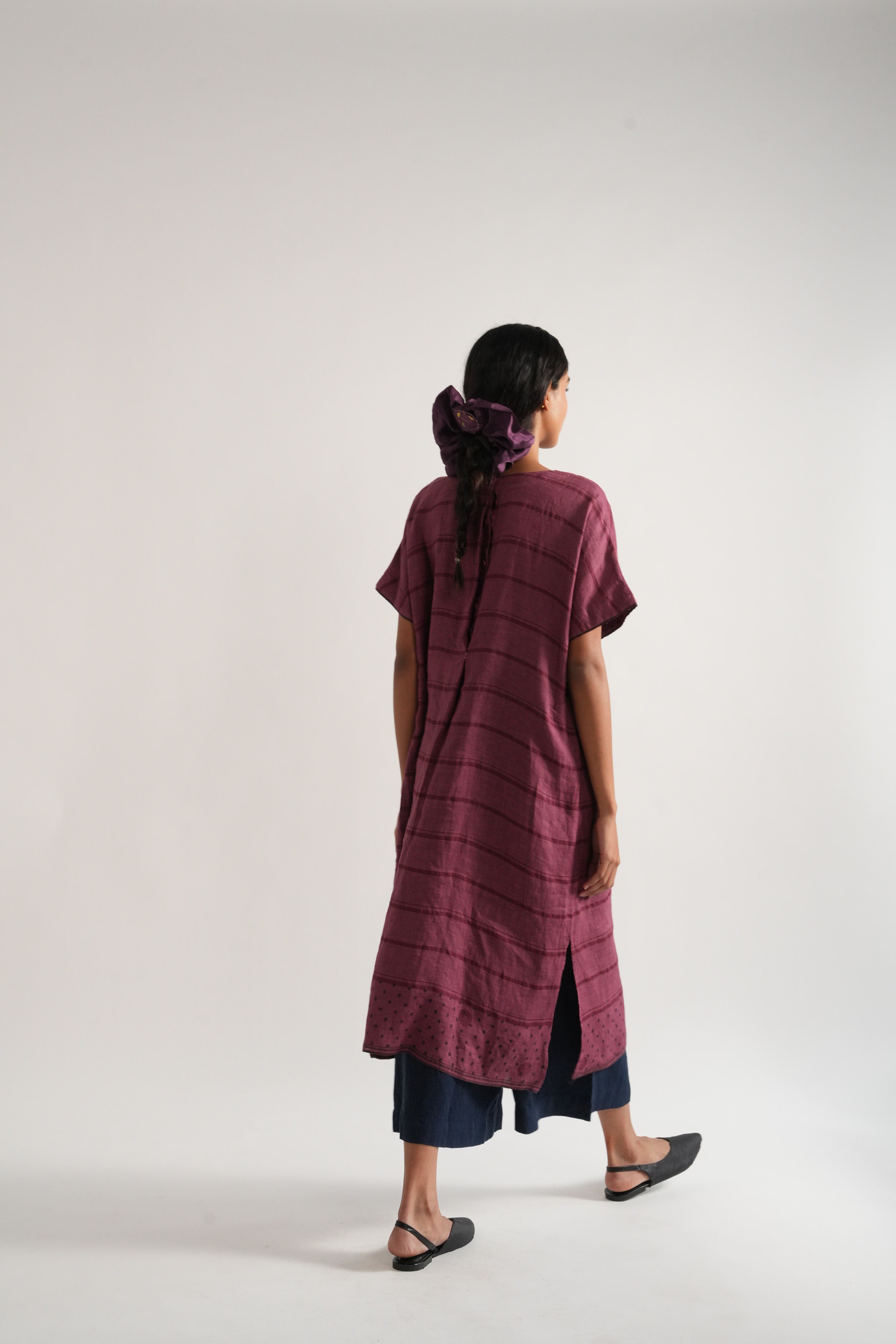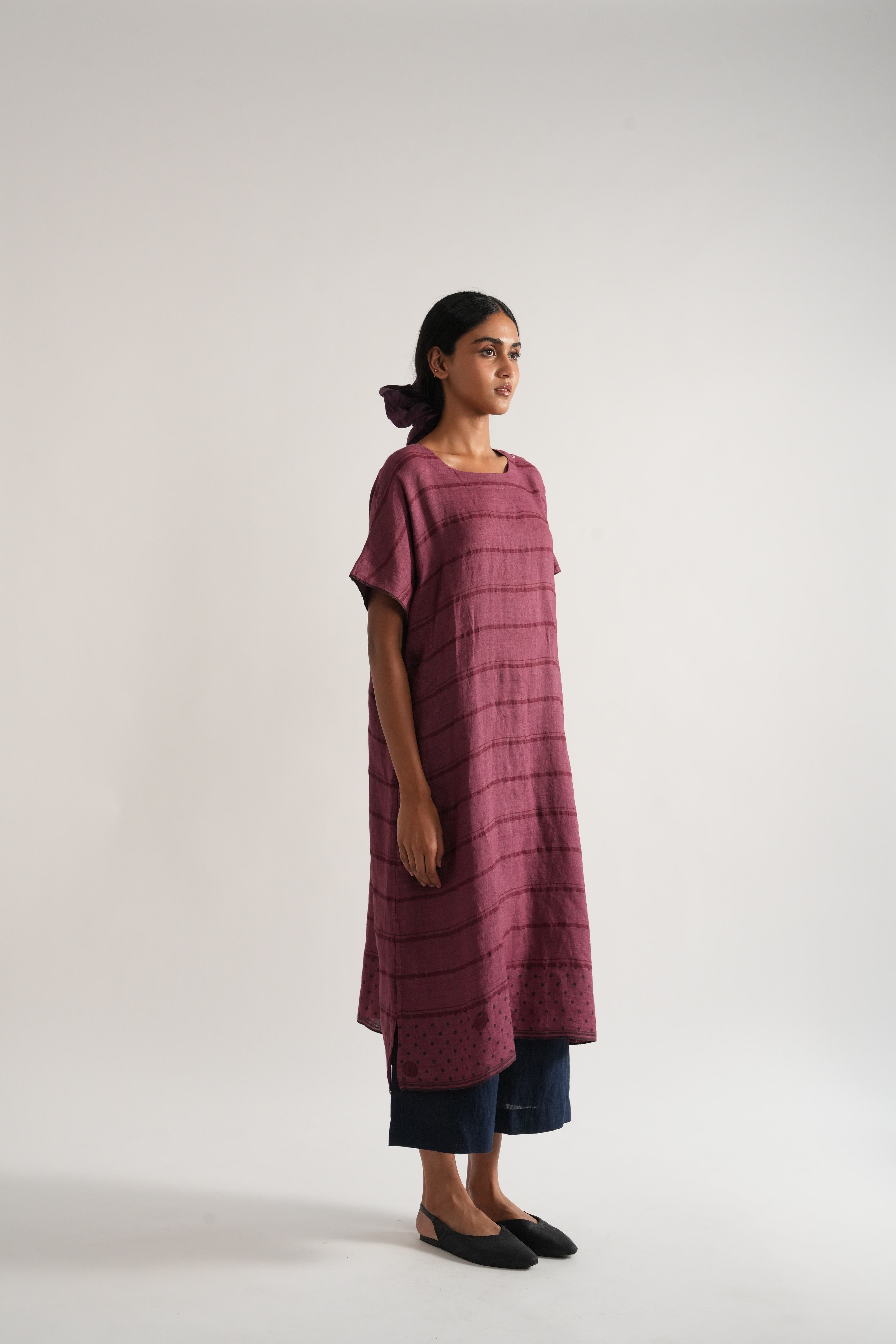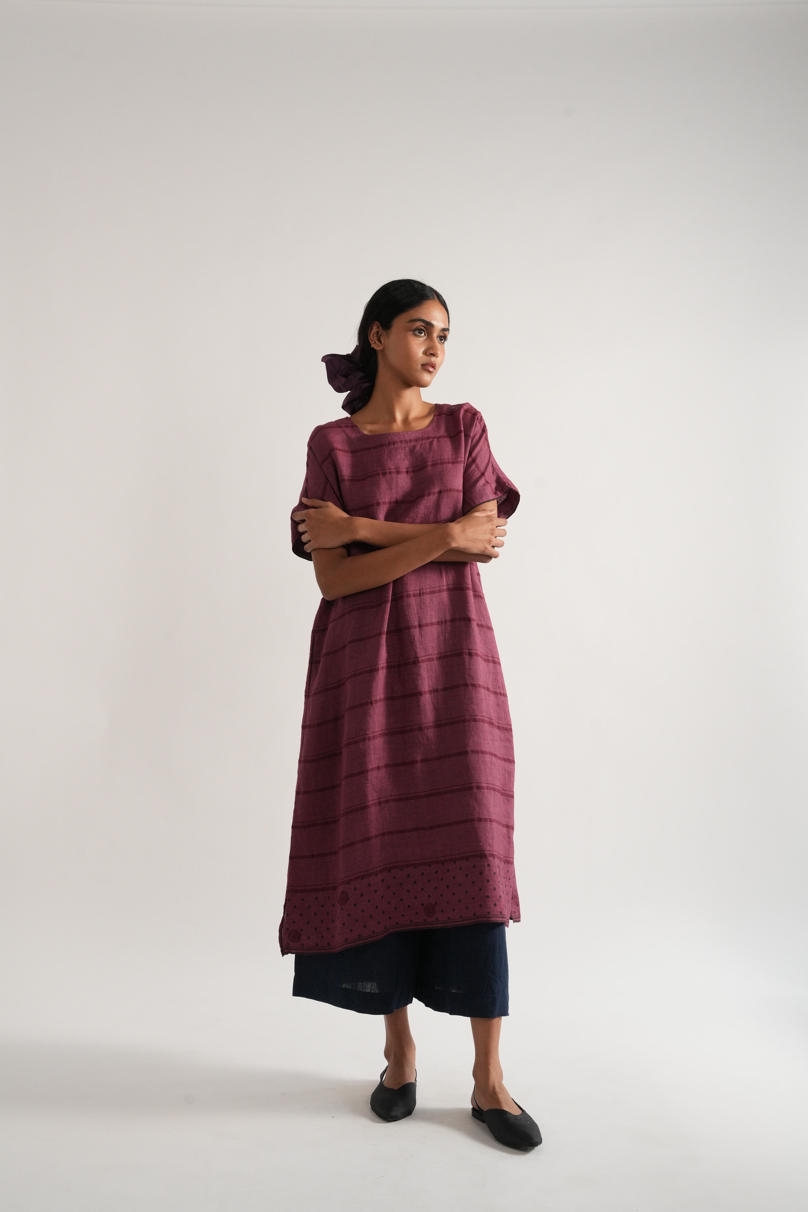 Relaxed fit tunic dress in handwoven yarn dye comes with handwoven striped straight fit pants