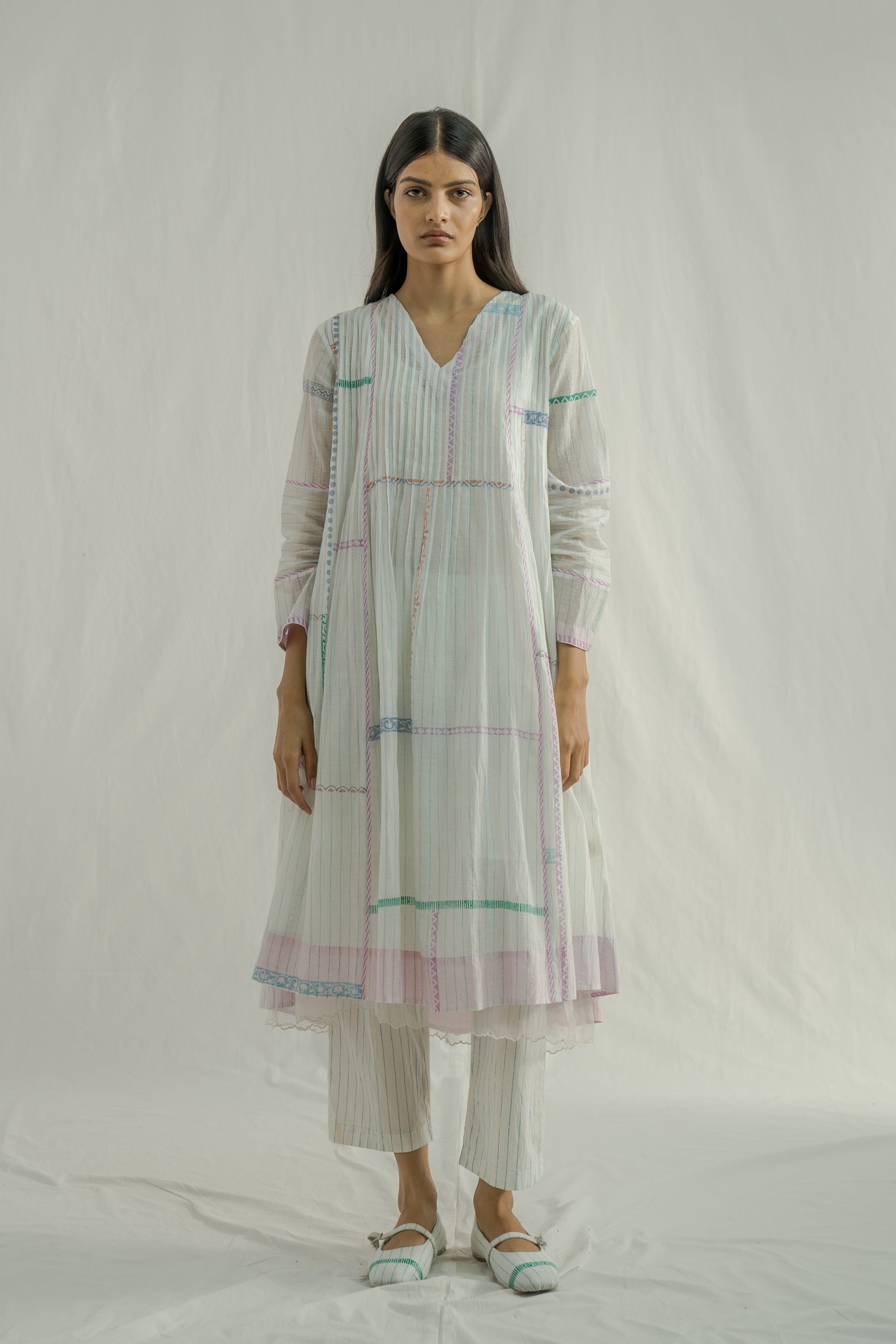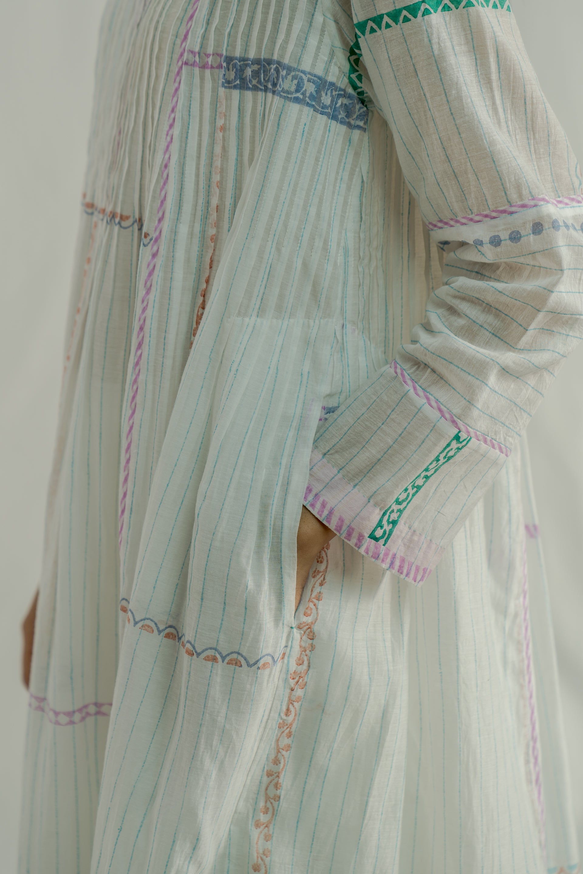 V-neck semi-fitted midi-length dress all-over bust pintuck details, cut in a flattering princess seam. Crafted from a white base with blue pinstripes and a multicolor grid hand-block print, the dress is finished with hand-block printed binding along the seam-lines. It comes paired with a set of hand-block printed pinstriped straight-fit pants.