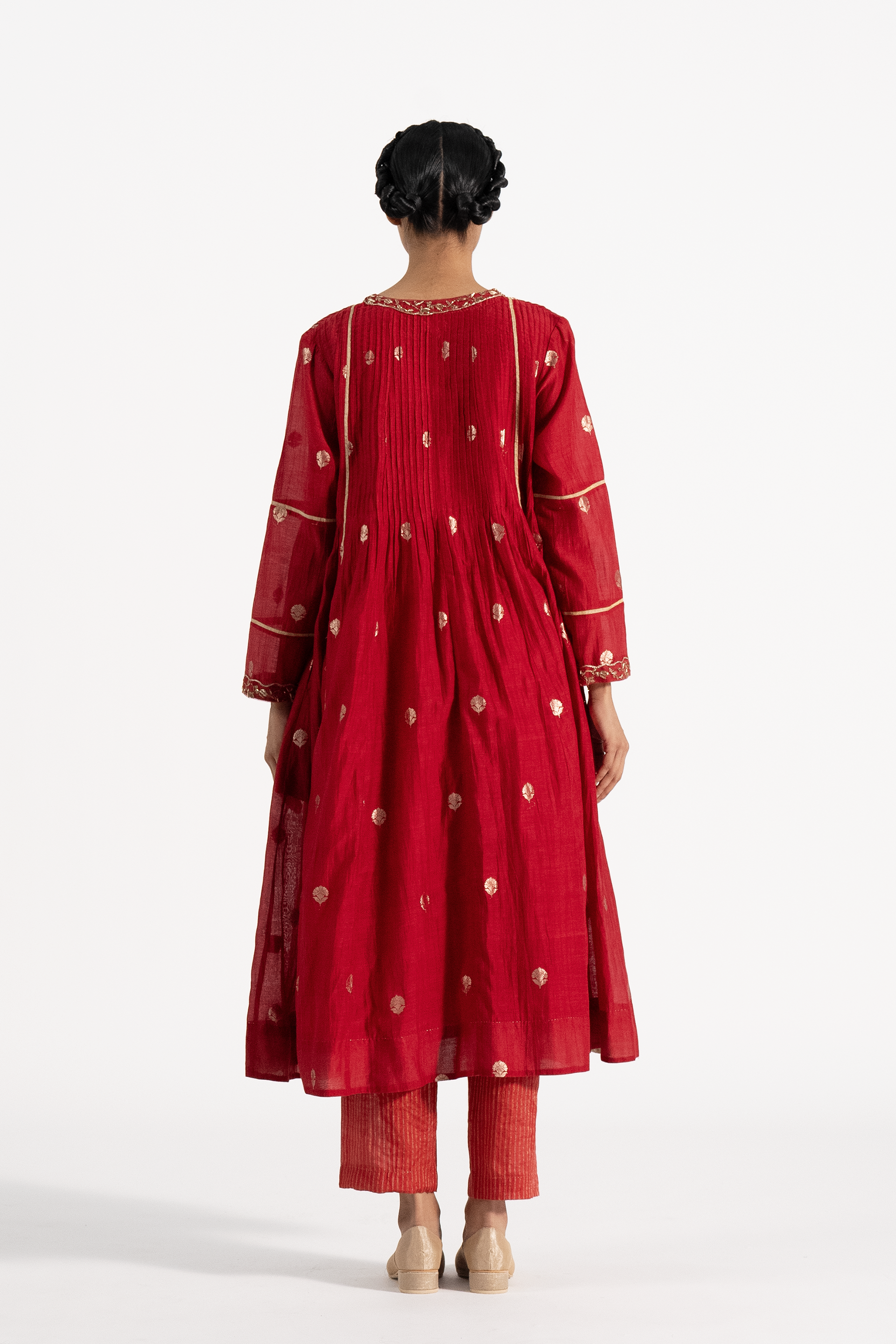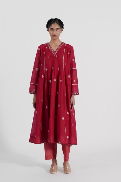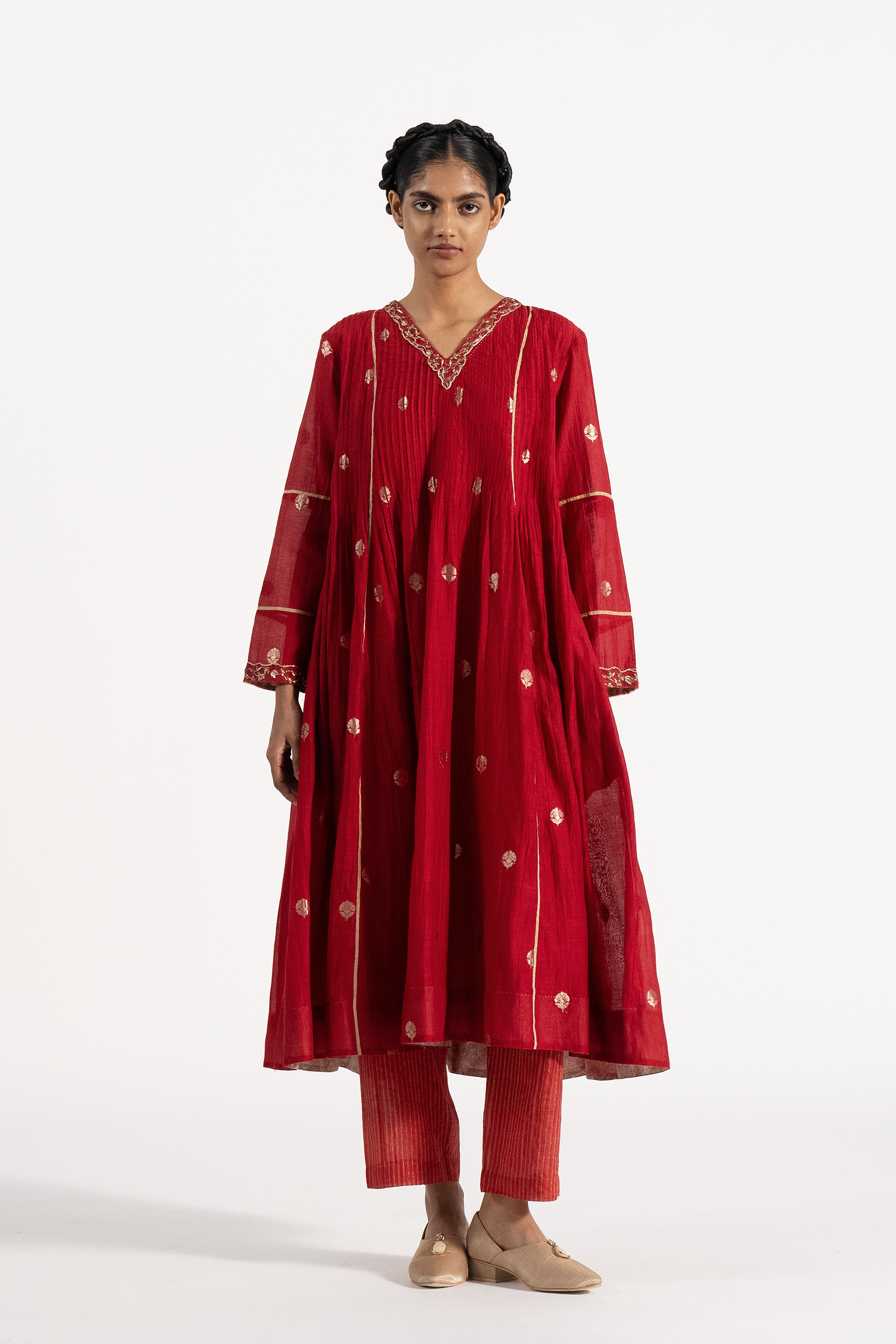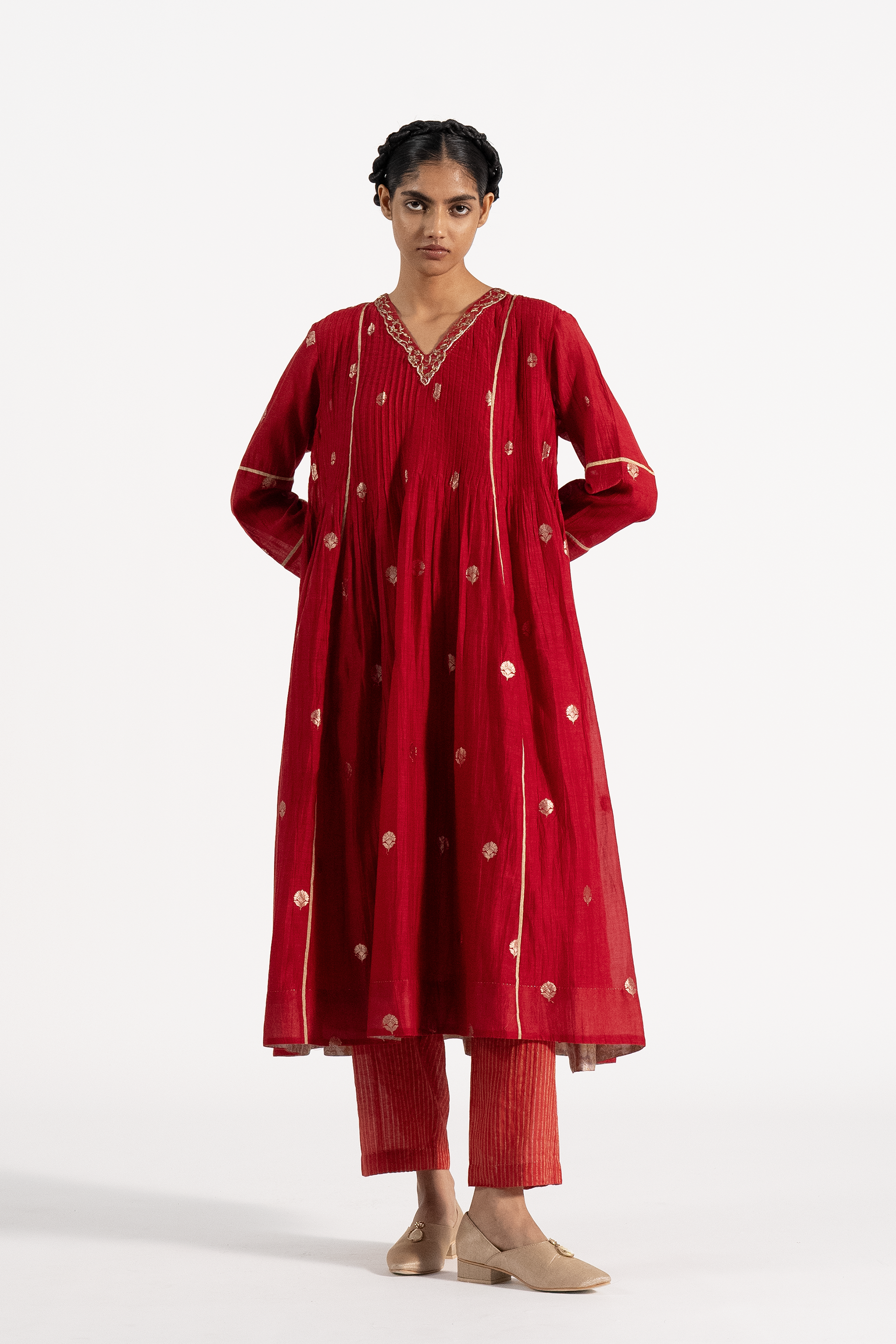 V Neck Semi Fitted Flared Midi Dress With All Over Butti Detail With Hand Embriodered Neckline And Sleeve Detail And Gold Biding. Comes With A Separate Cotton Silk Lining