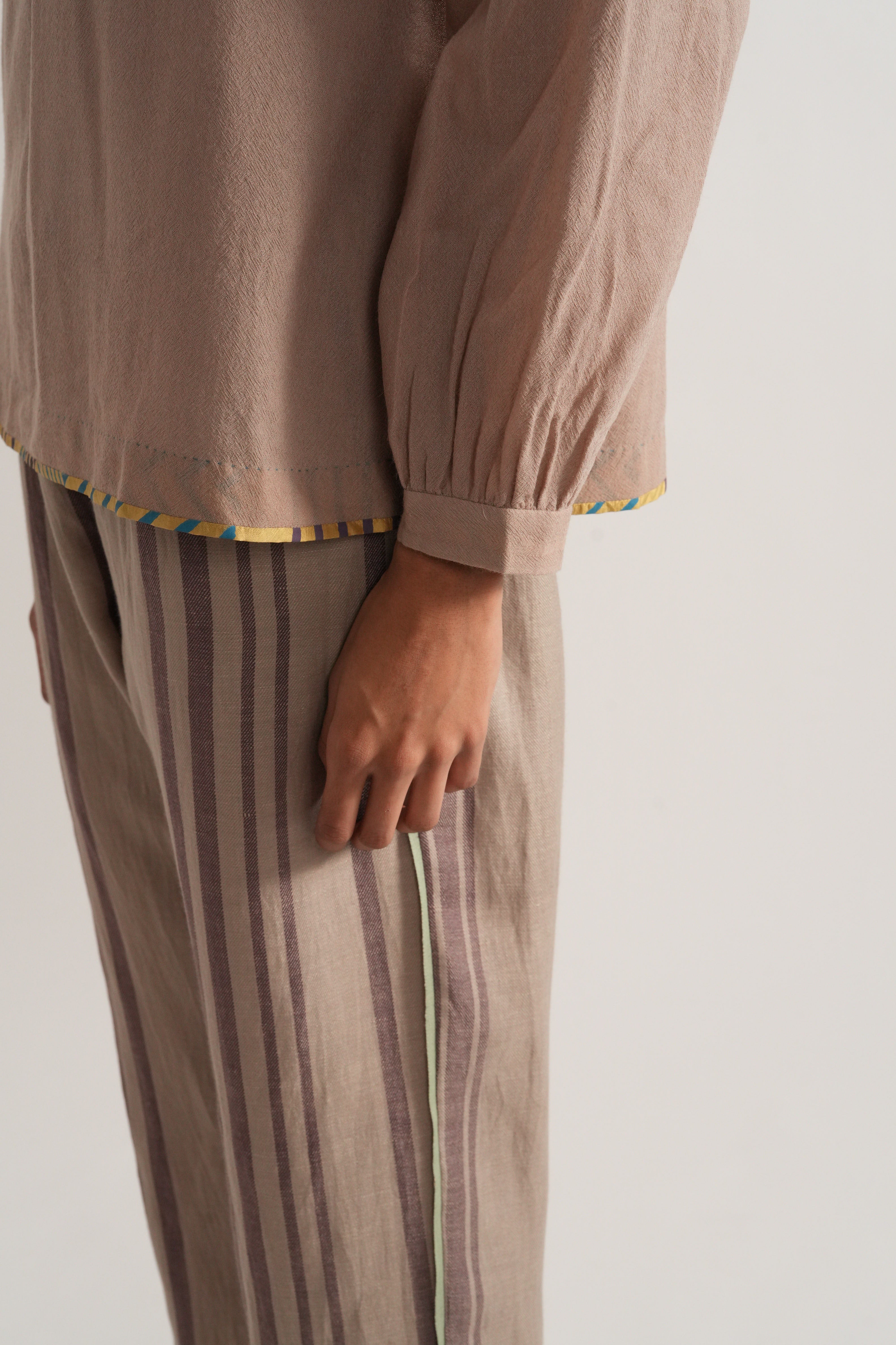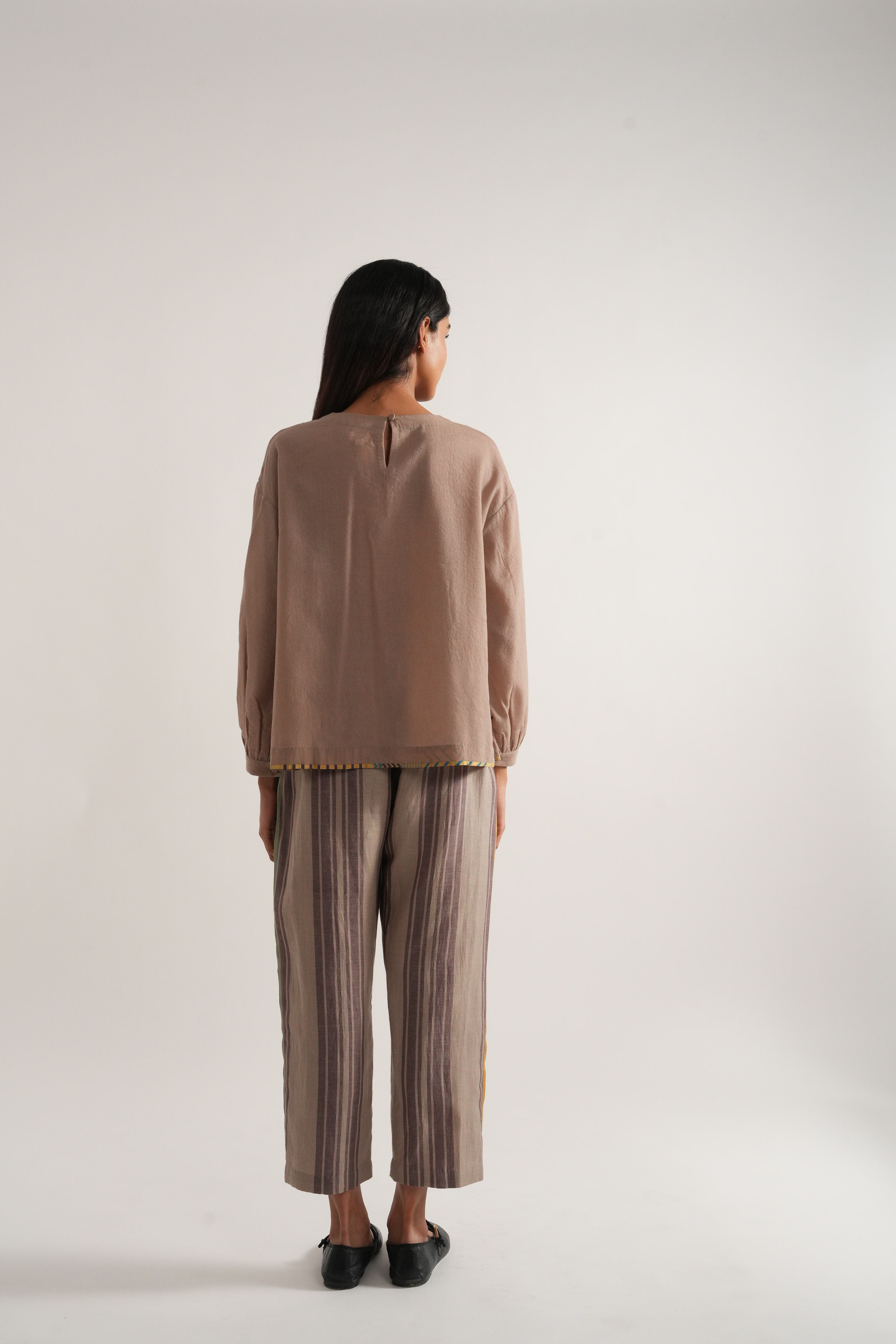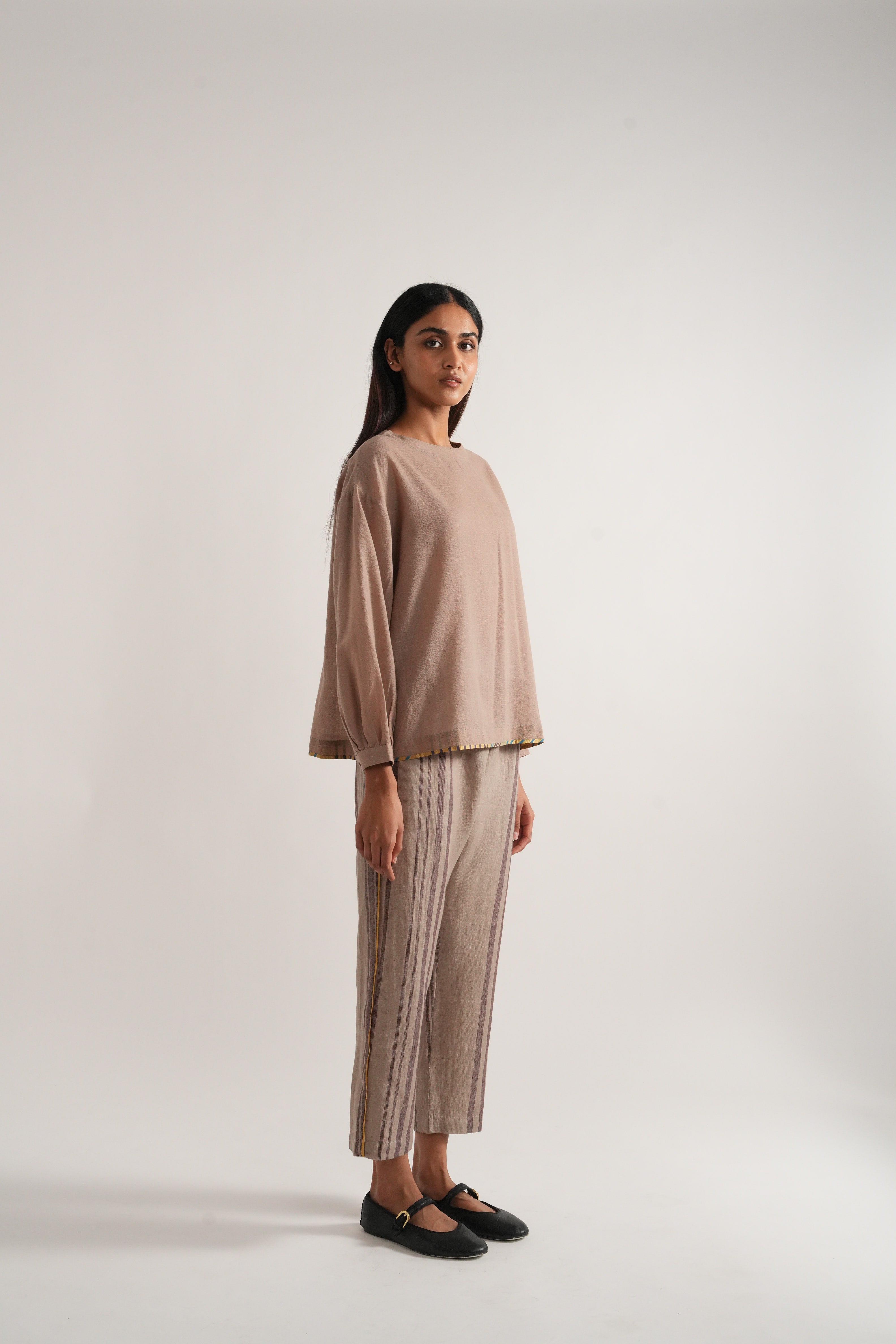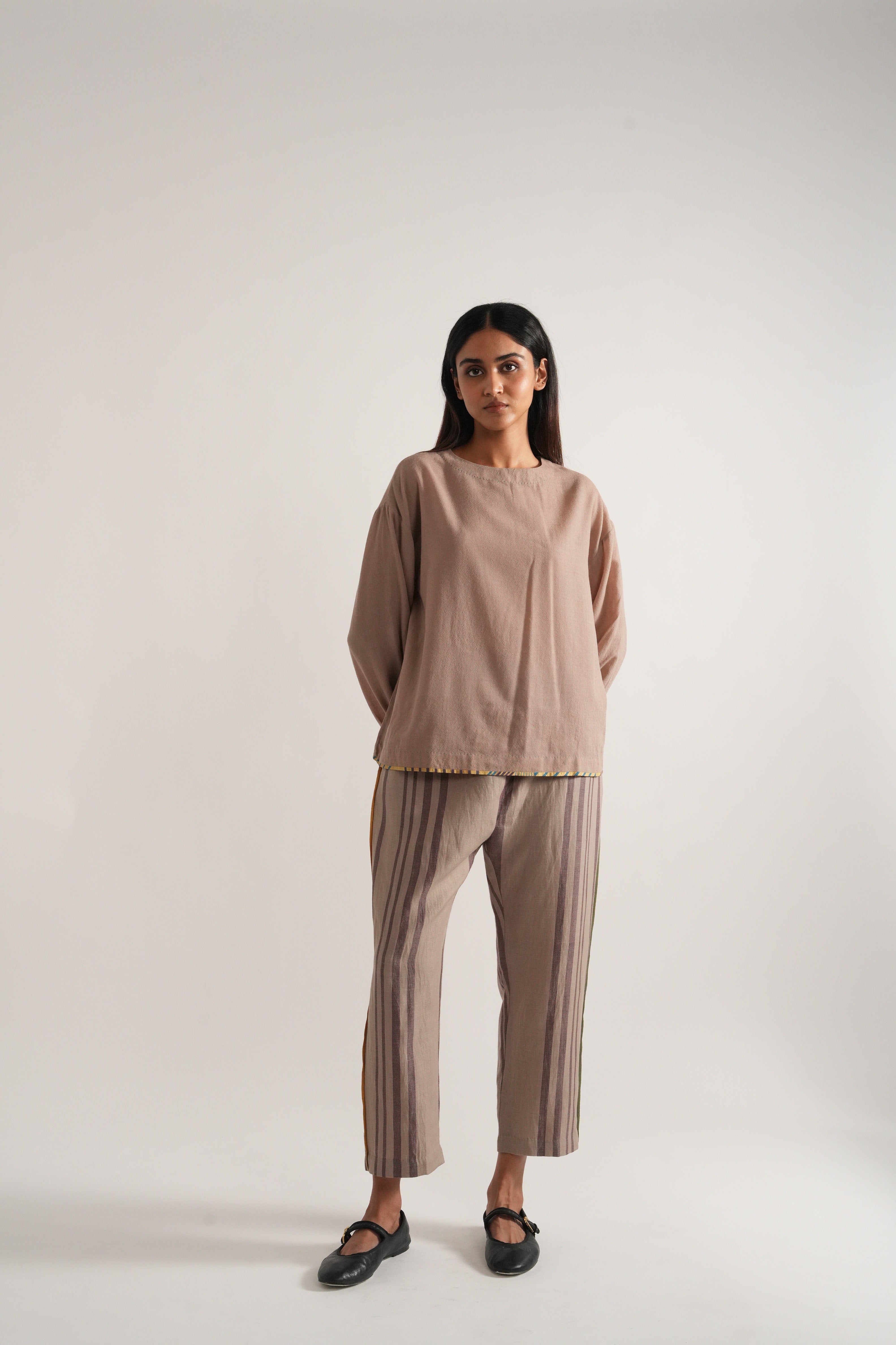 Relaxed fit round neckline drop shoulder top in wool with hand block printed multicolor binding detail comes with a pair of straight fit striped pants