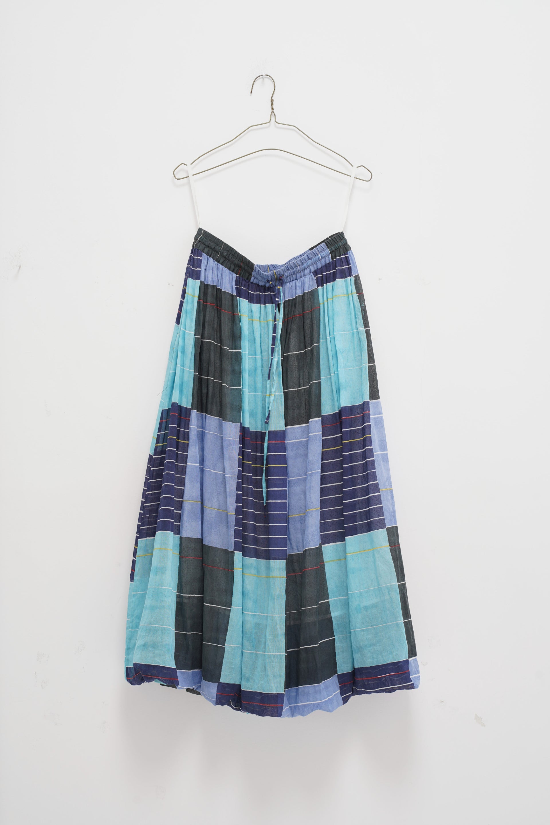 This balloon-fitted skirt showcases a collage hand-block print mix. It features an elastic waistband with a tie-up, side pockets, and an attached hand-block printed cotton silk lining.