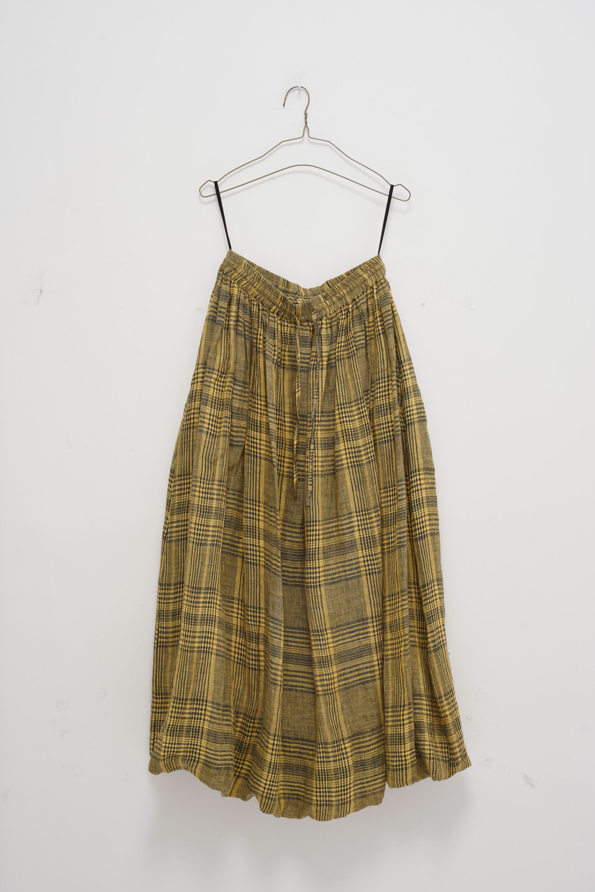This balloon-fitted skirt is crafted from handwoven checkered fabric. It features an elastic waistband with a tie-up, side pockets, and an attached hand-block printed cotton silk lining.
