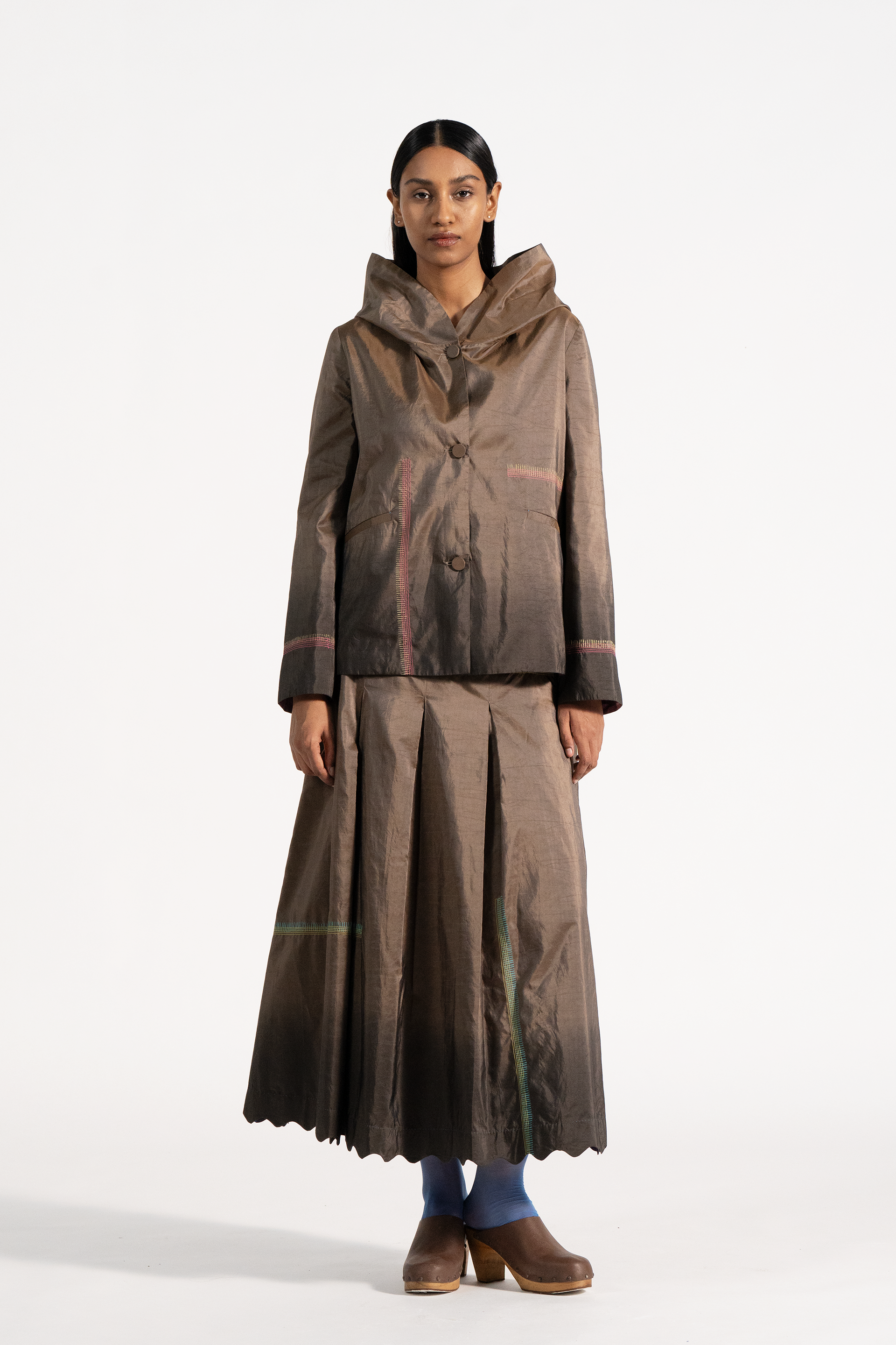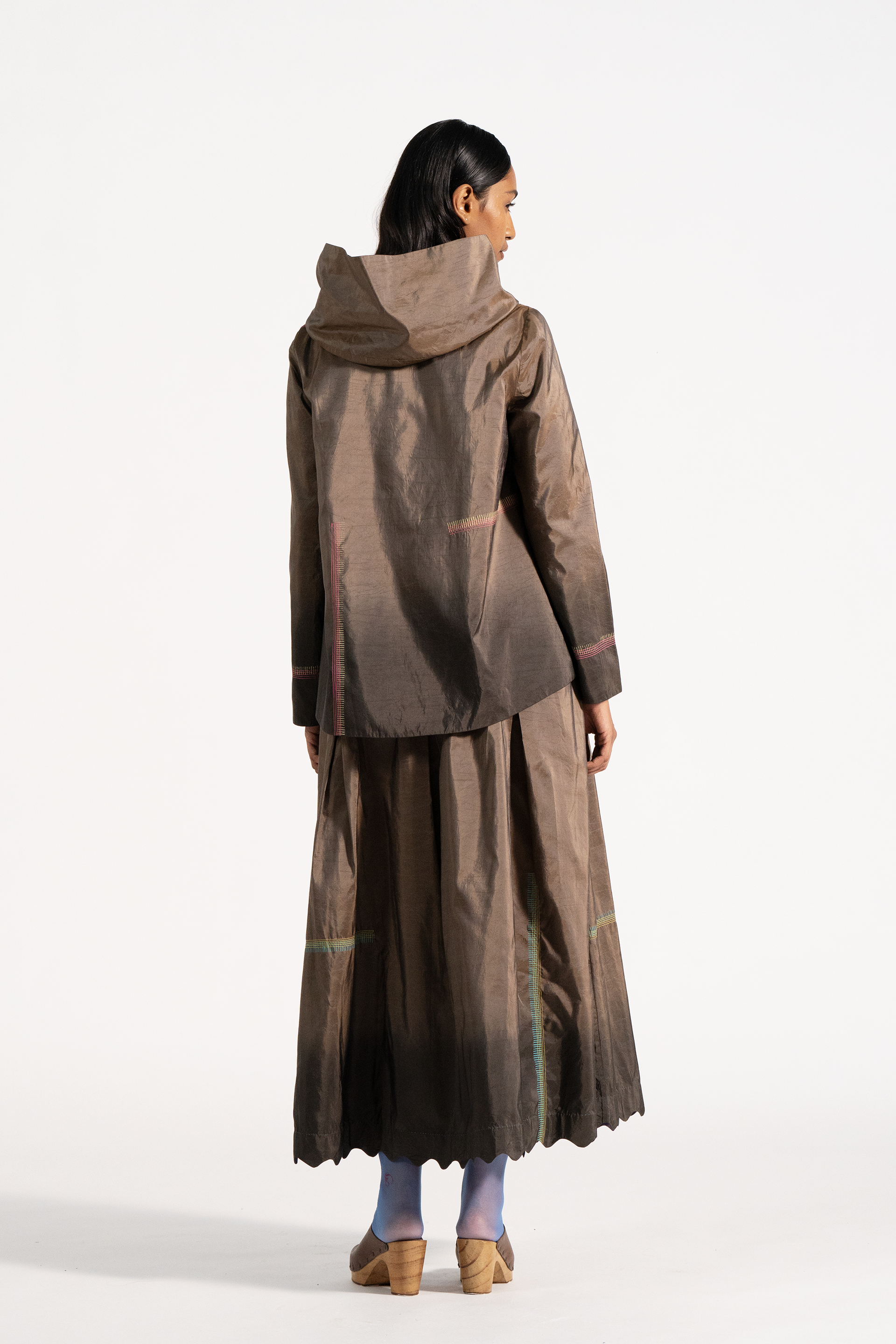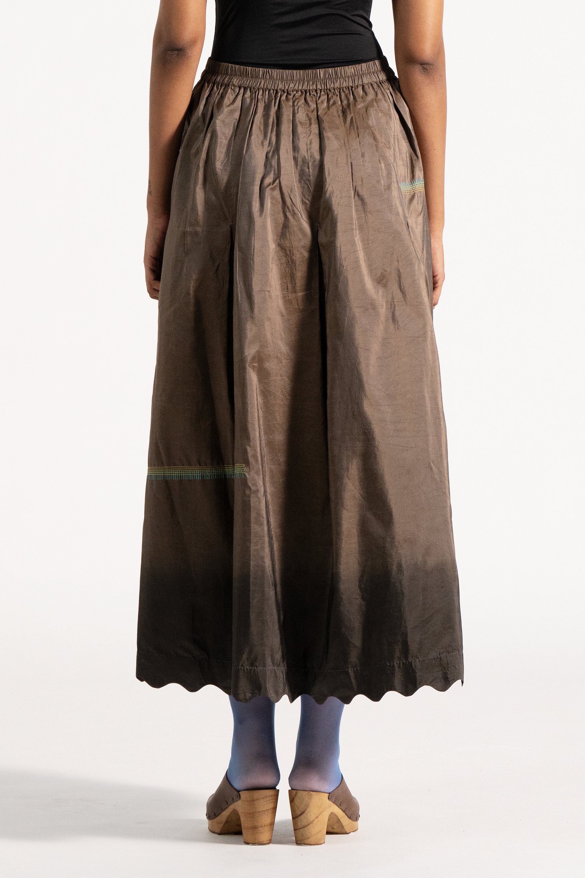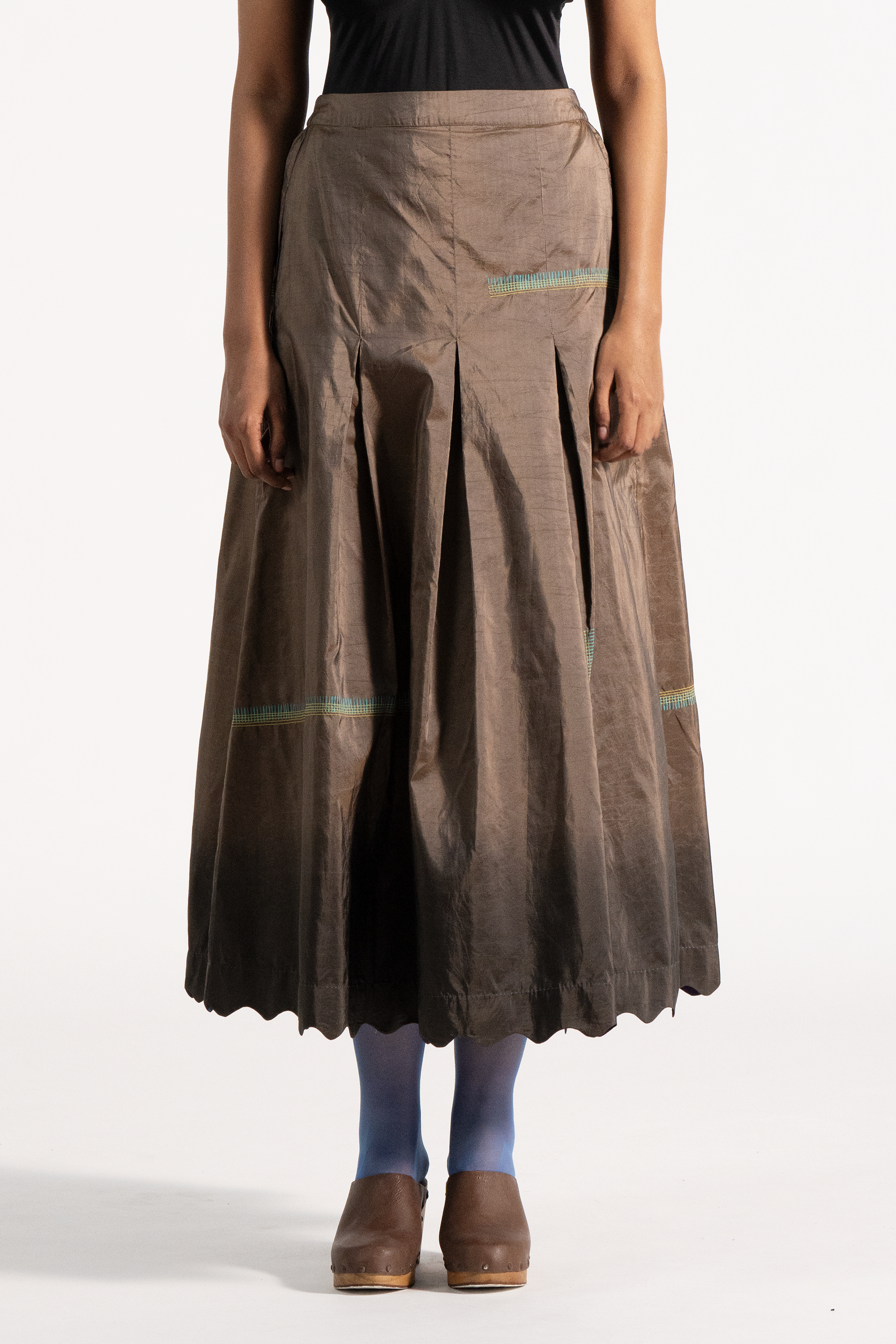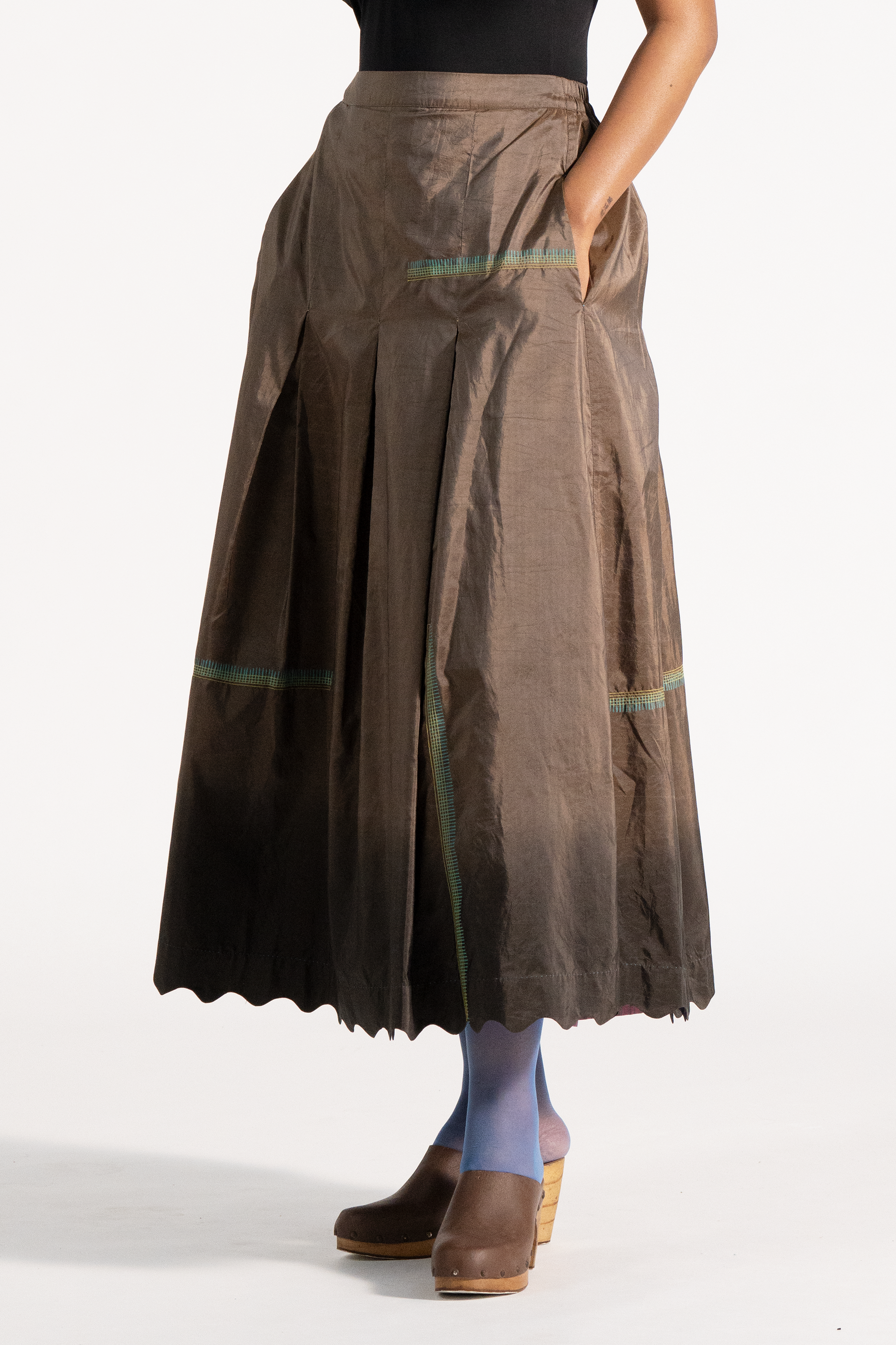 High Waisted Maxi Length Skirt With Scallop Detail On Hem In Multi Handblock Print And Stitch Placement On Ombre Dye In 100% Silk Tafetta.
