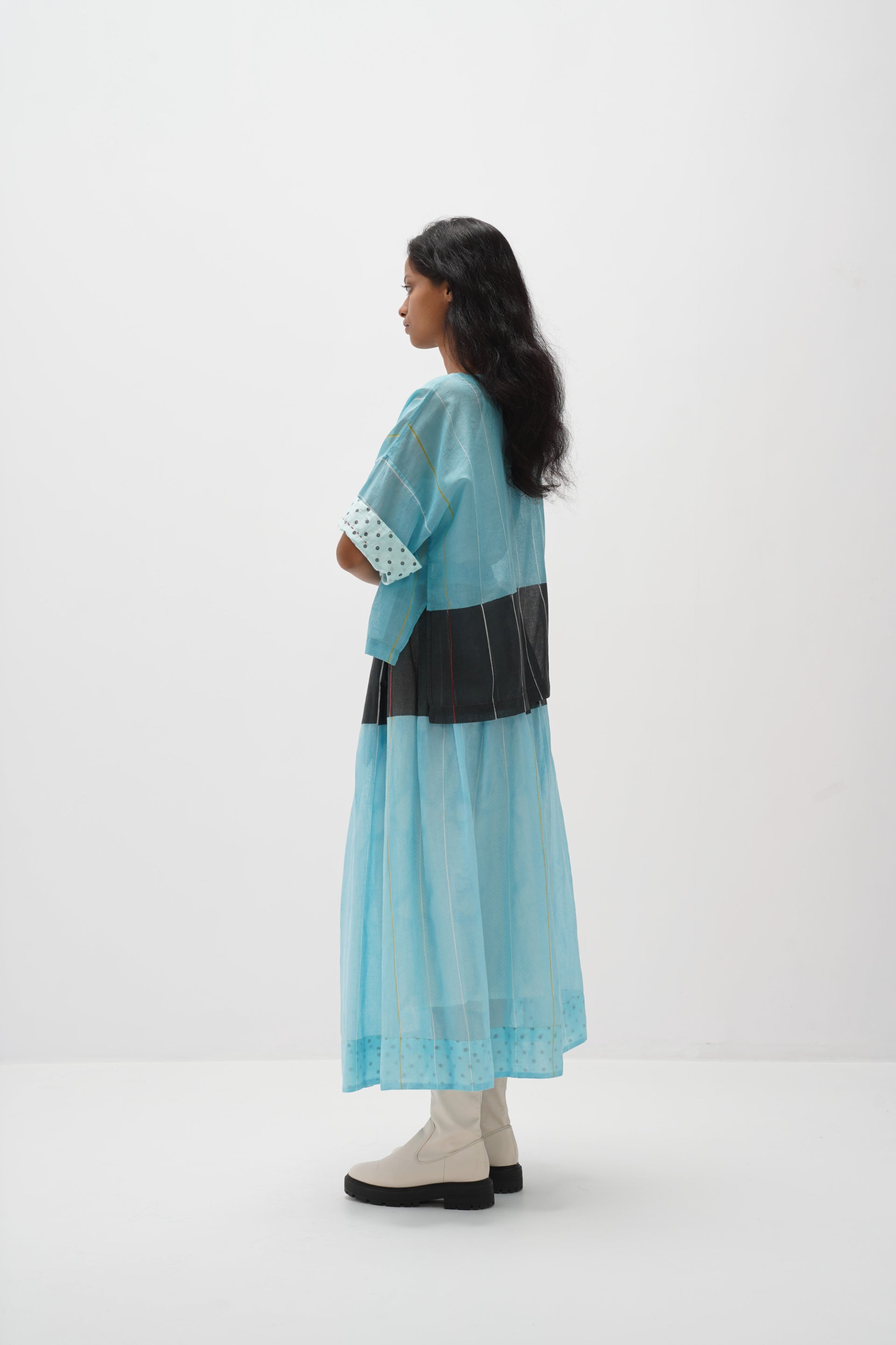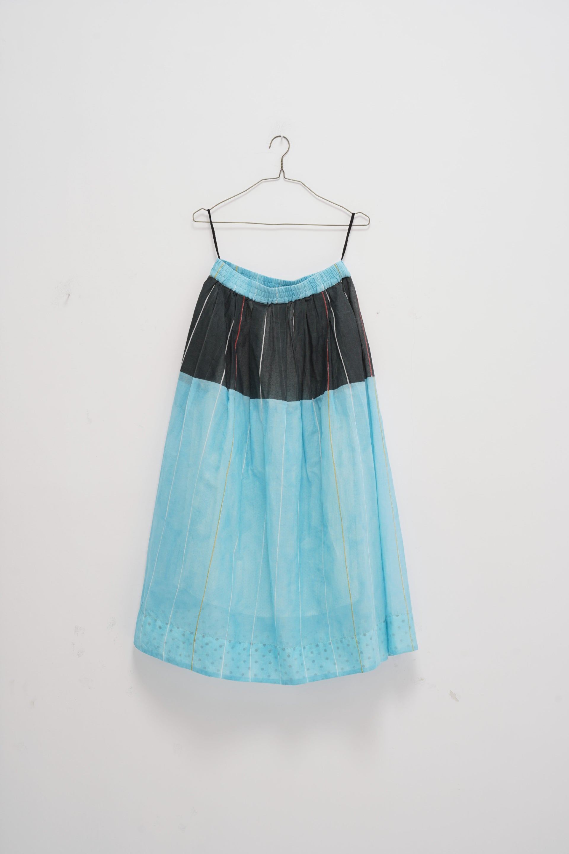 Skirt featuring a hand block stripe print with contrasting charcoal panel print. It comes with an attached cotton silk lining, an elastic waistband, side pockets, and is finished with hand-blocked polka dot cotton silk facing.