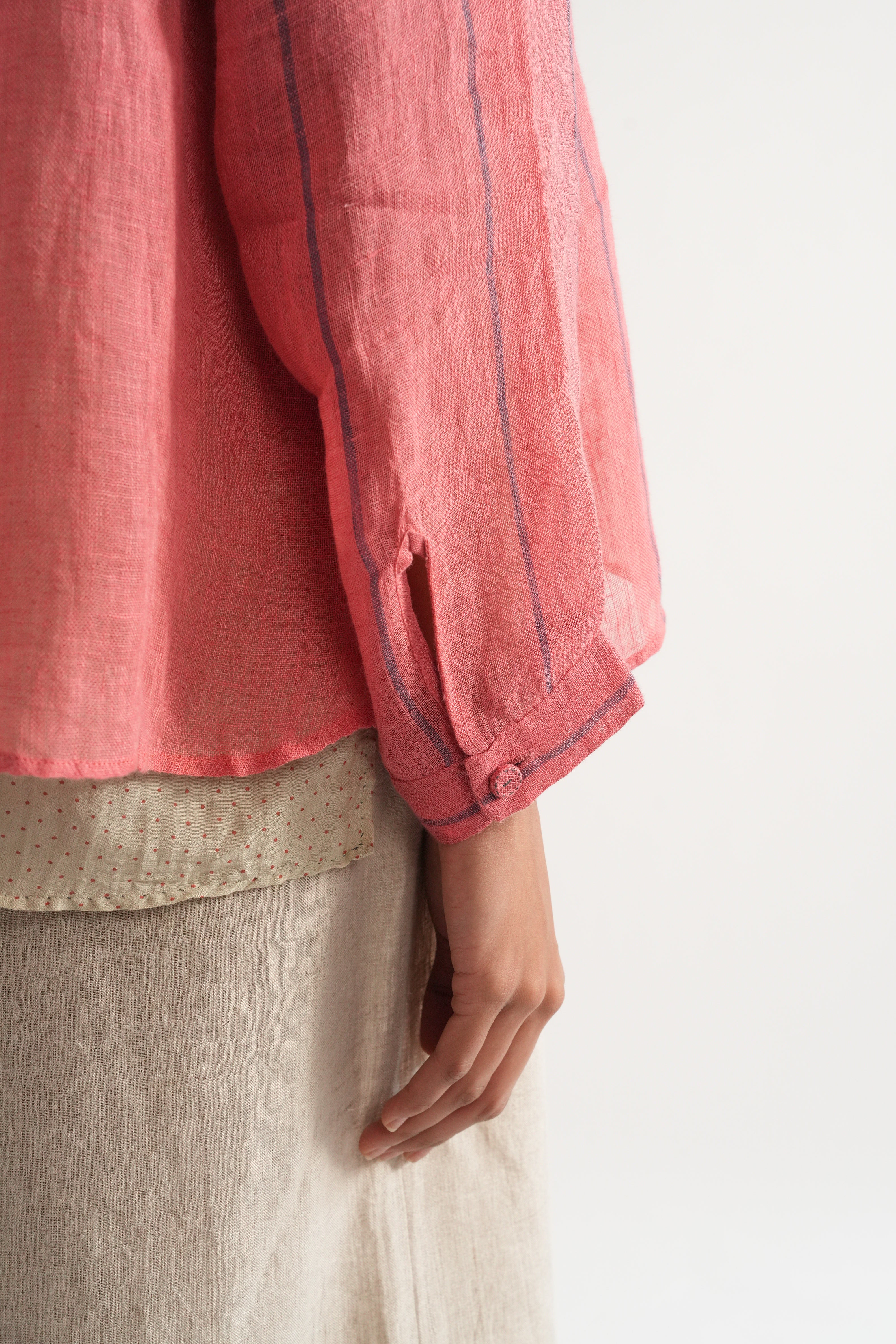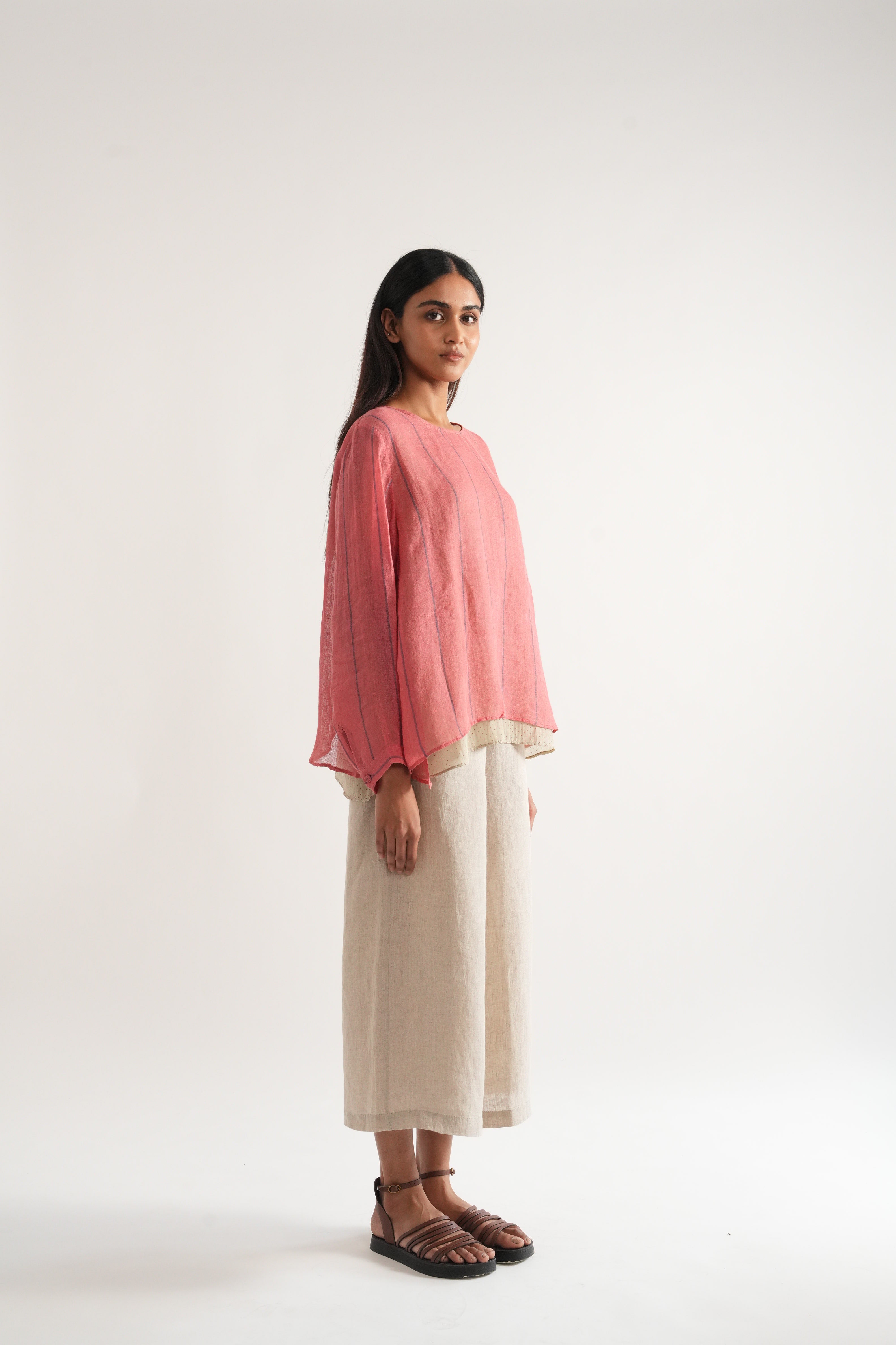 Round neck top with back panel overlap in handwoven linen gauze stripes and hand block printed attached lining