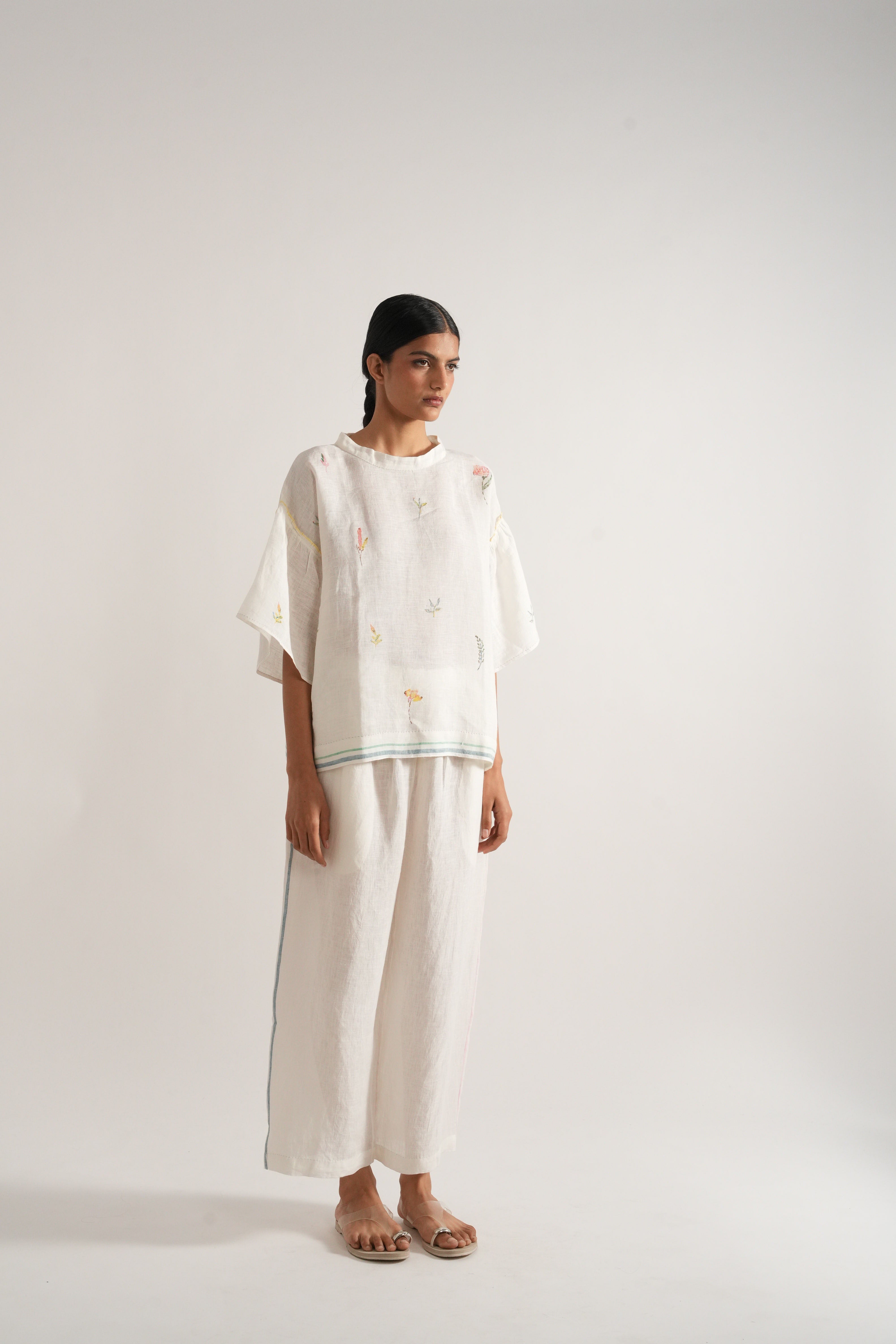 Flared bell sleeves summer top in hand block placement print handwoven linen