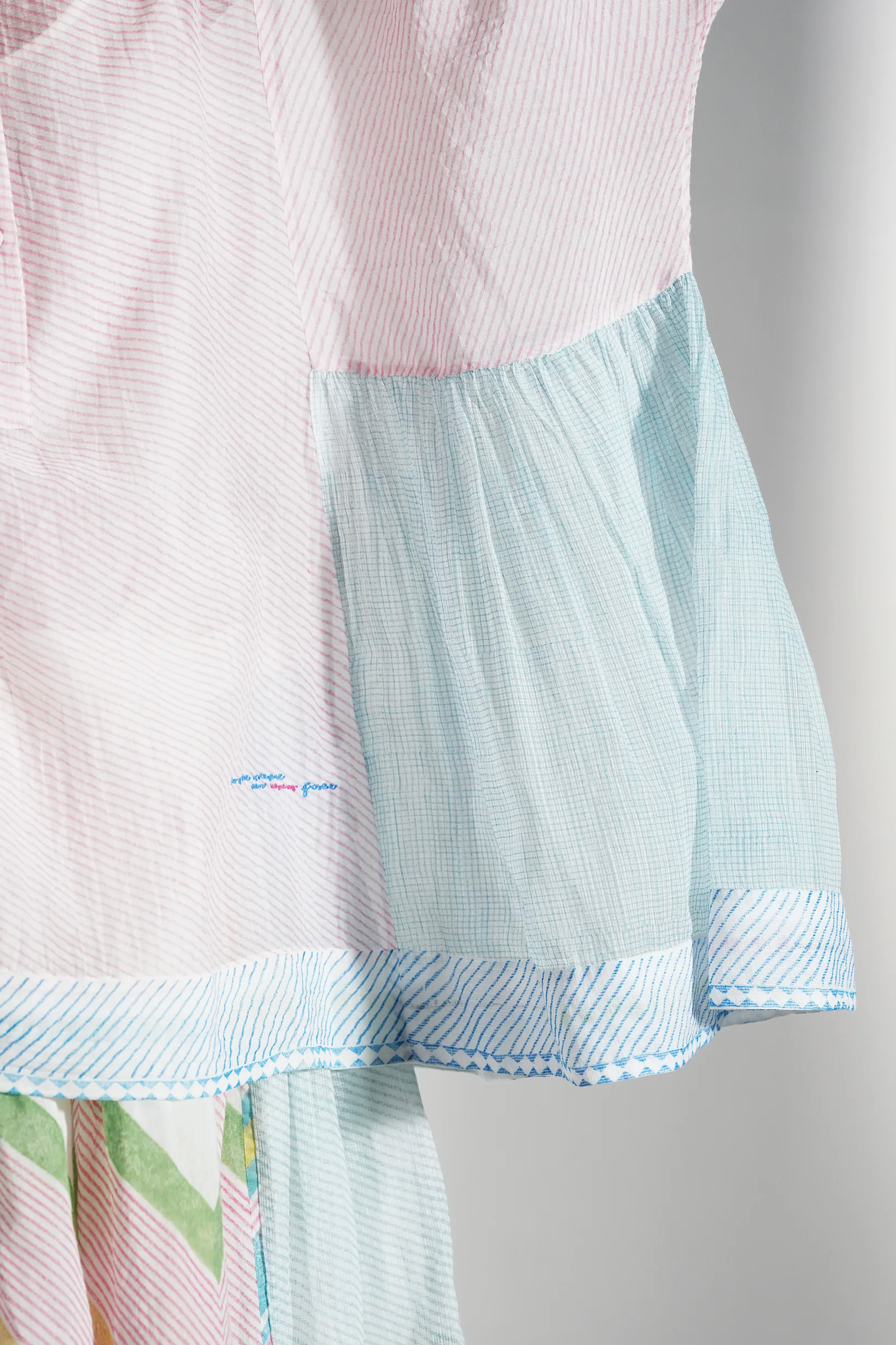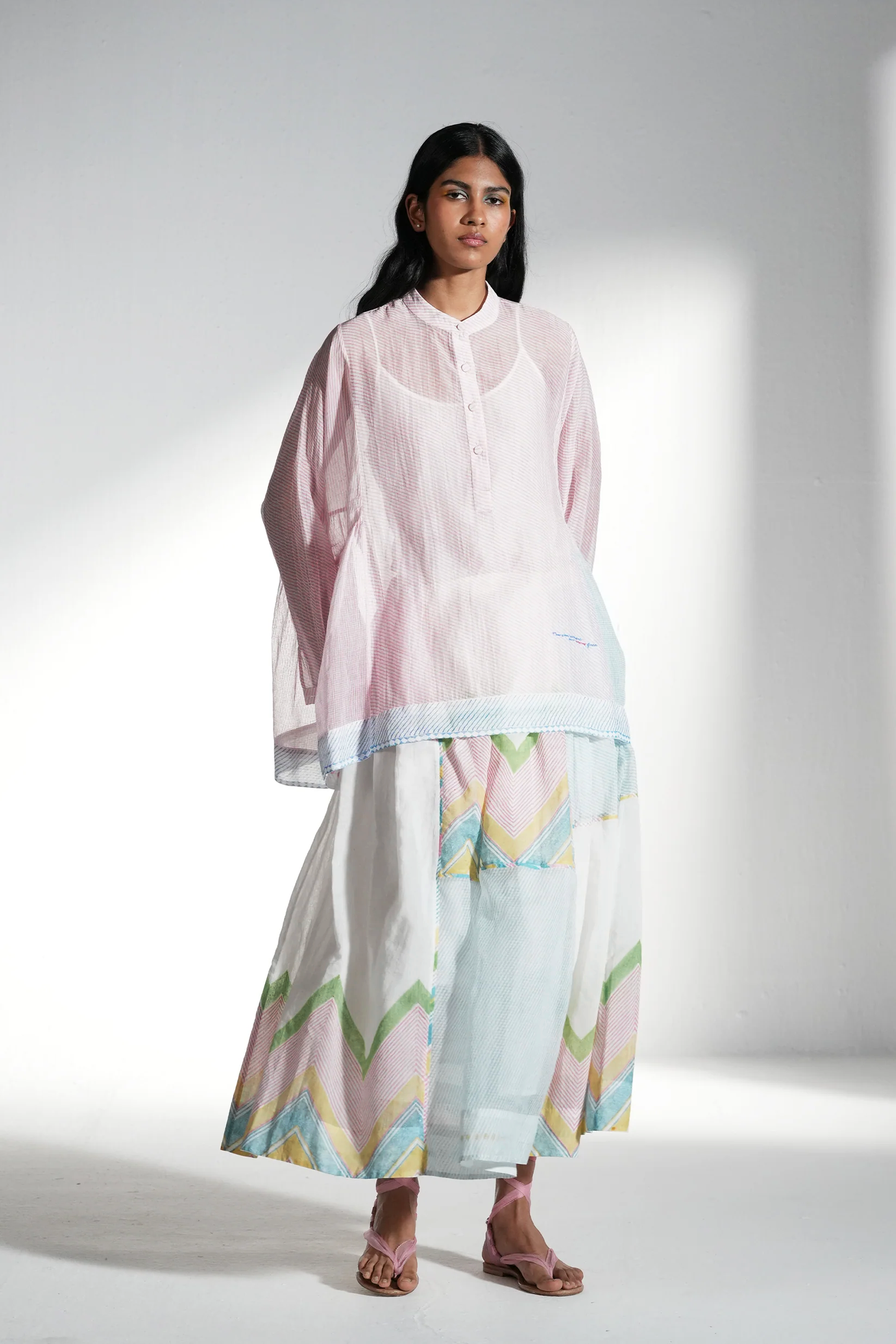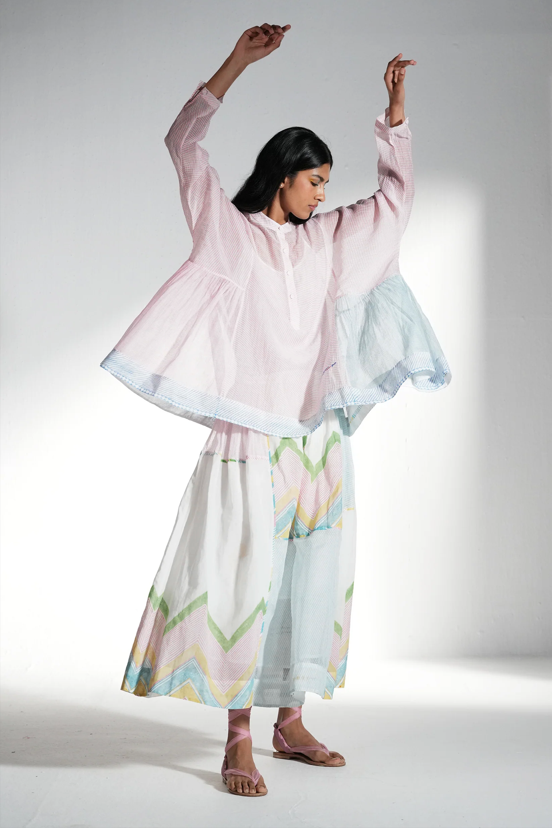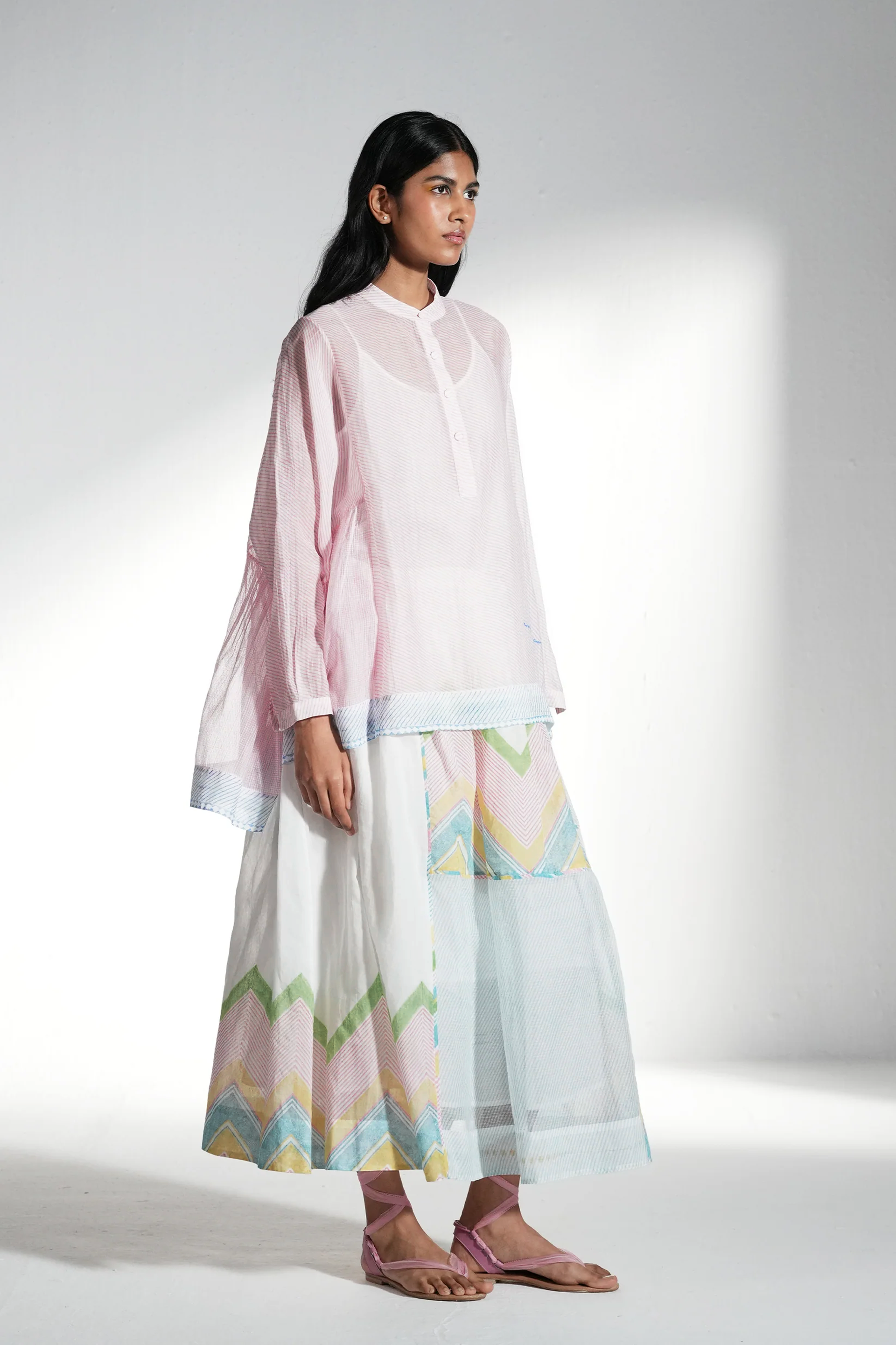 Relaxed fit front placket top in multi hand block print and contrasting binding detail. Comes with a complimentary plain lining, without any trims details.