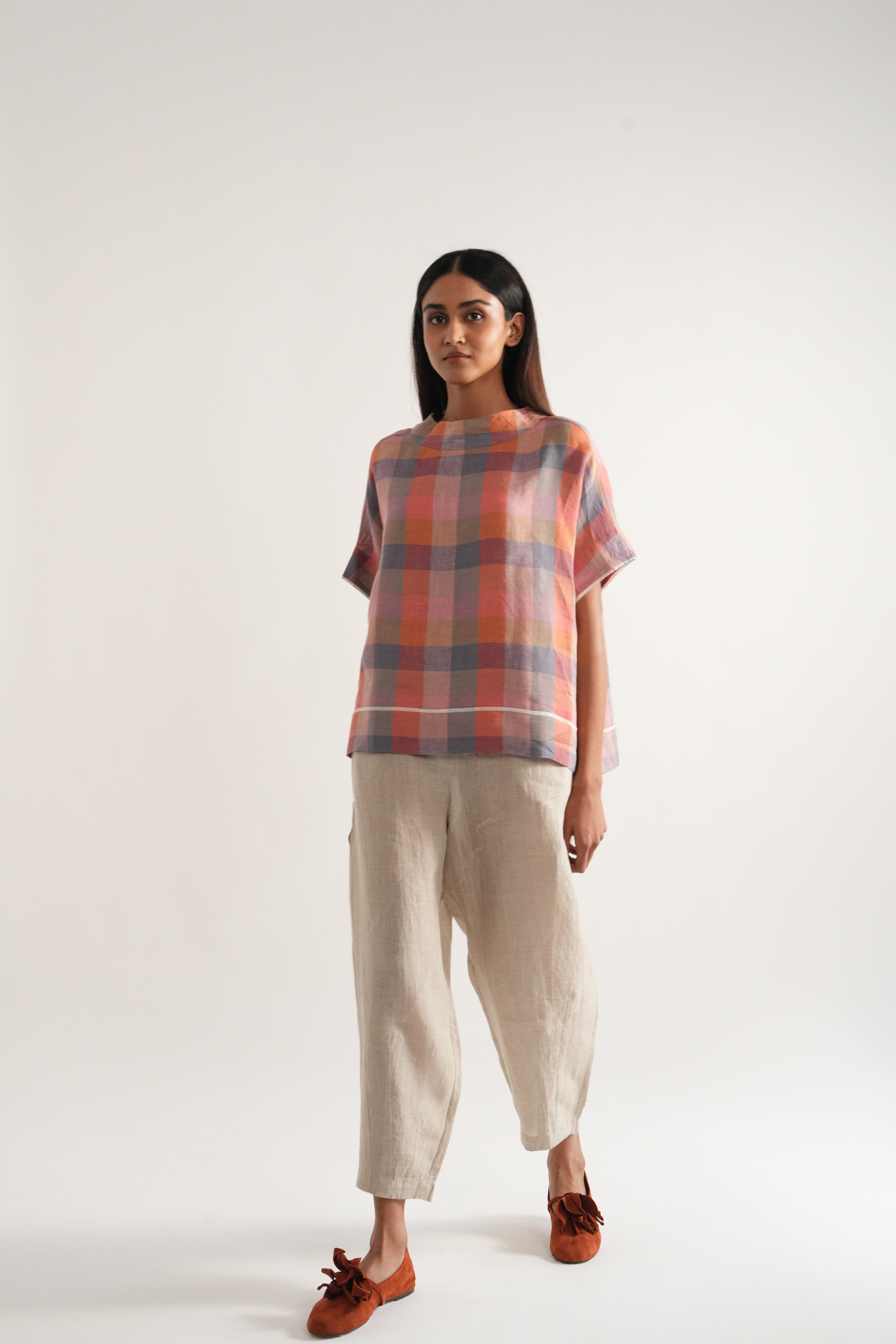 Relaxed fit short summer top in handwoven linen checks with selvage details