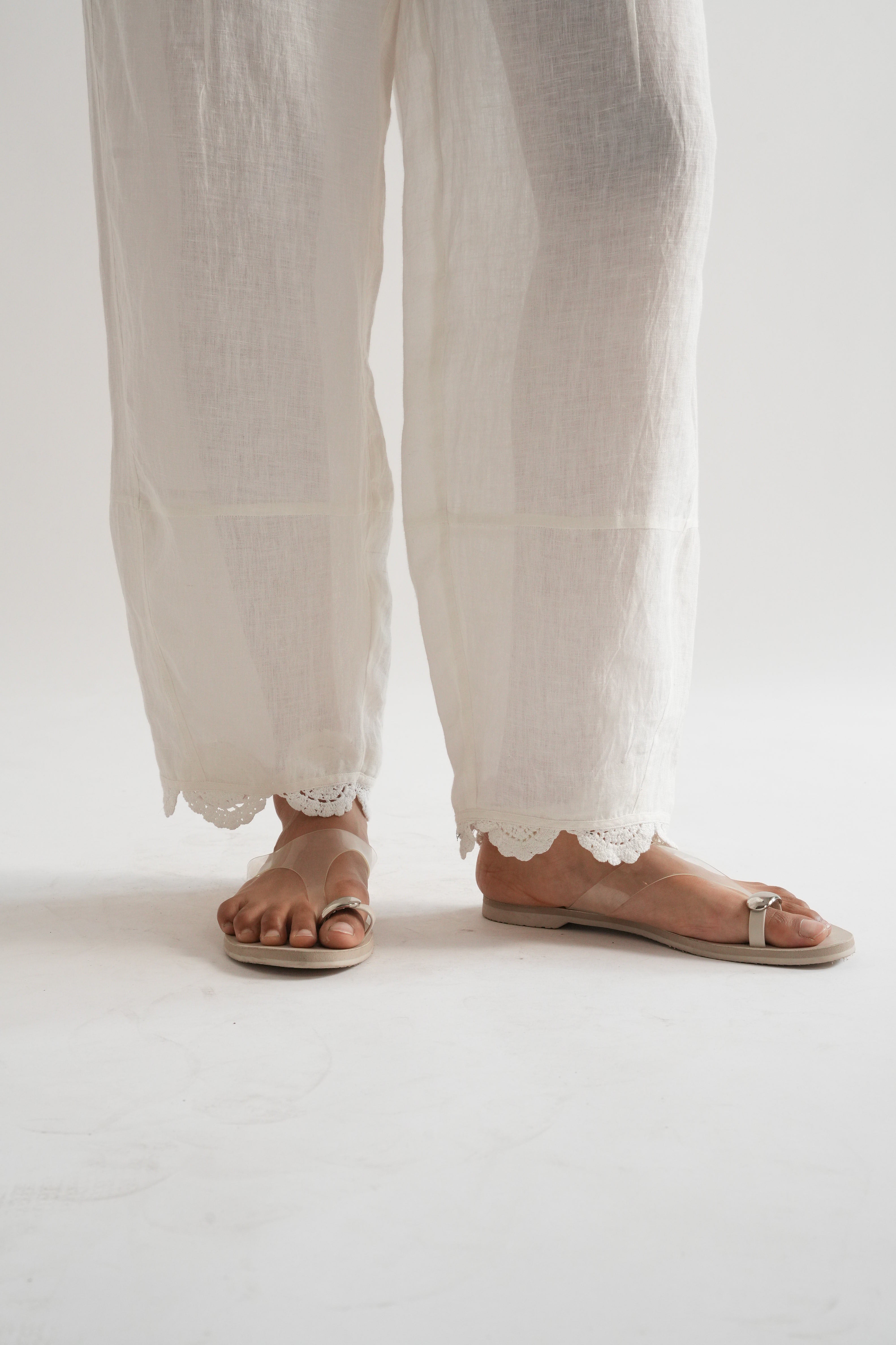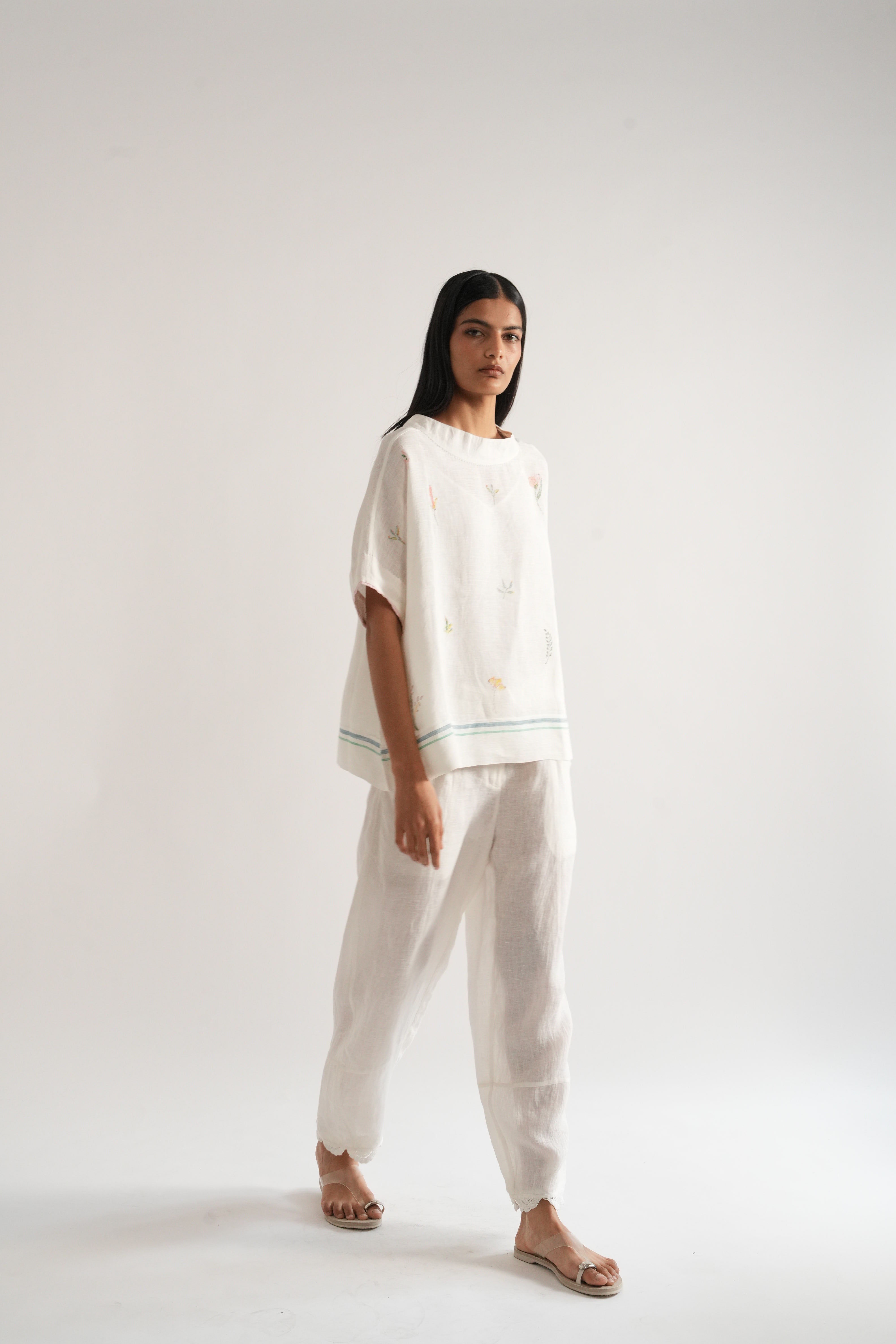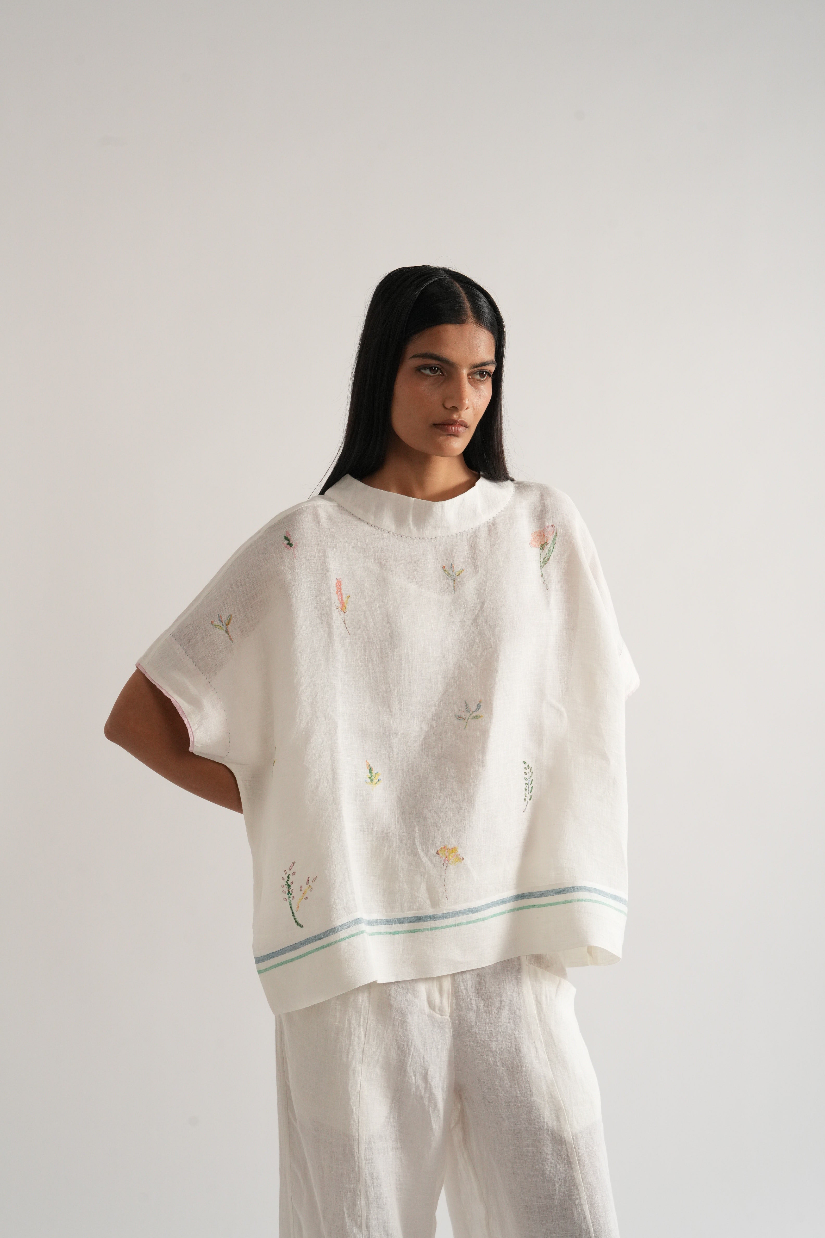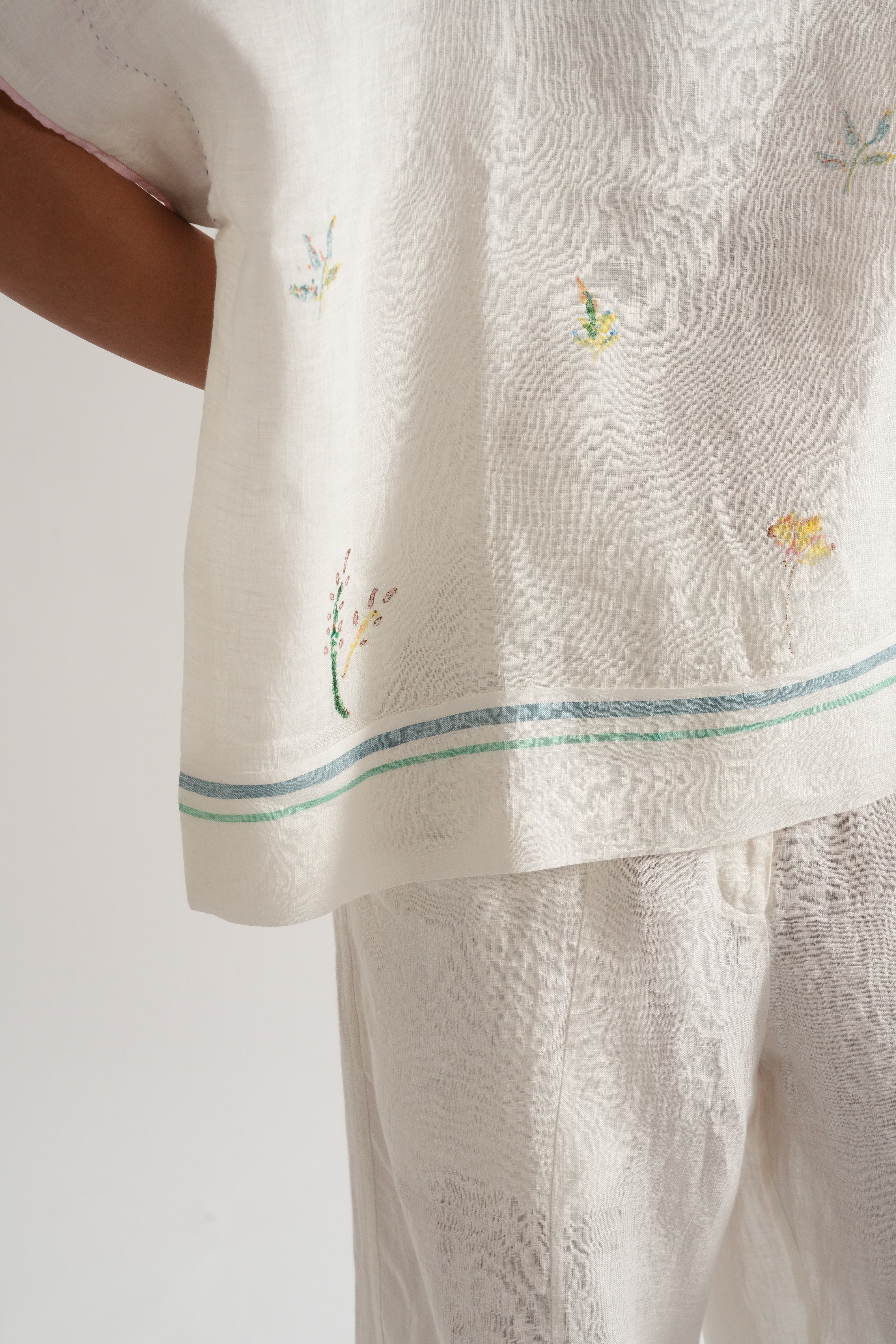 Relaxed fit short summer top in handwoven linen with placement hand block print and selvage details