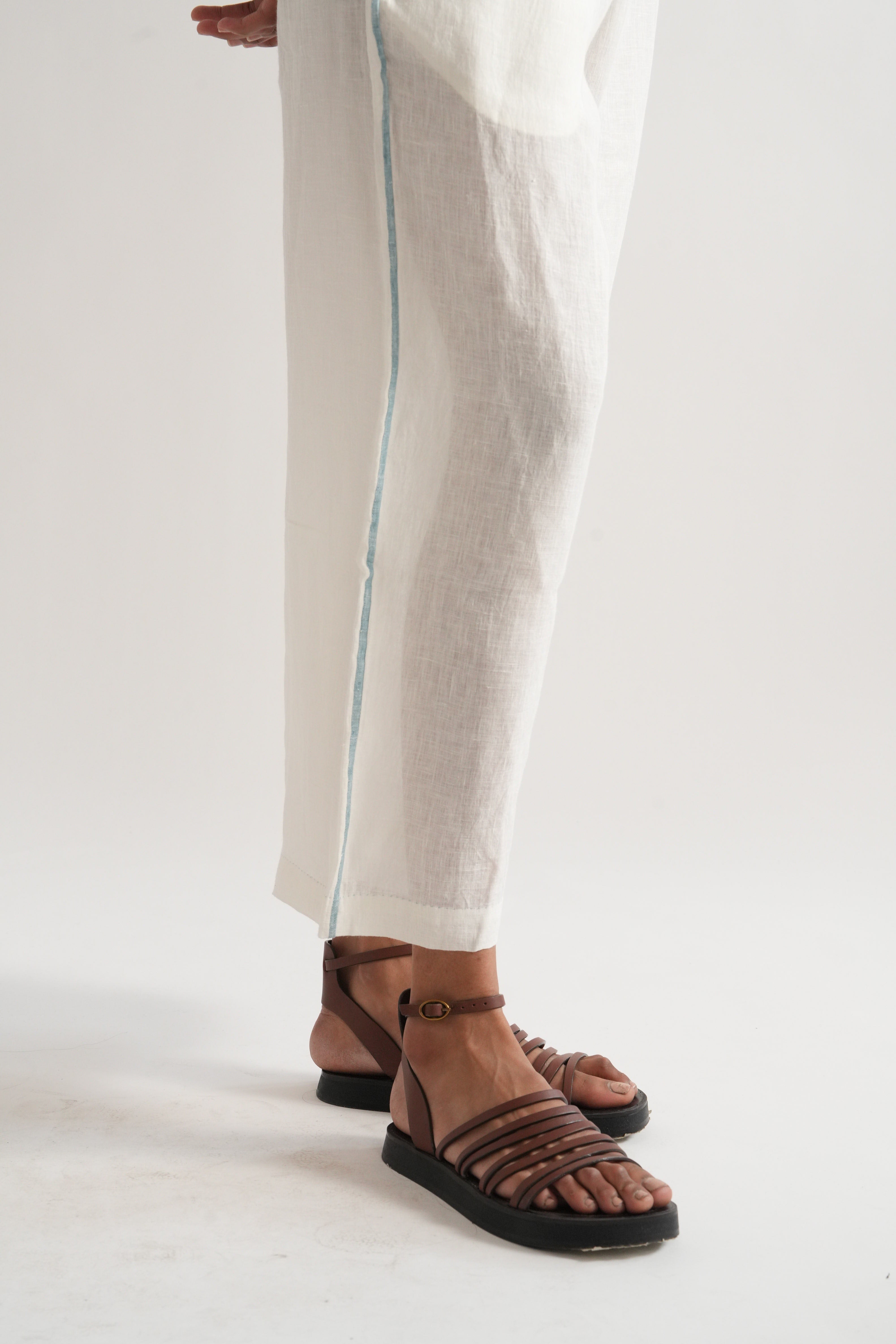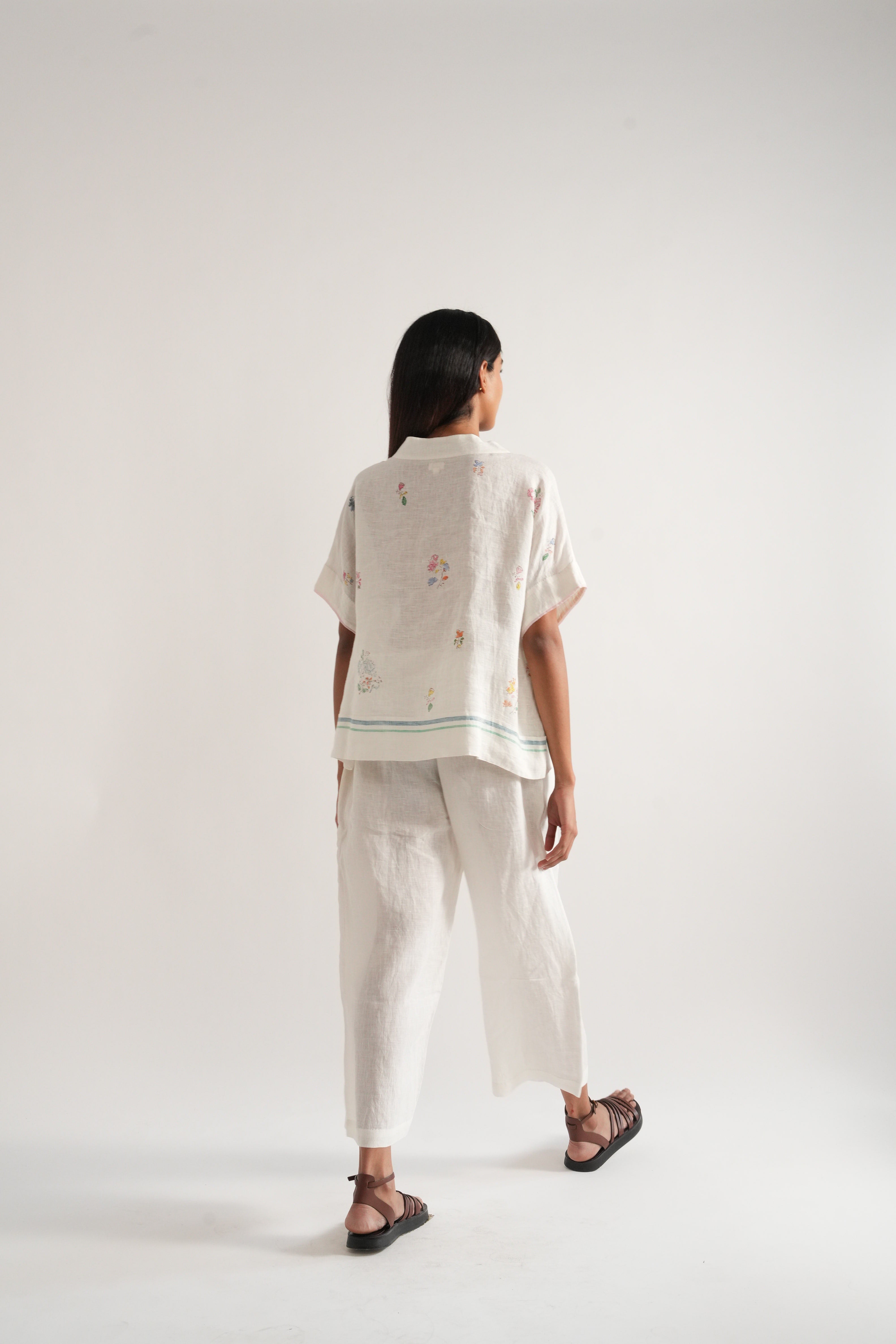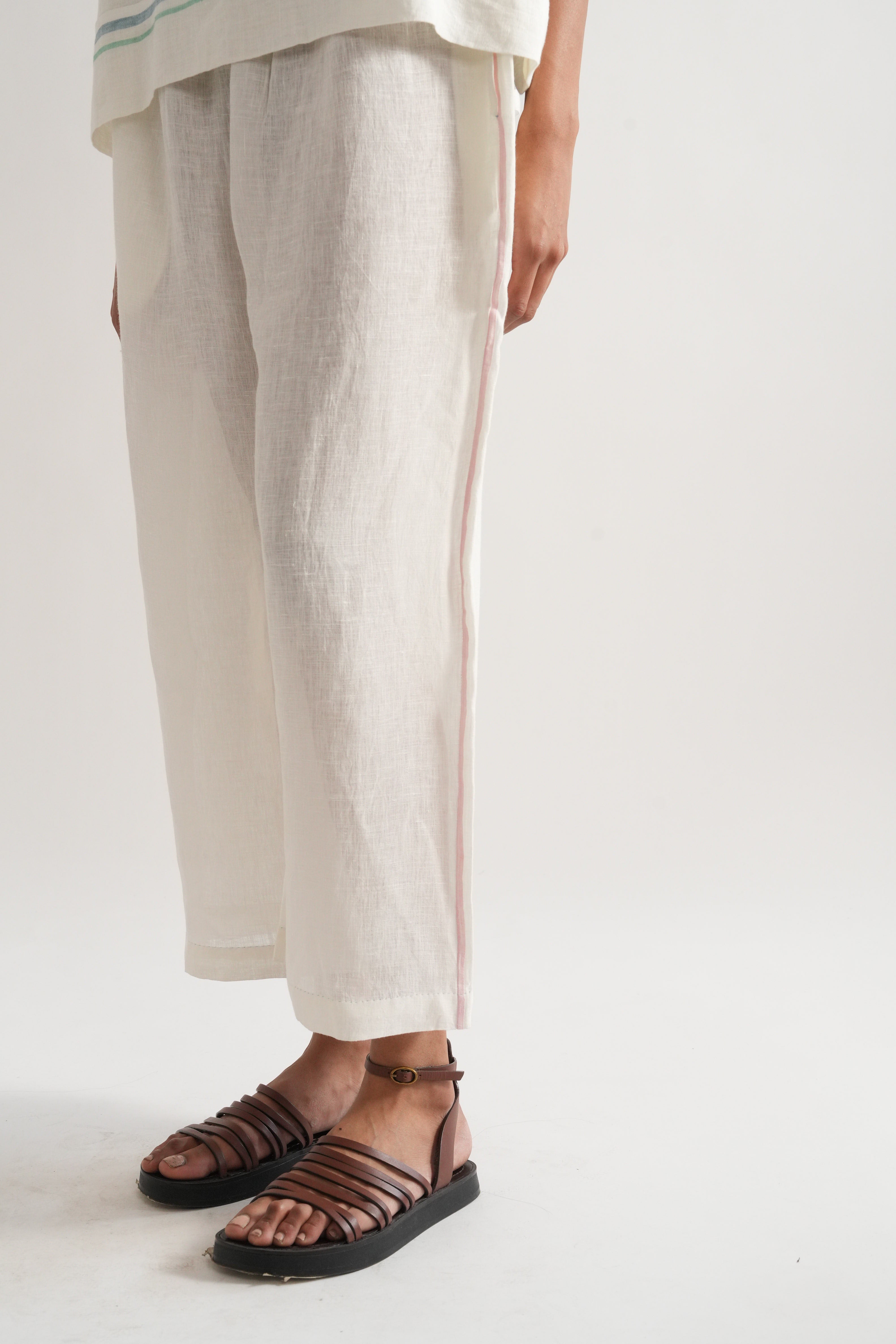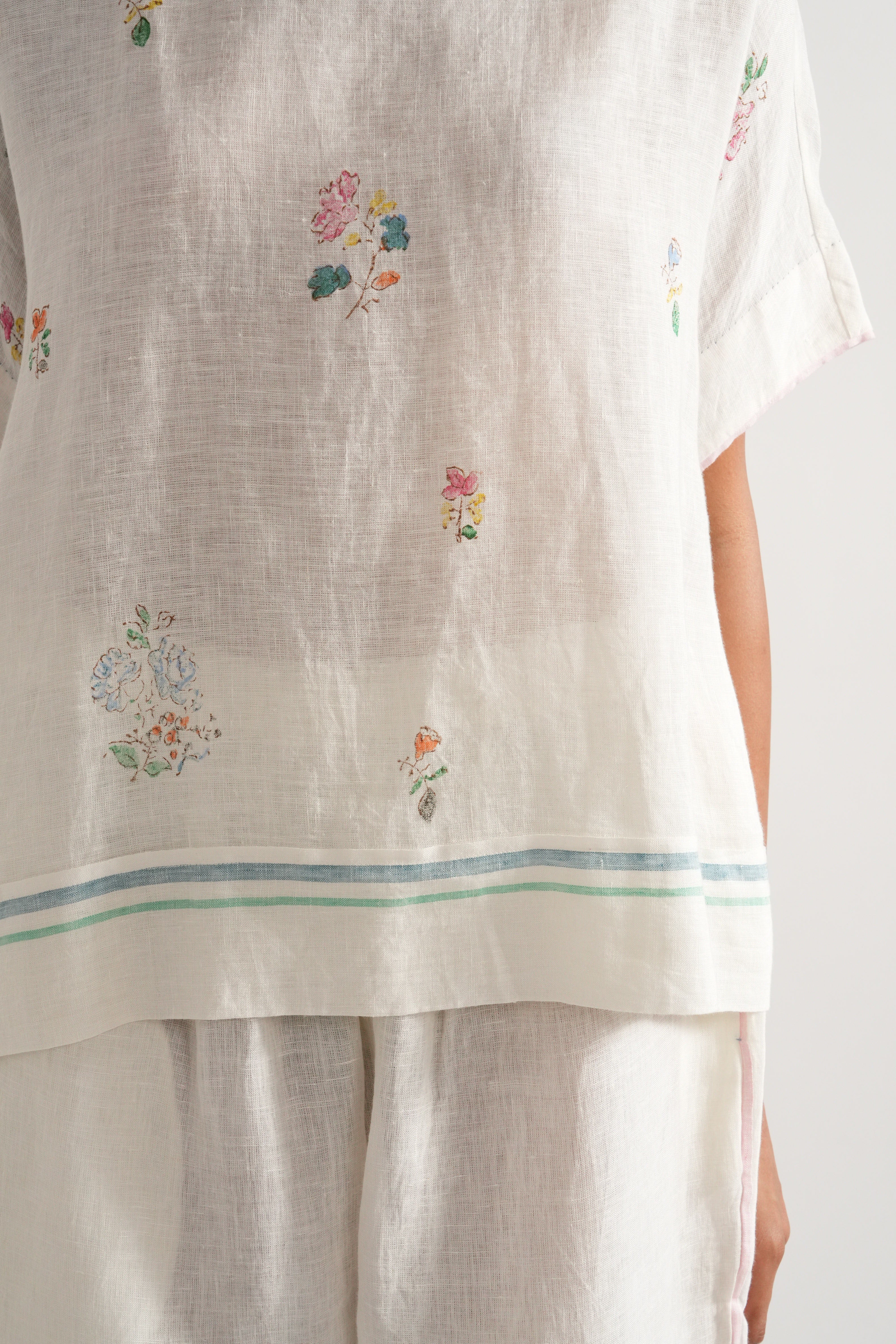 Relaxed fit short summer top in handwoven linen with placement hand block print and selvage details comes with a pair of relaxed fit culottes