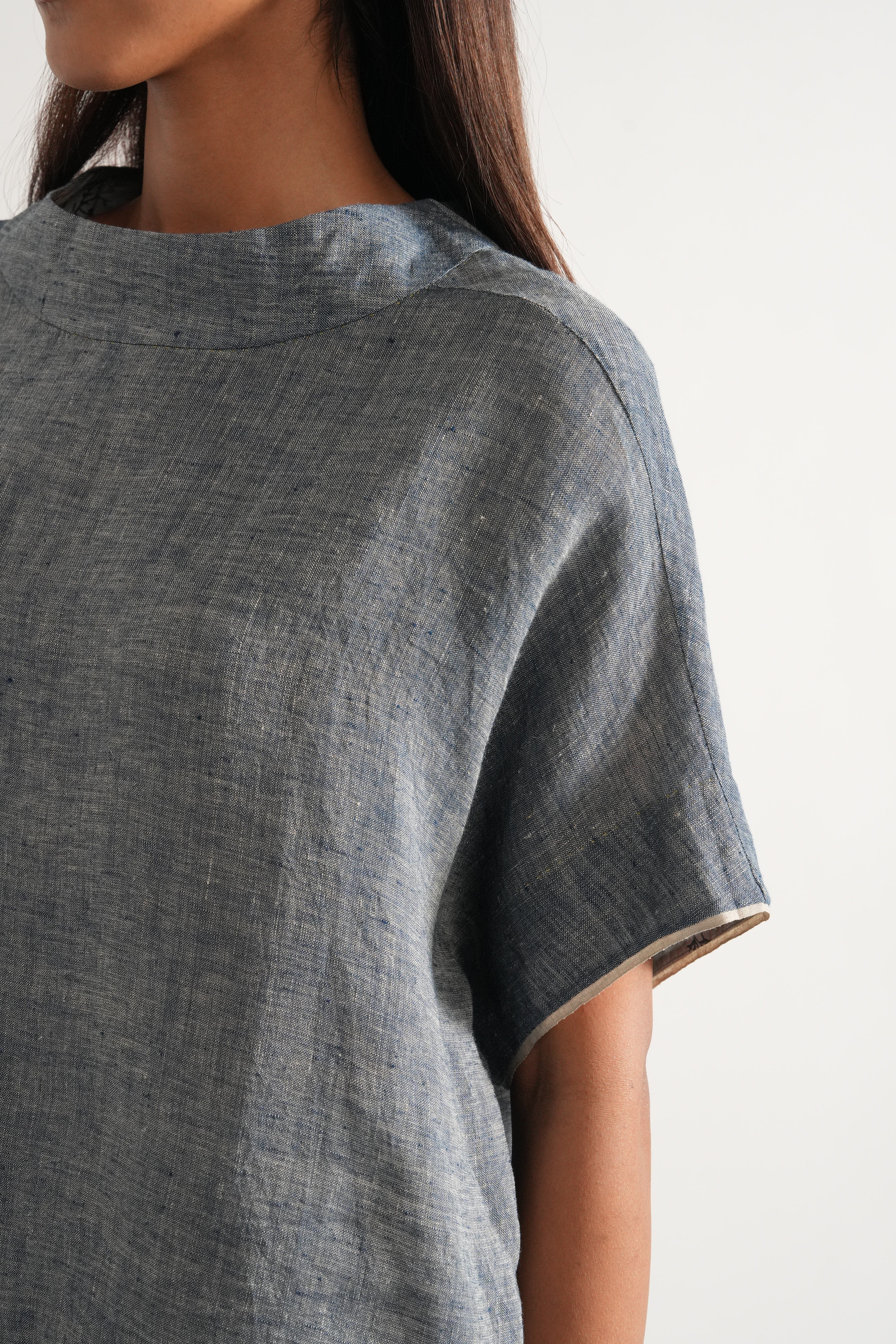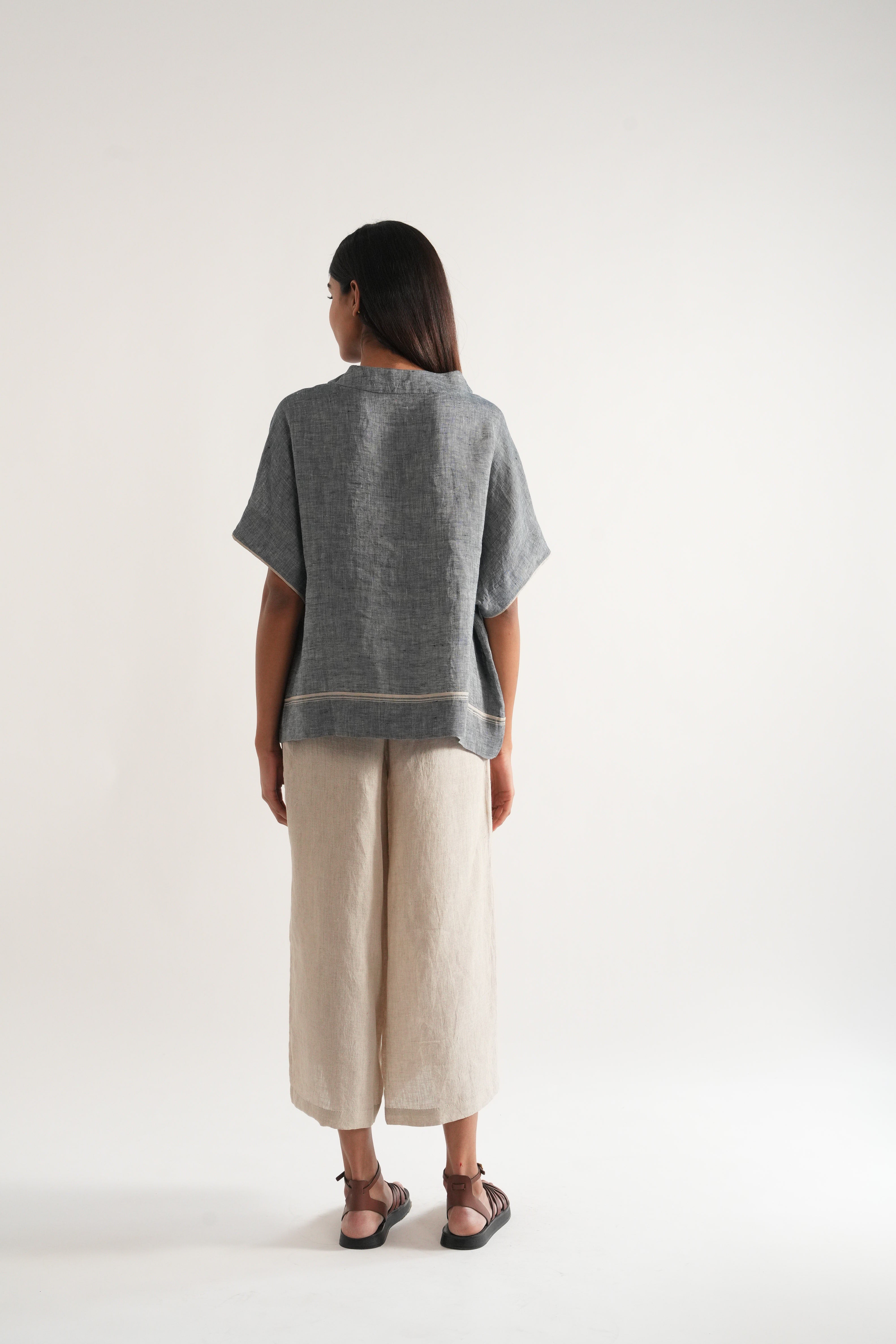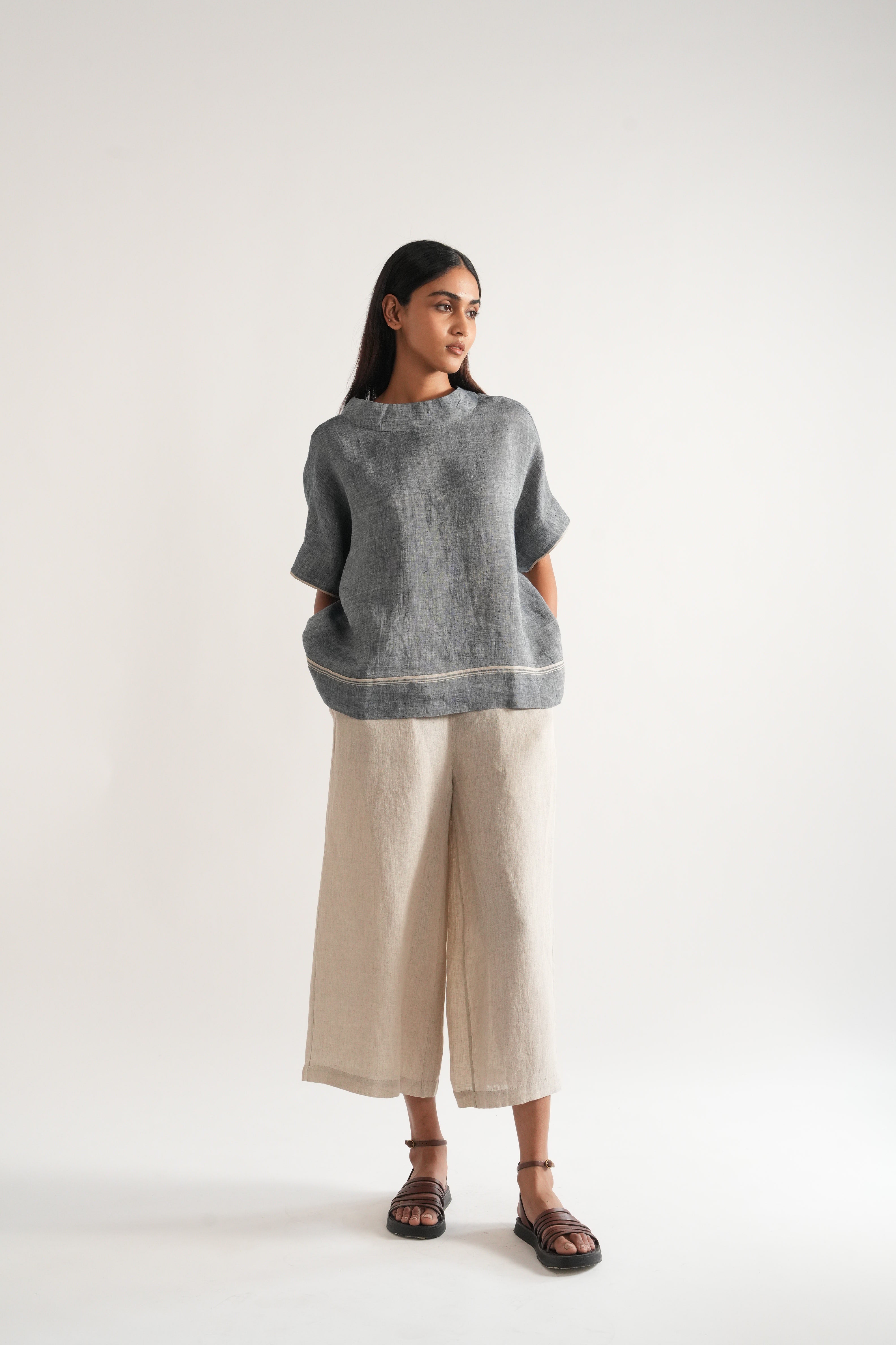 Relaxed fit short summer top in handwoven linen solid with selvage details comes with a pair of relaxed fit culottes