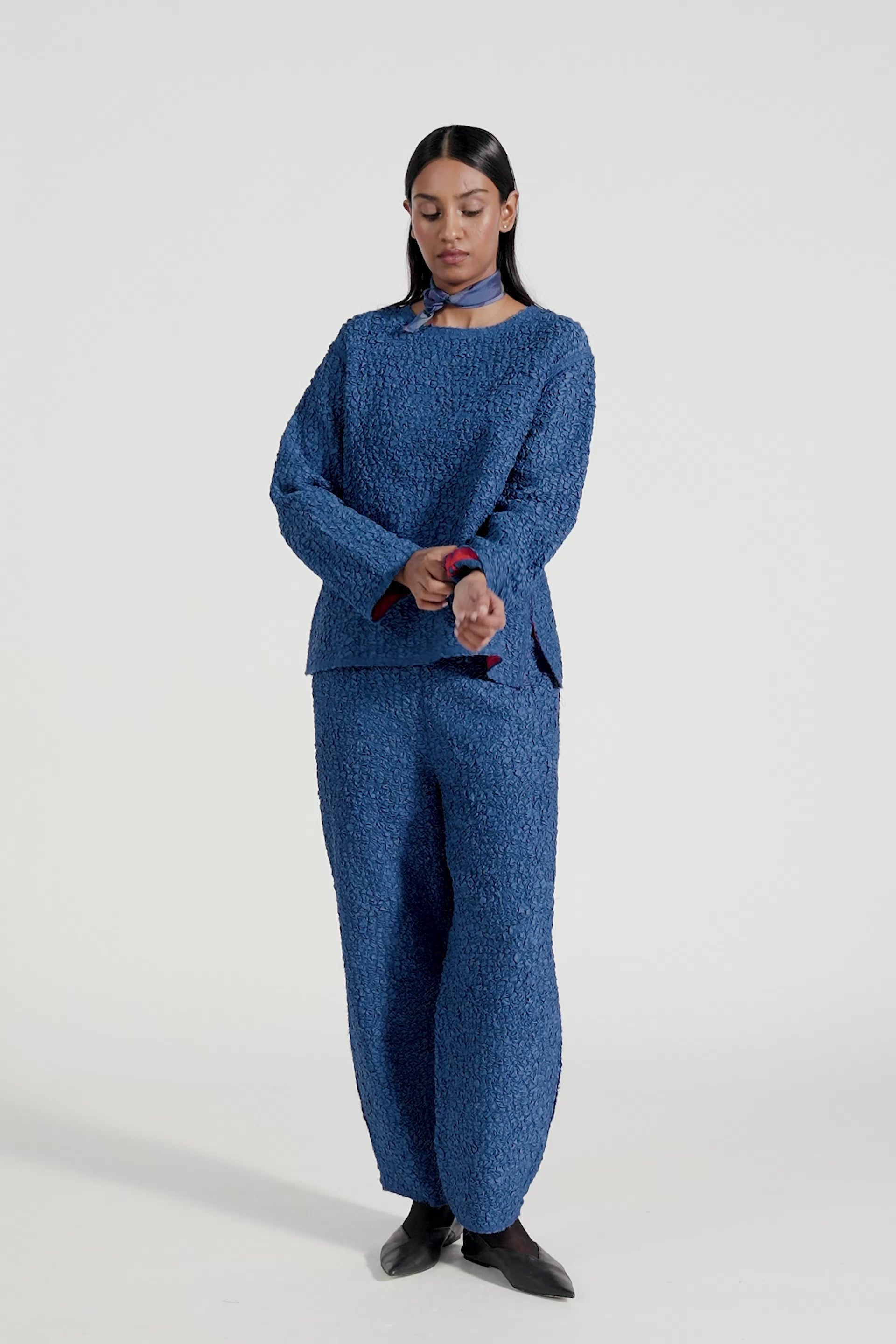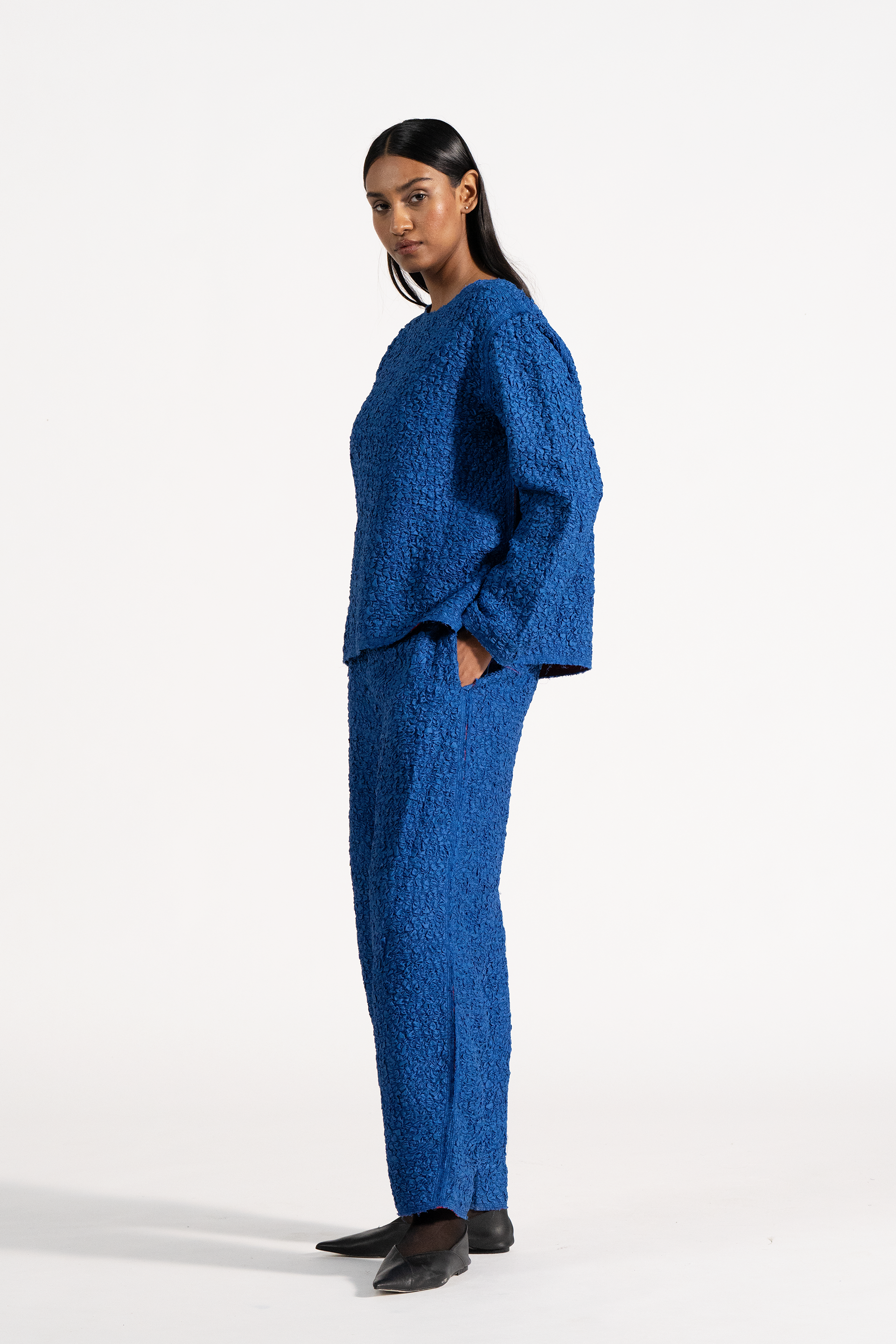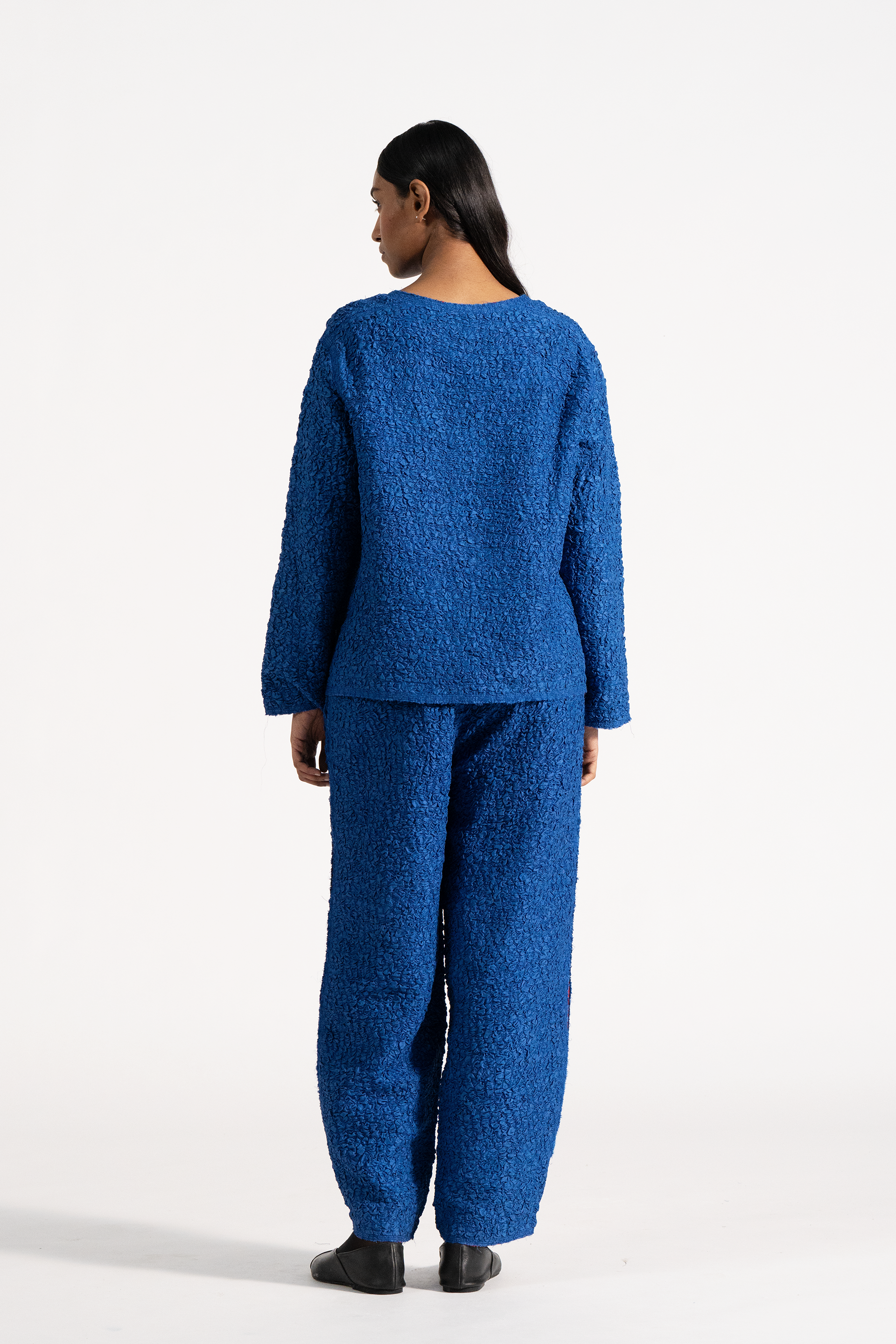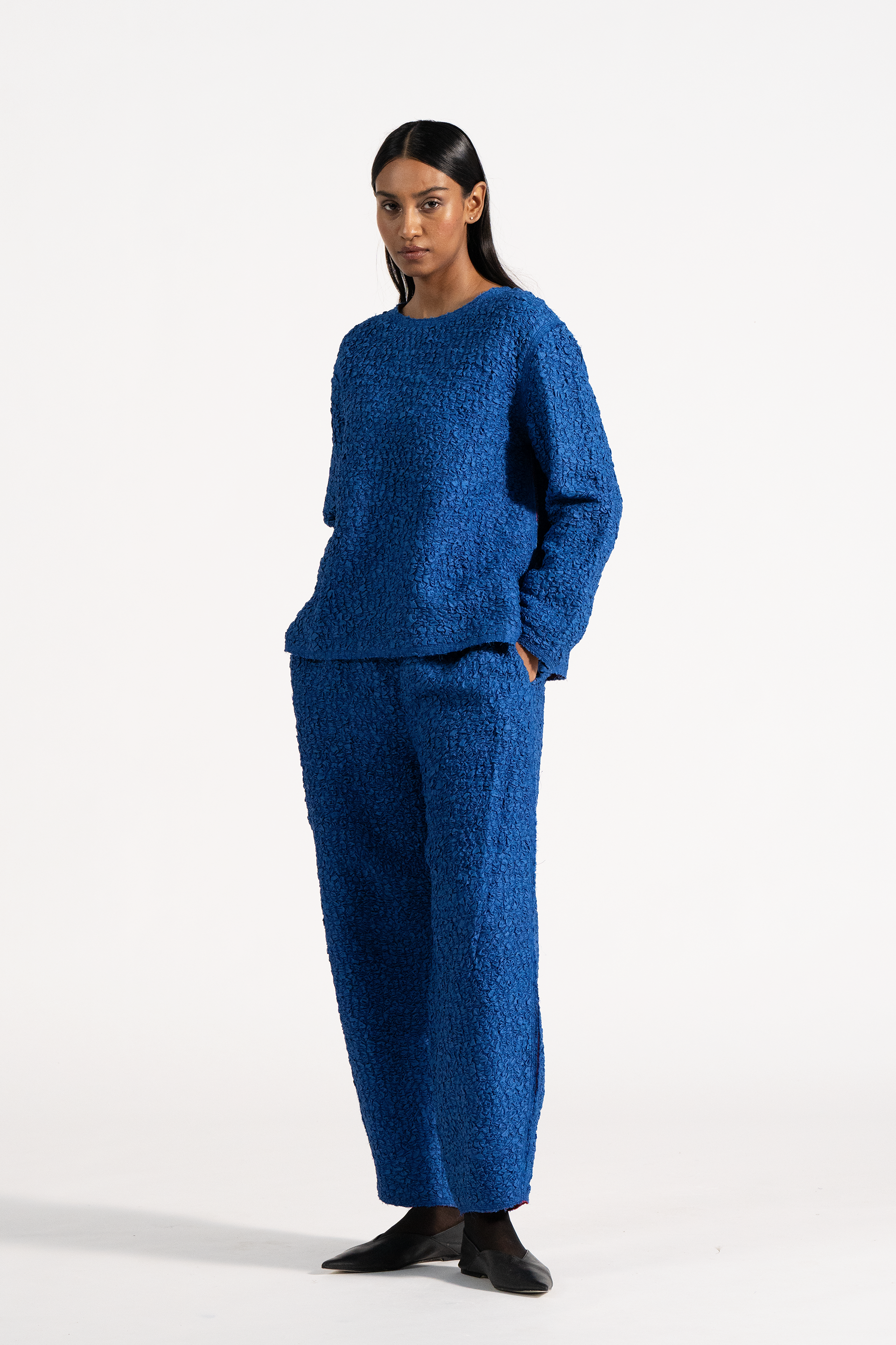 Relaxed Fit Round Neck Top In 100% Smocked Textured Silk.