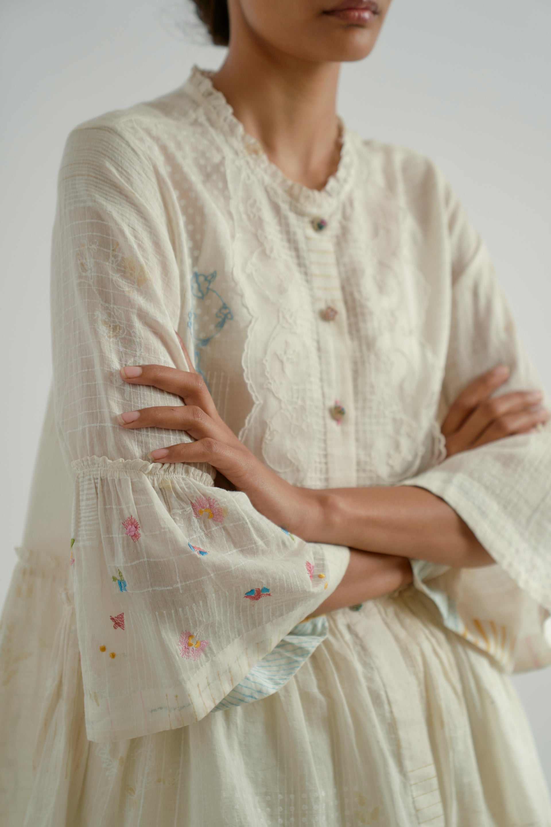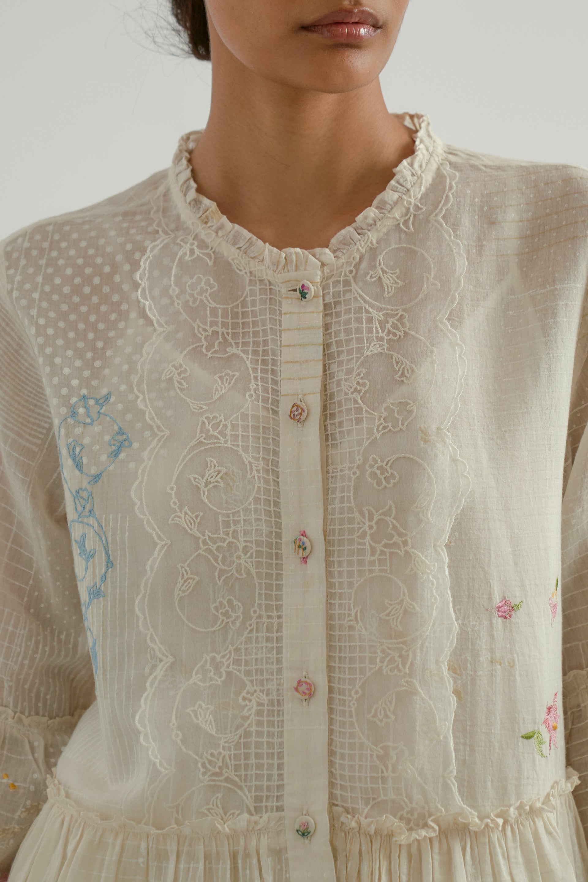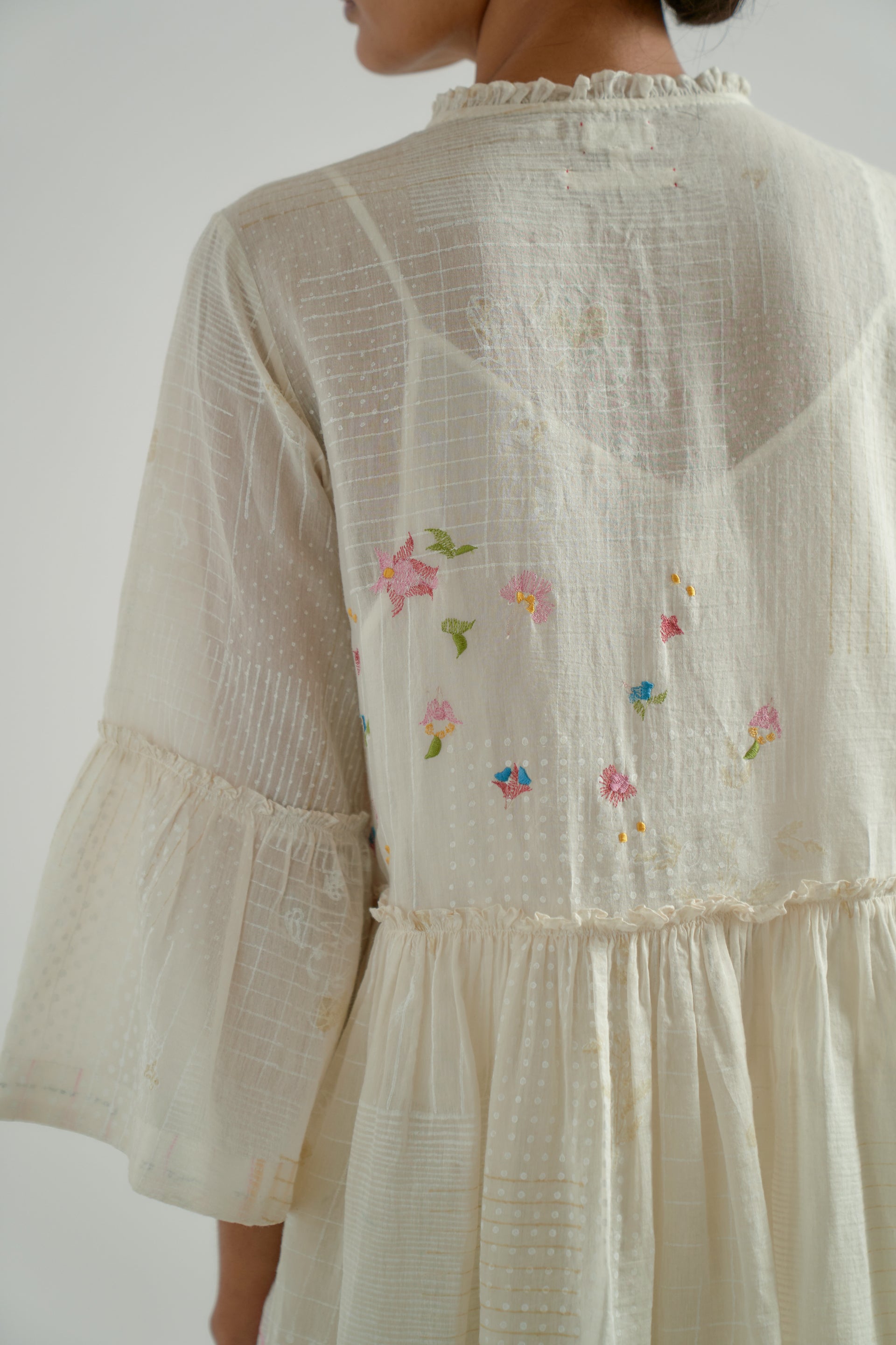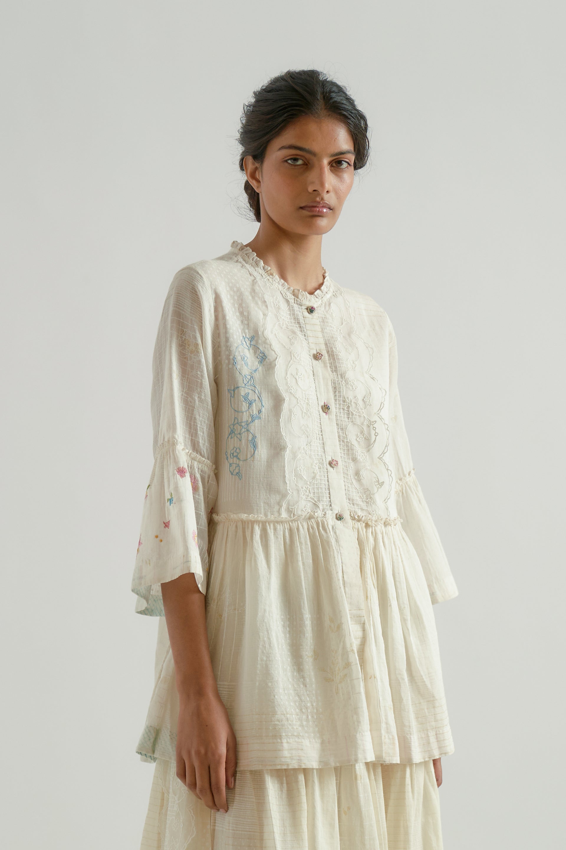 Stand-collar, front-open button-down top featuring a tiered waistline with gathers and 3/4th sleeves. Crafted from a cotton-silk blend, it showcases multi-technique, multicolor floral embroidery inserts and placements on a tonal hand-block printed fabric.