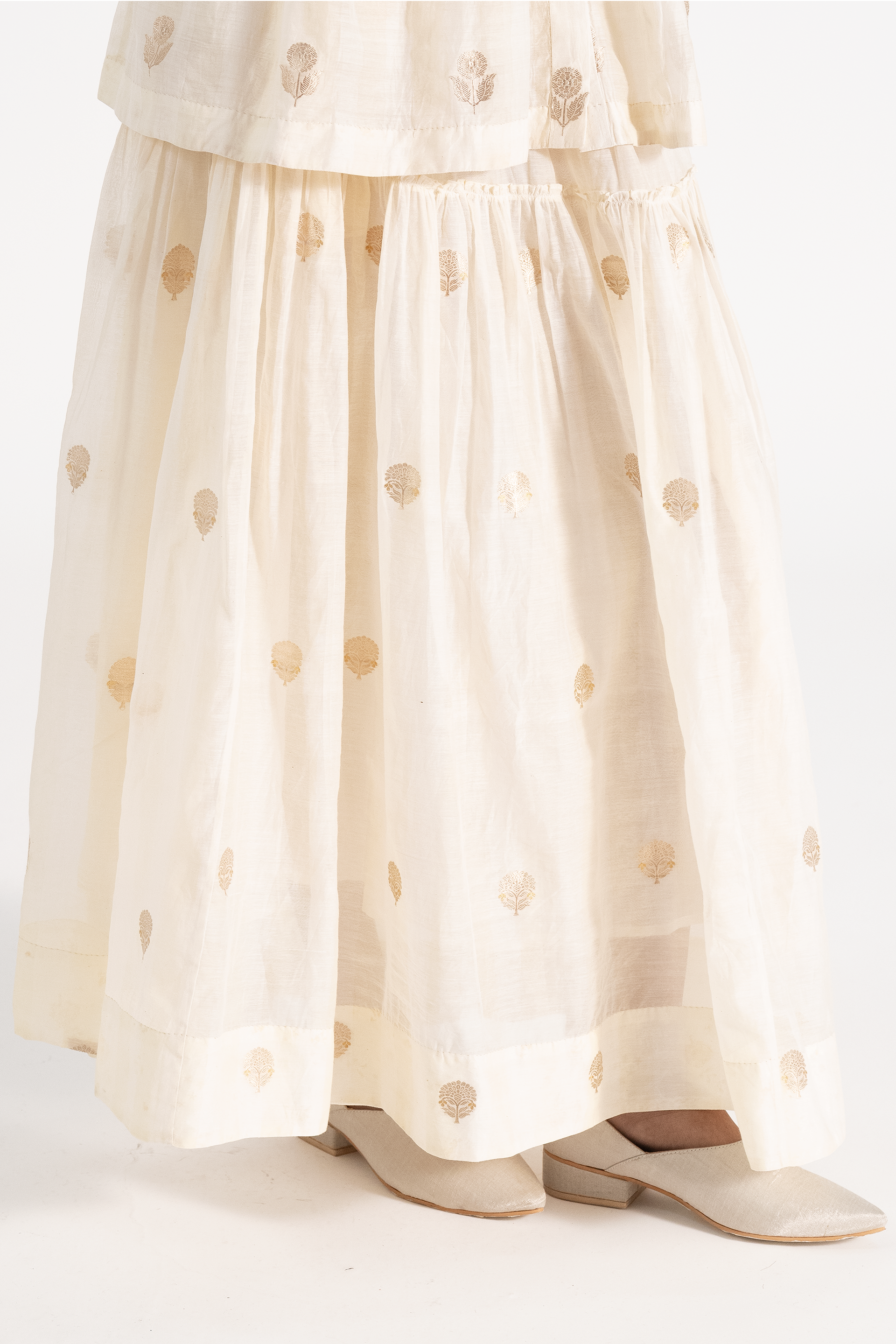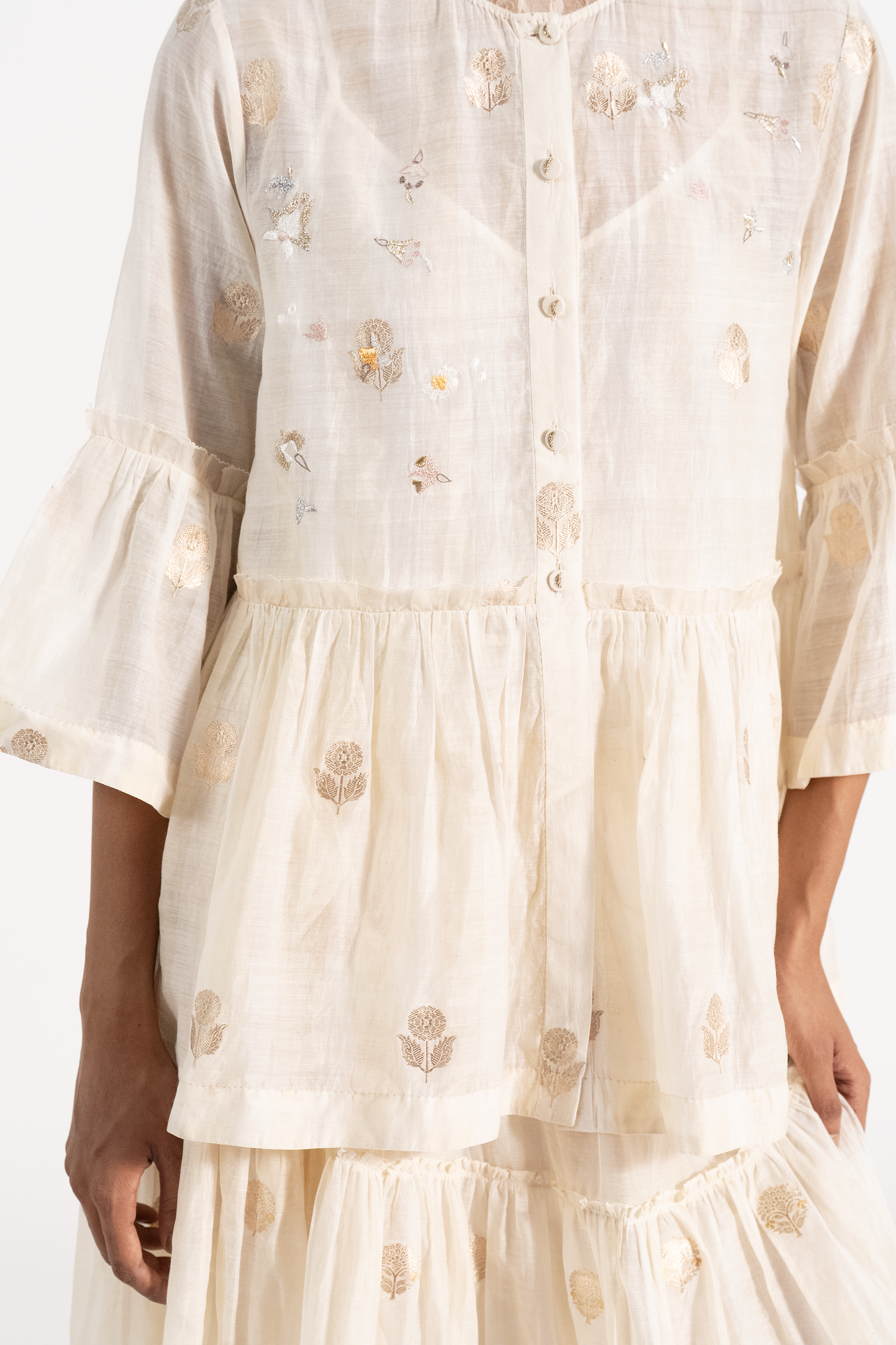 Relaxed Fit, Puff Sleeved Tiered Top With Gathers And A Tie Up Detail And Scalloped Hem. Has Floral Embroidery And Fagotted Seams. Comes With A Seprate Cotton Silk Lining.