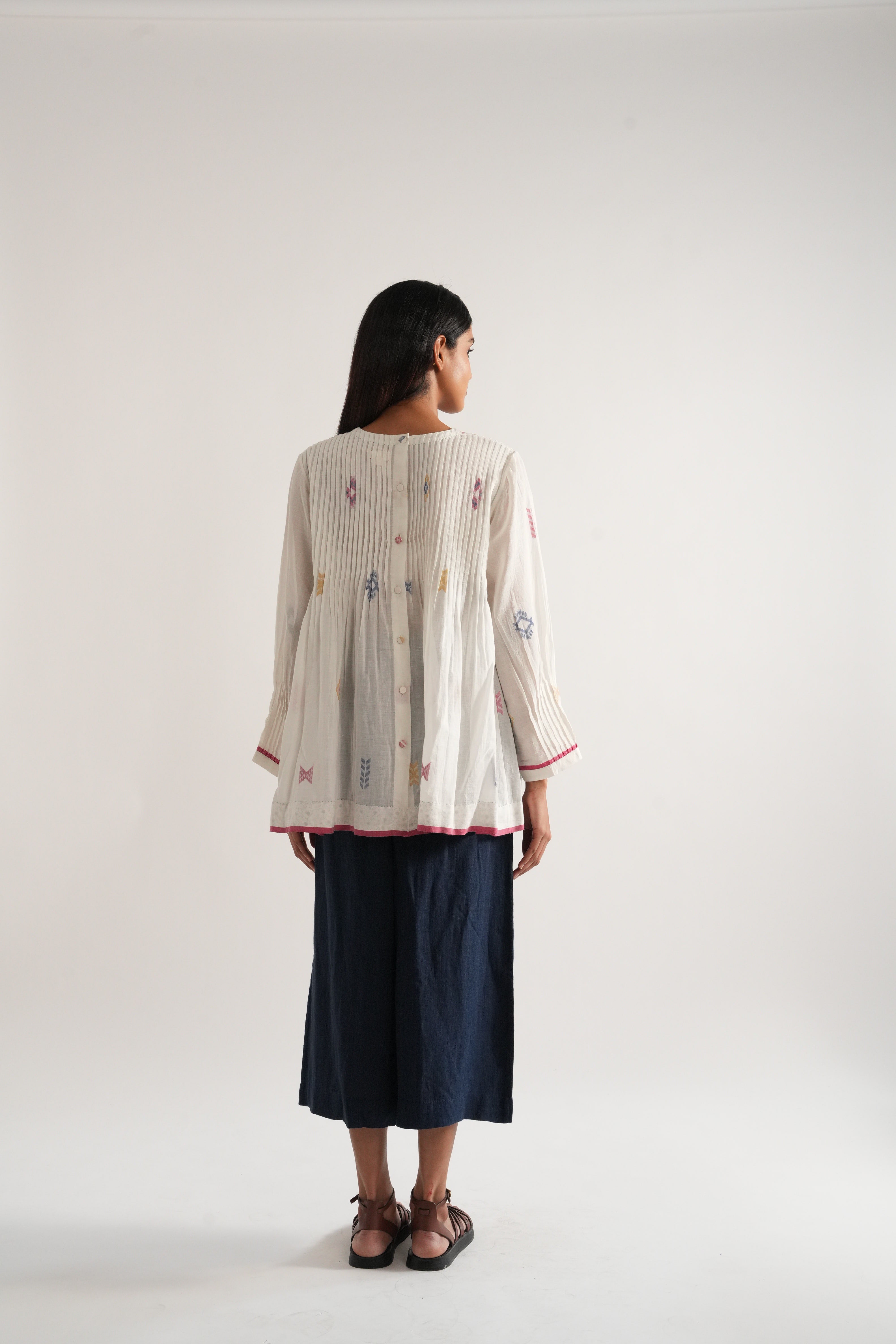 Relaxed fit allover pintuck top in handwoven cotton jamdani jacquard
