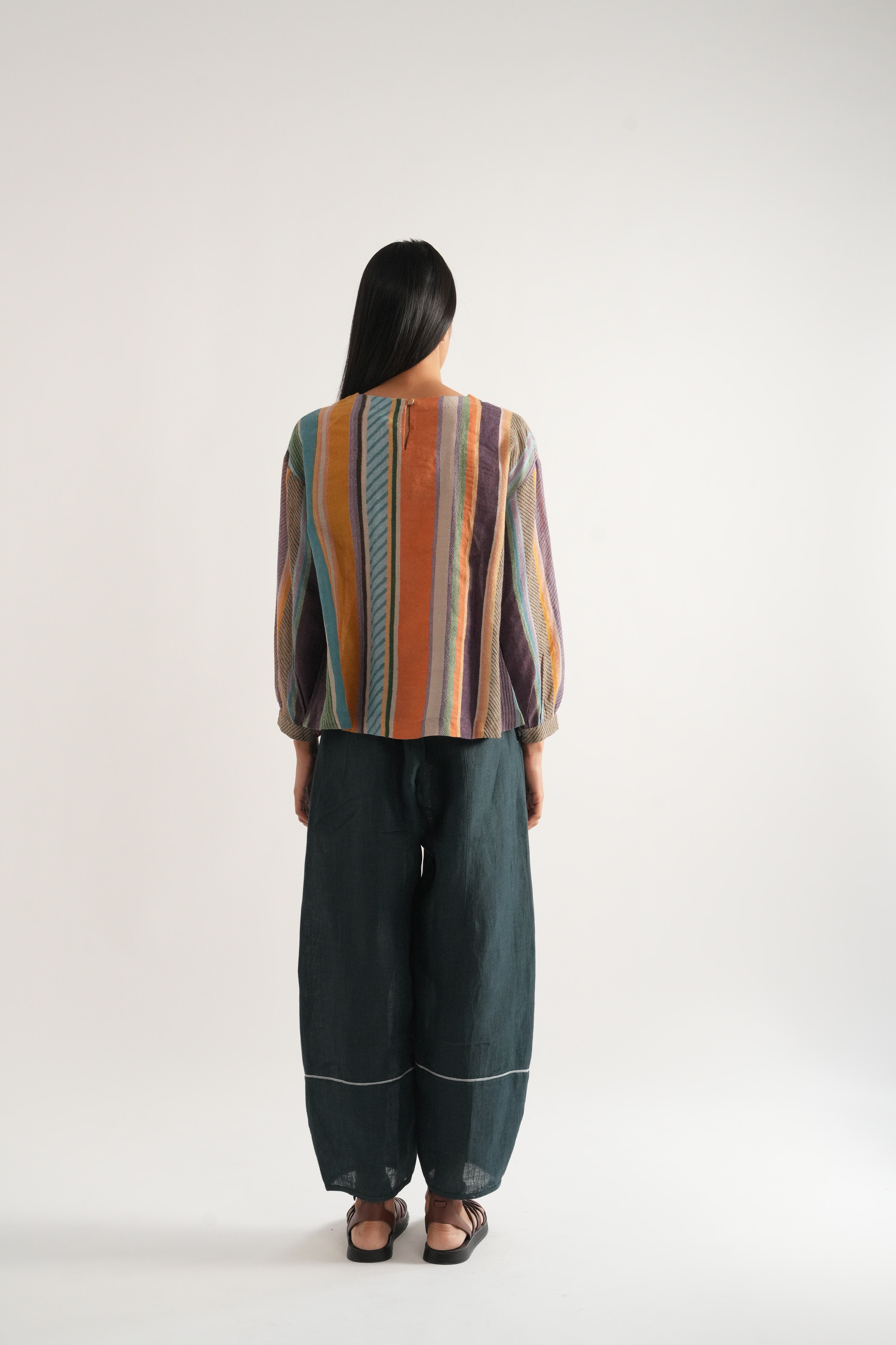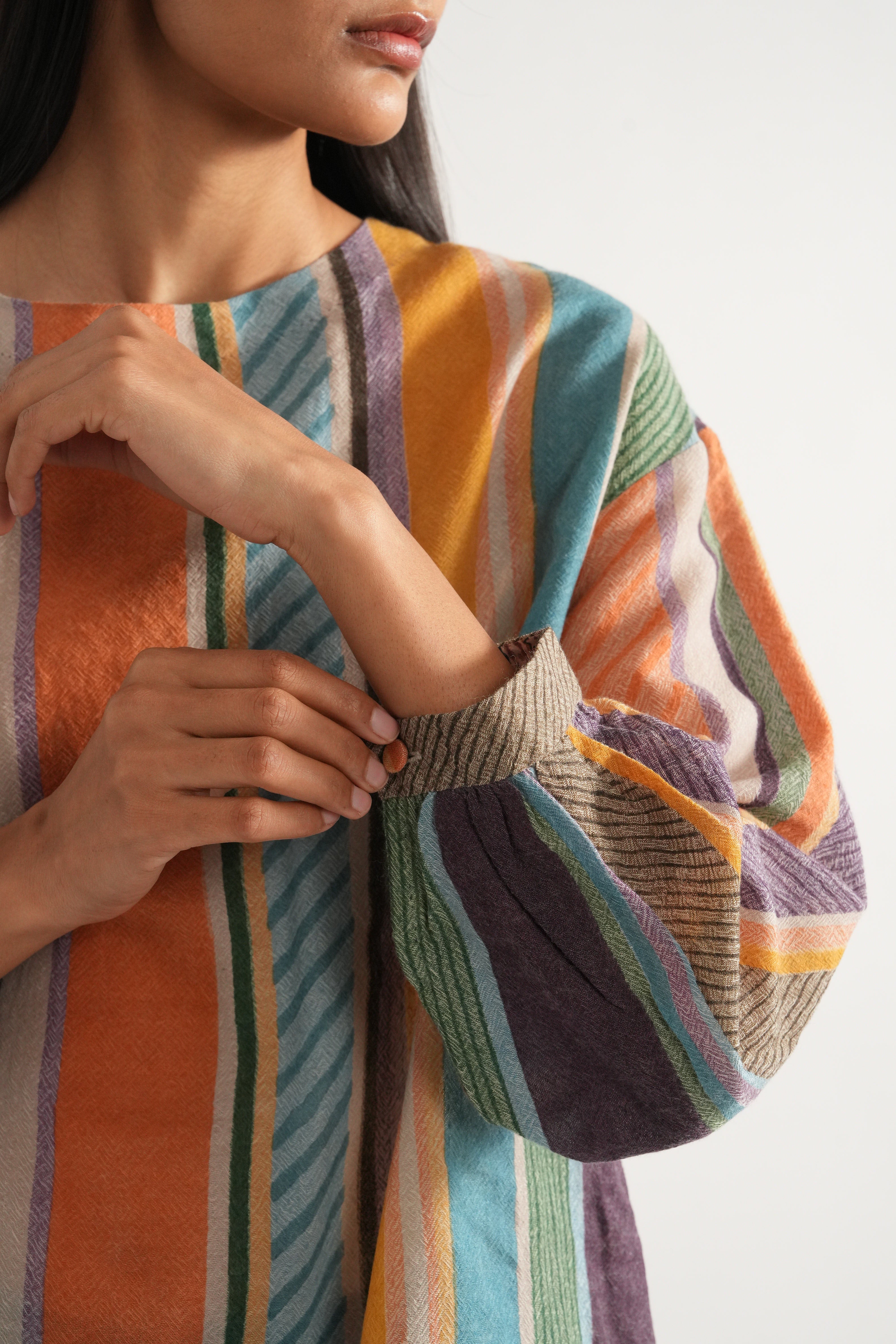 Full pleated sleeves semi fit top in handwoven multicolor yarn dyed and block printed wool.