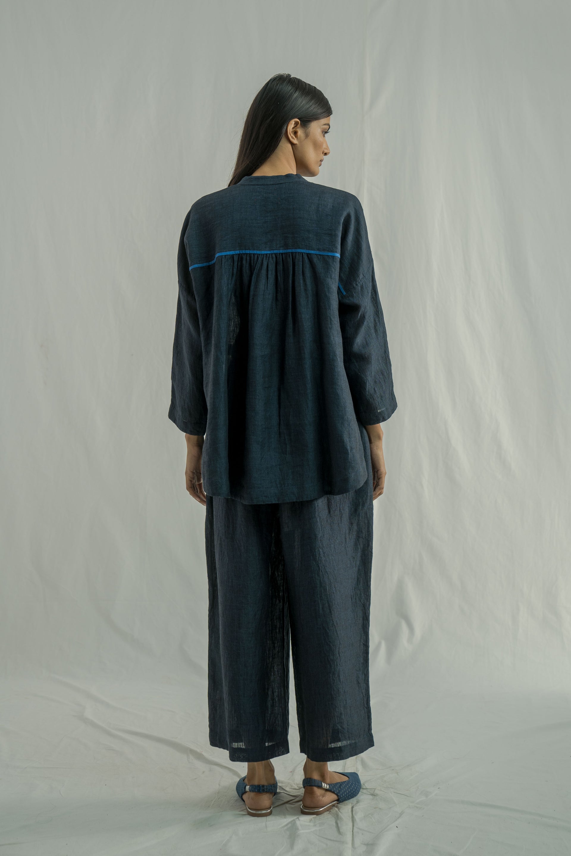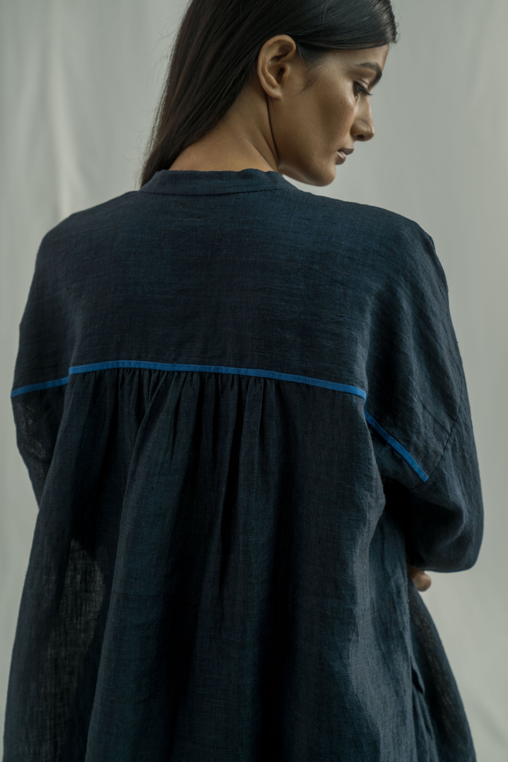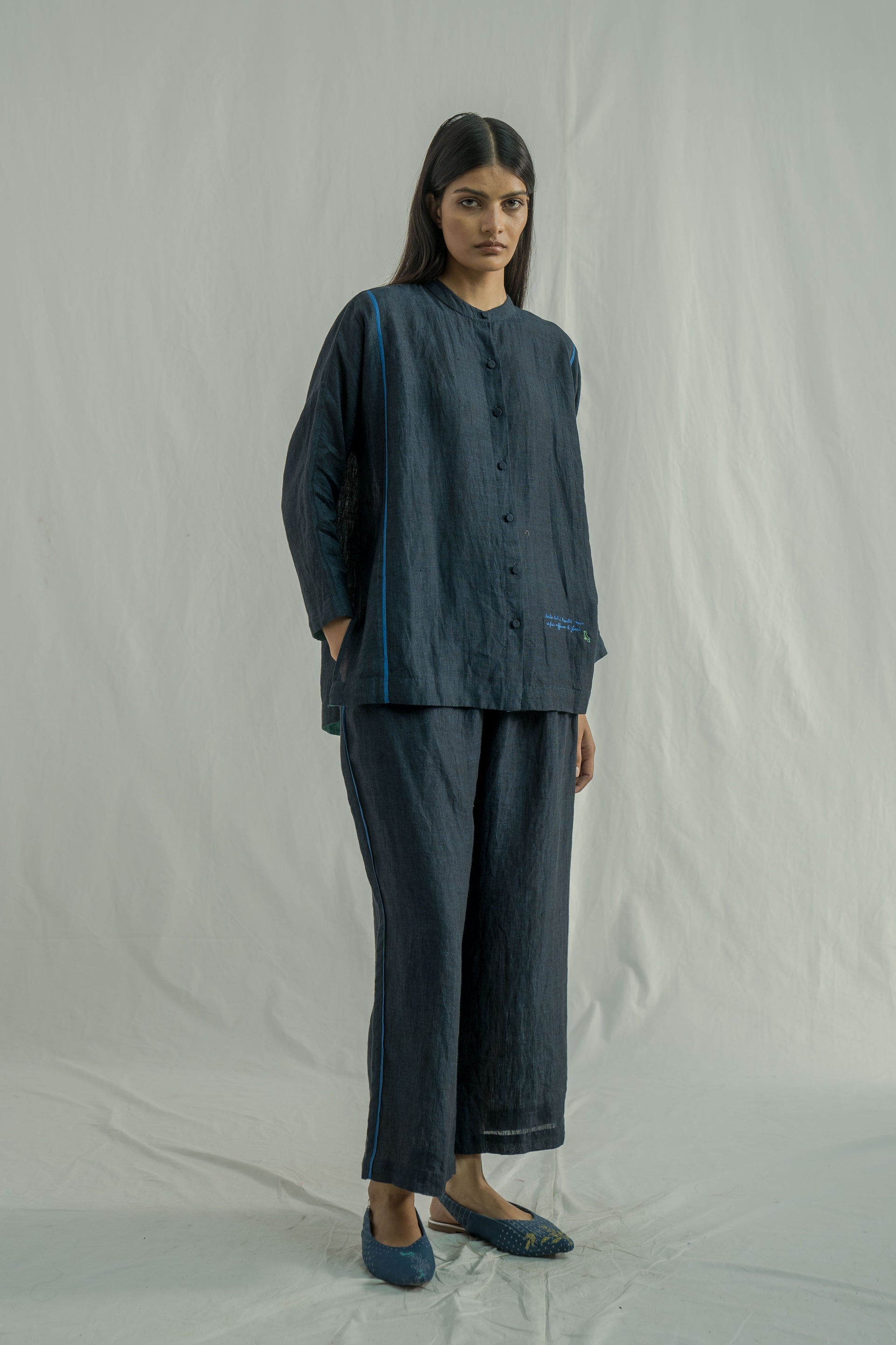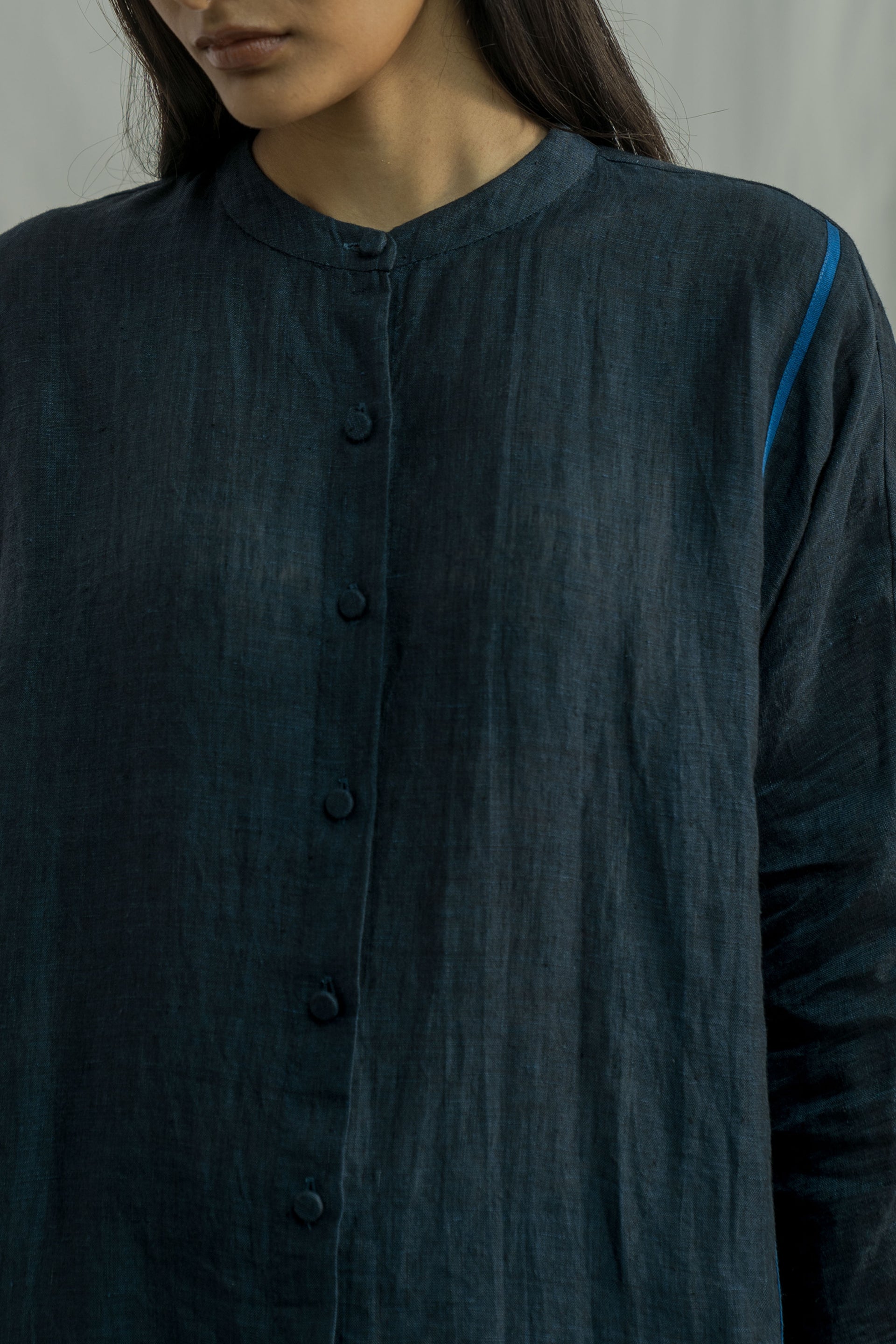 A stand collar, straight fit front open button down shirt with full sleeve. constructed in solid 100% linen fabric with contrast selvedge detail.