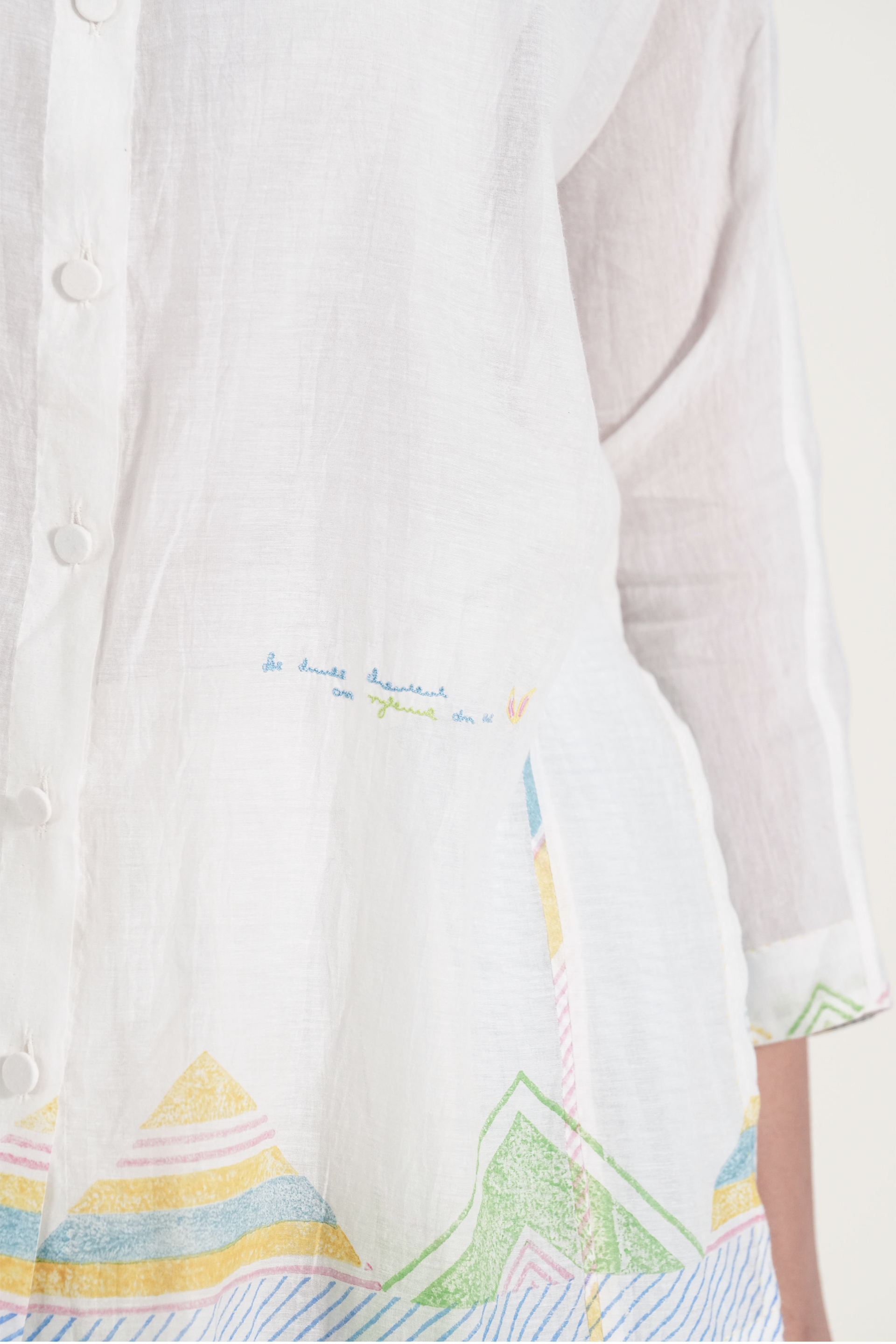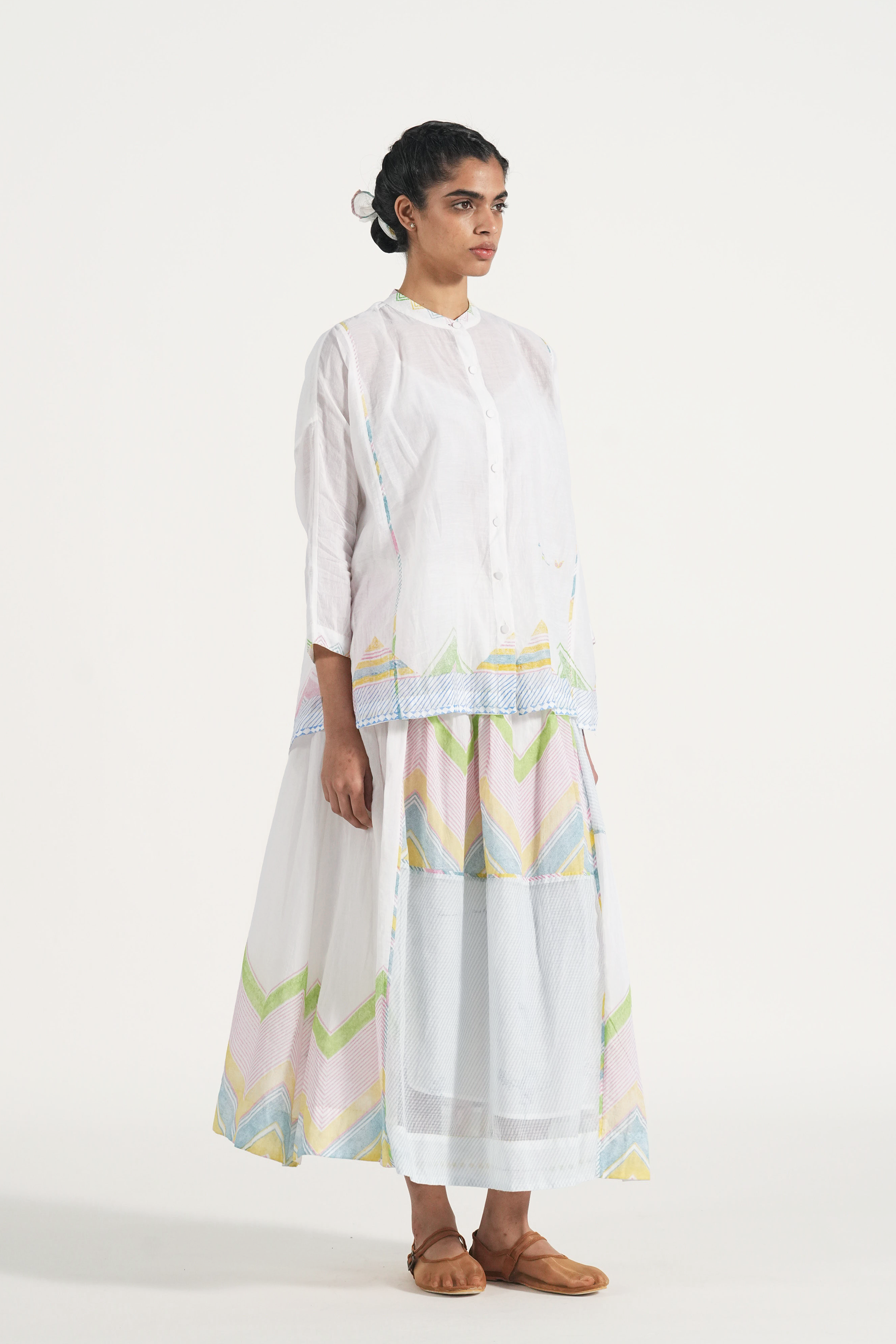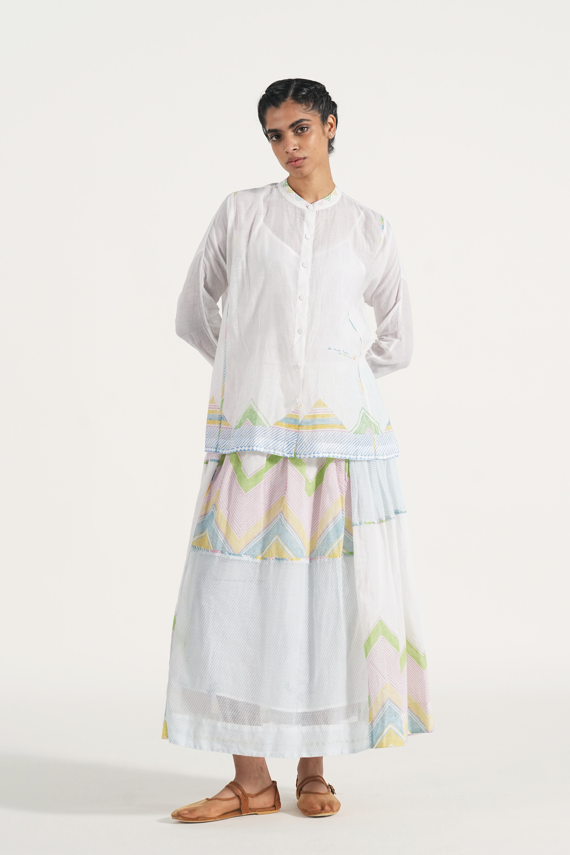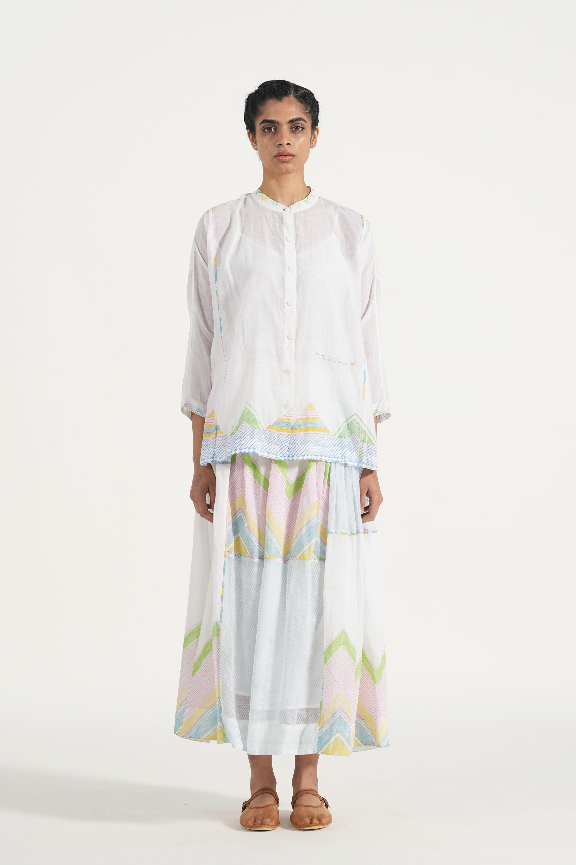 Straight fit shirt multi color chevron print and contrasting piping detail. Comes with a complimentary plain lining, without any trims details.