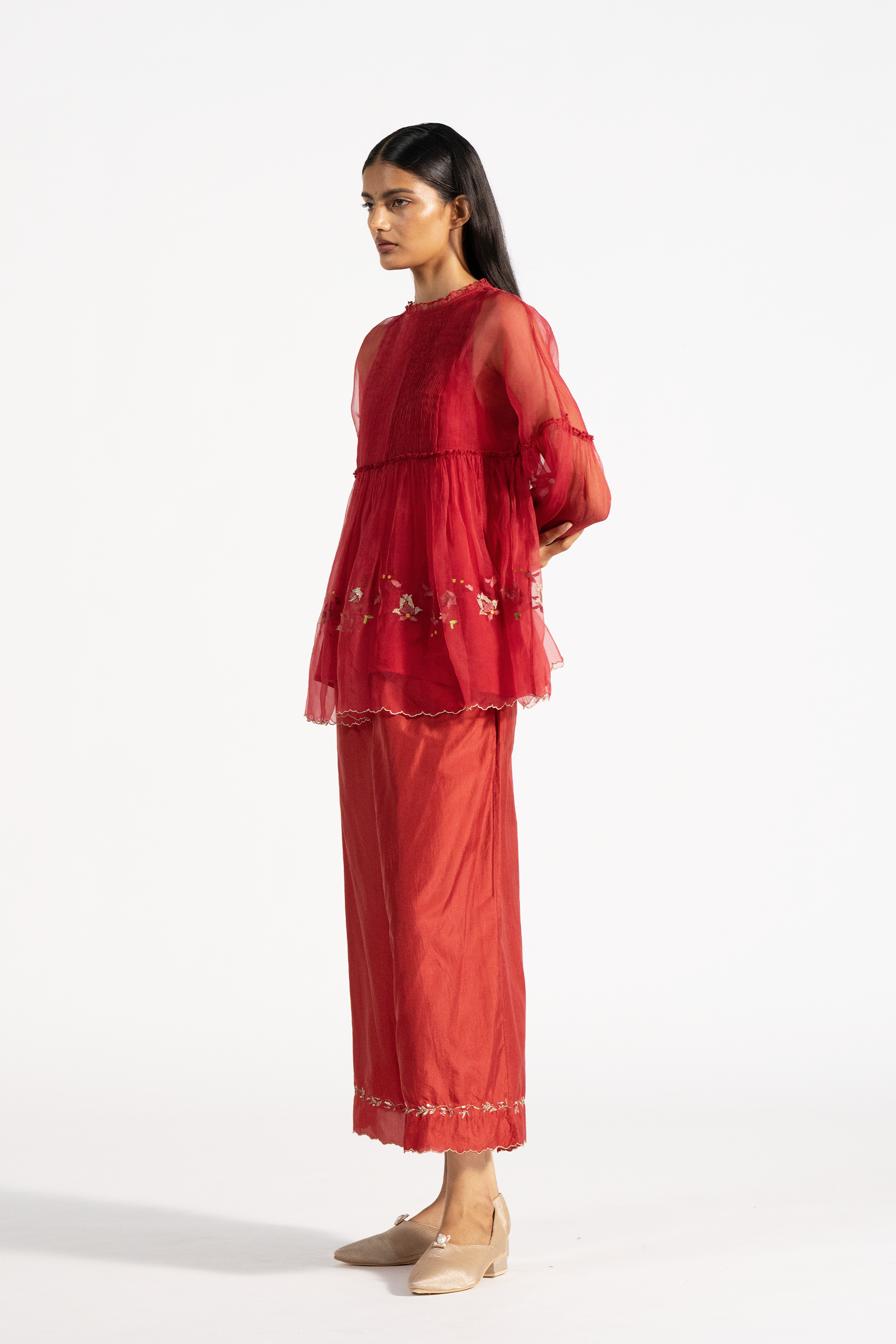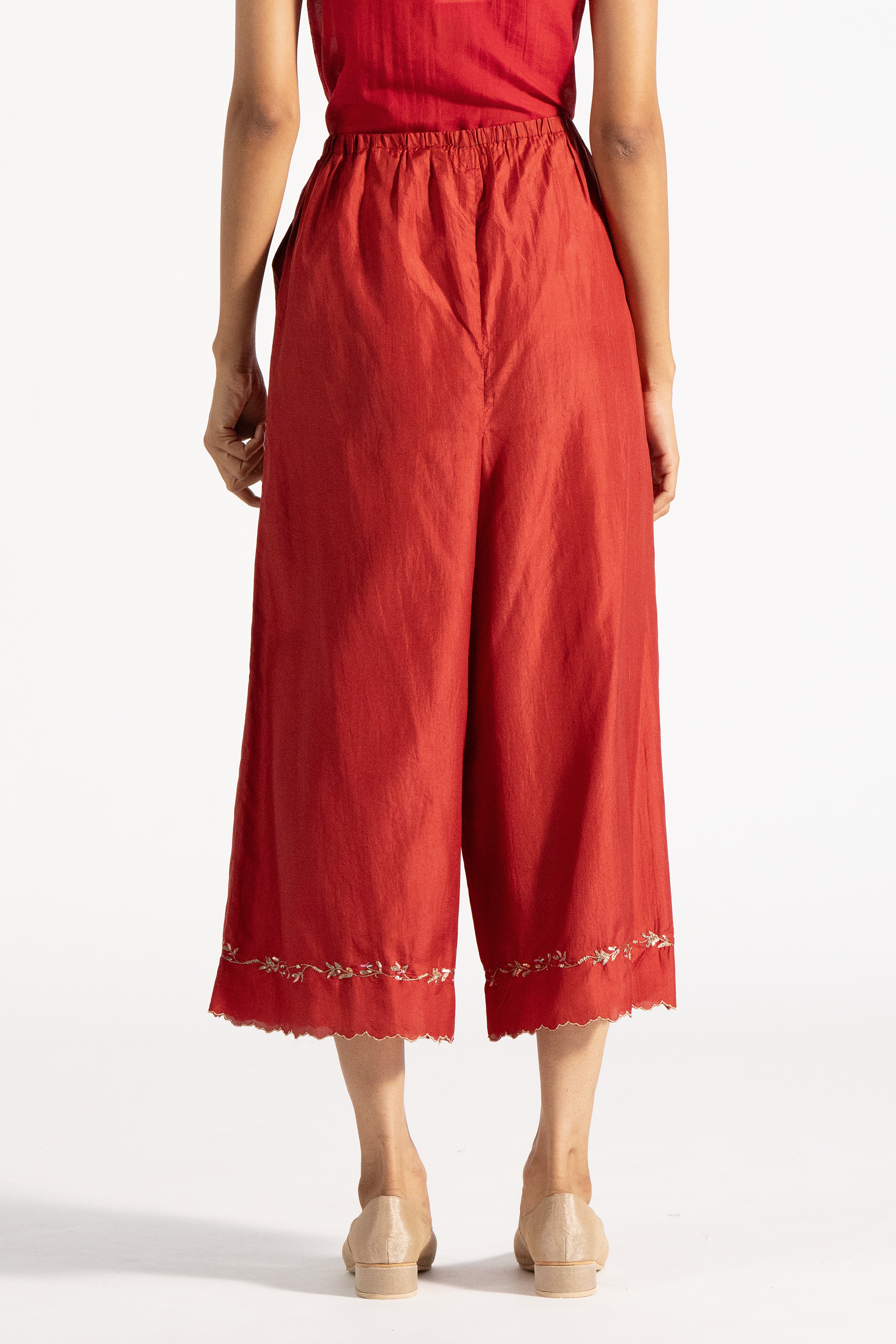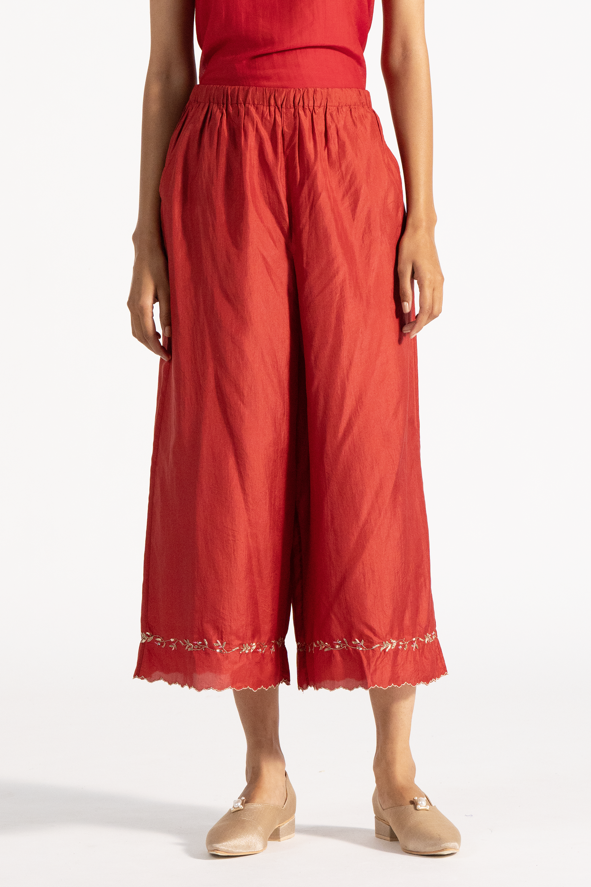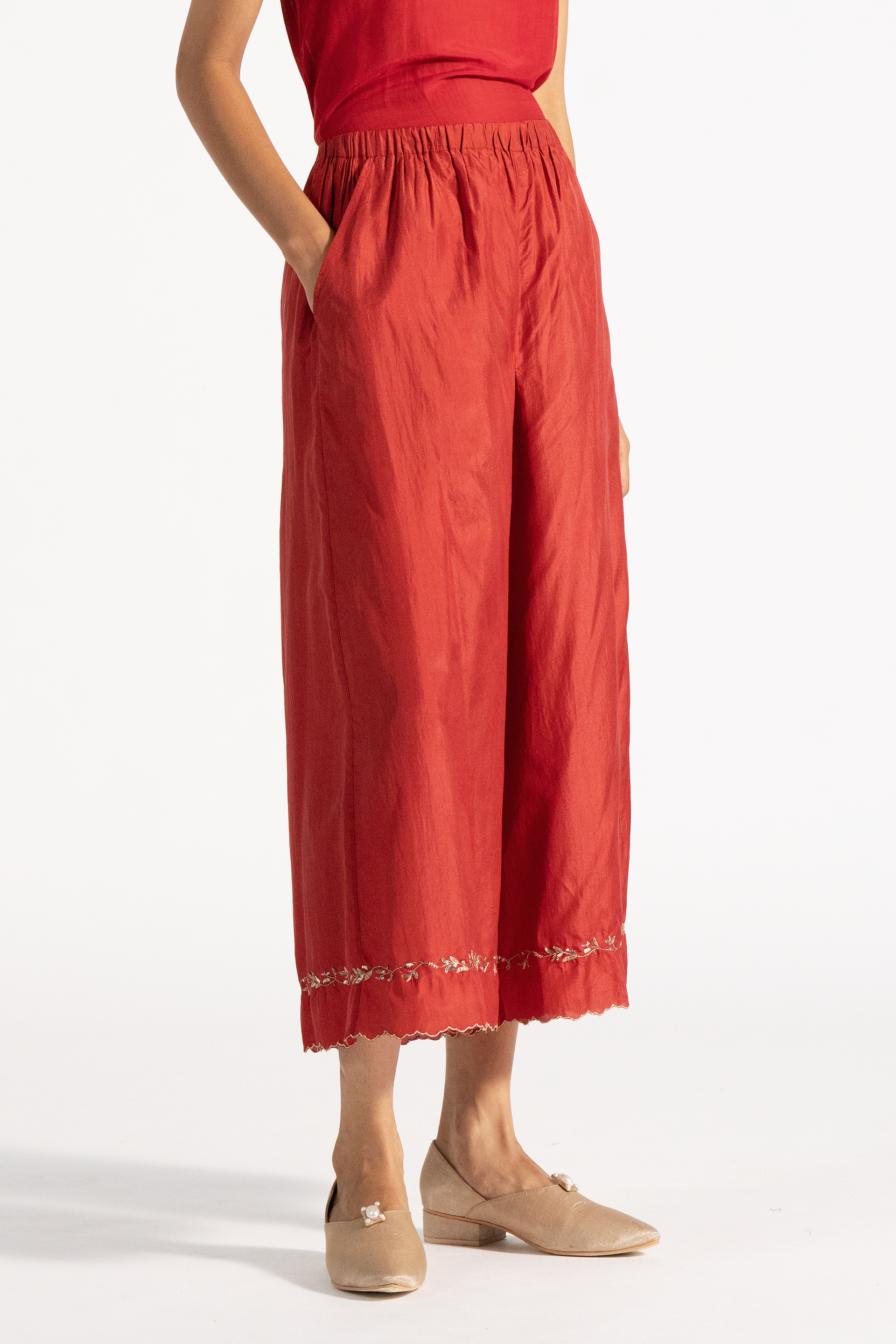 Wide leg straight fit trouser with scalop detail and hand embroidery on hem.