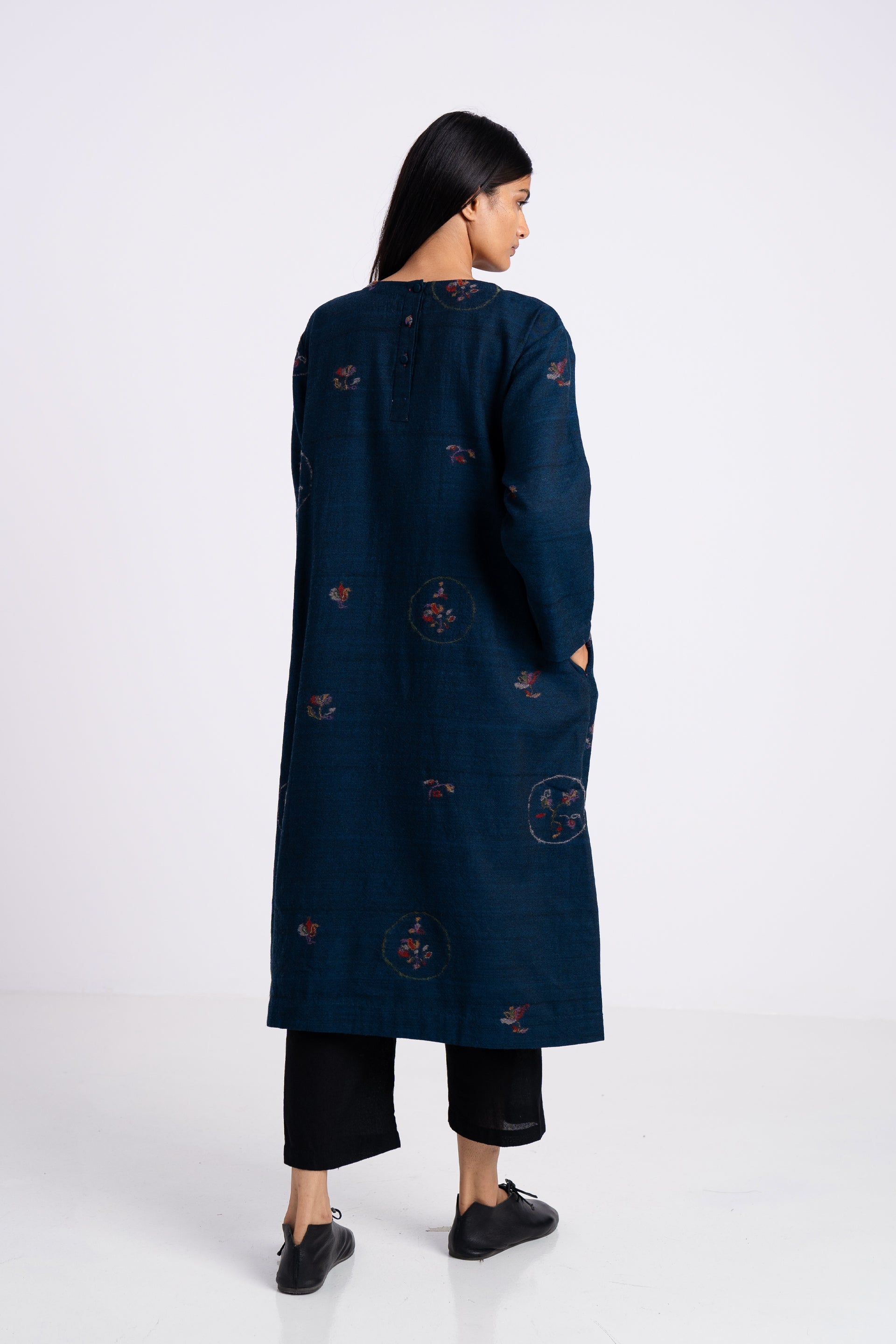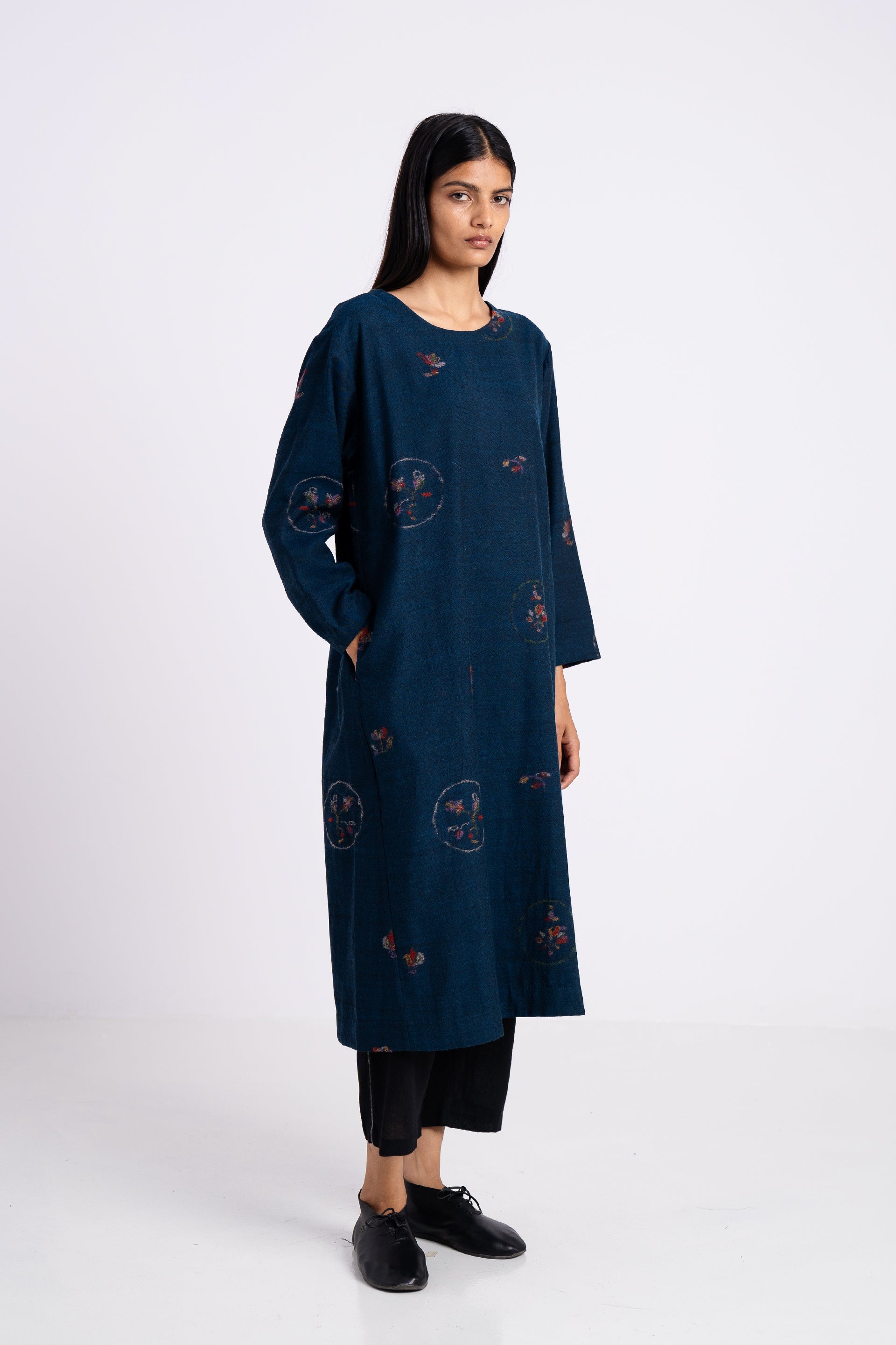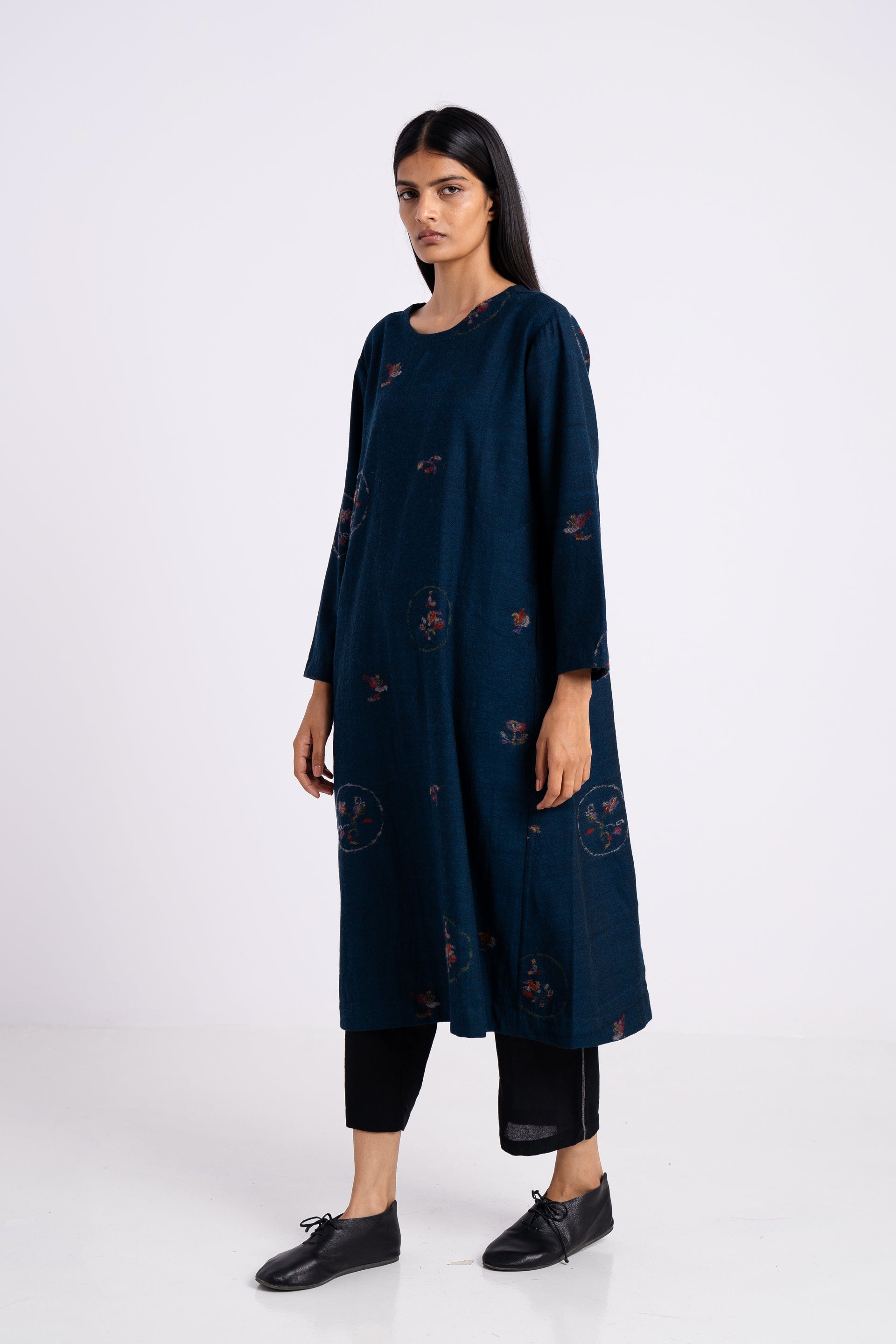 This A-line midi dress features a round neckline and is crafted from 100% solid wool. Constructed in placement jacquard motifs ,finished with hand-block printed silk lining.