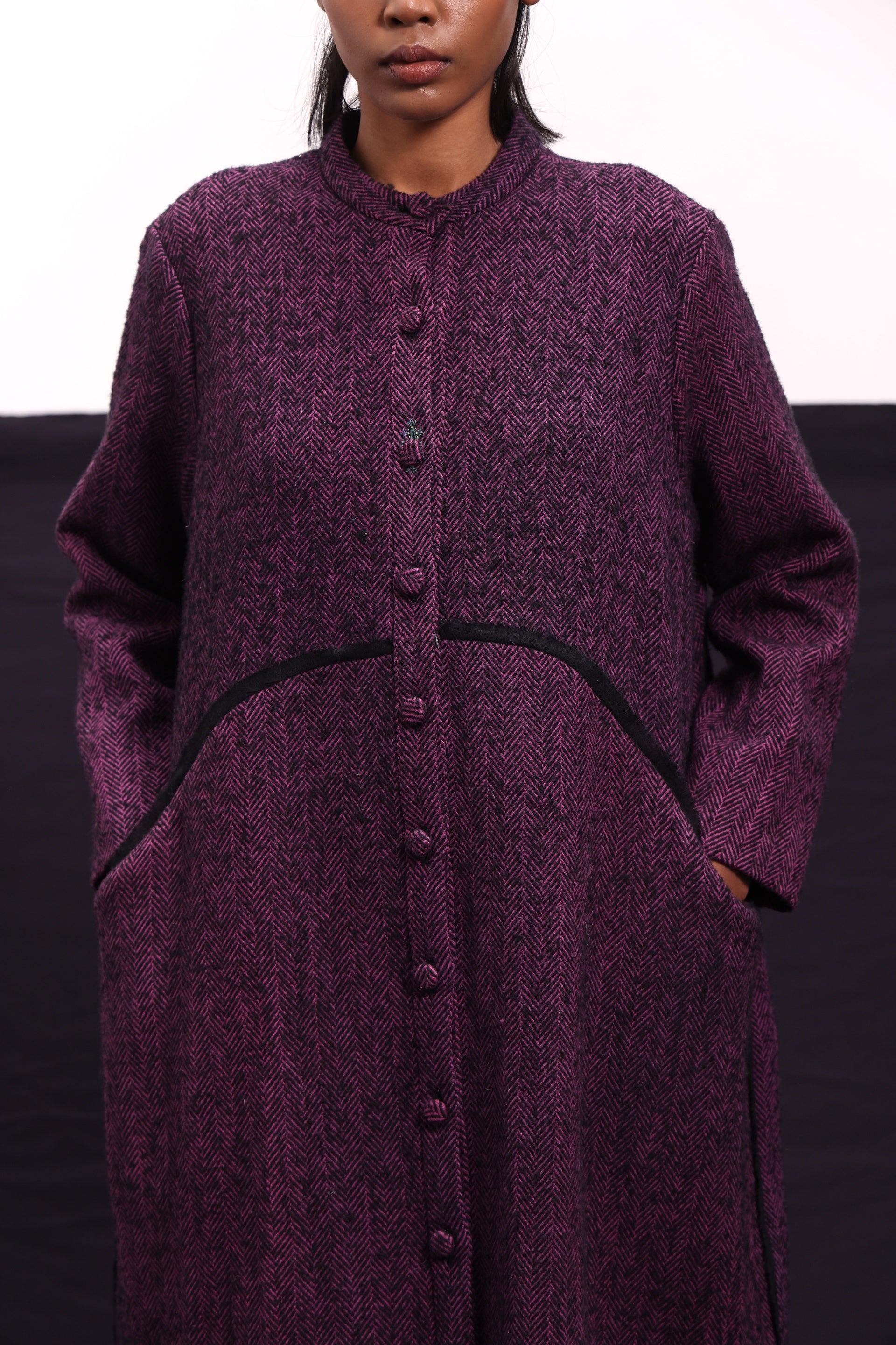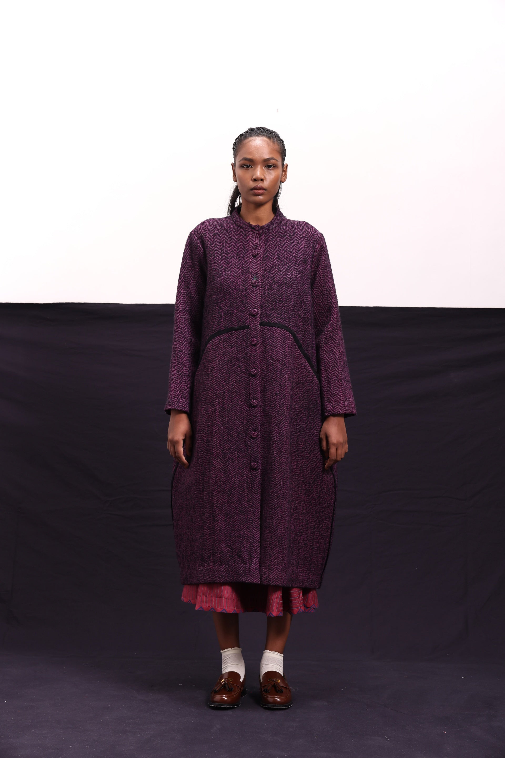 Front open jacket constructed in heavy broken twill weave wool with thick piping detail. Comes with an attached hand block printed silk lining.