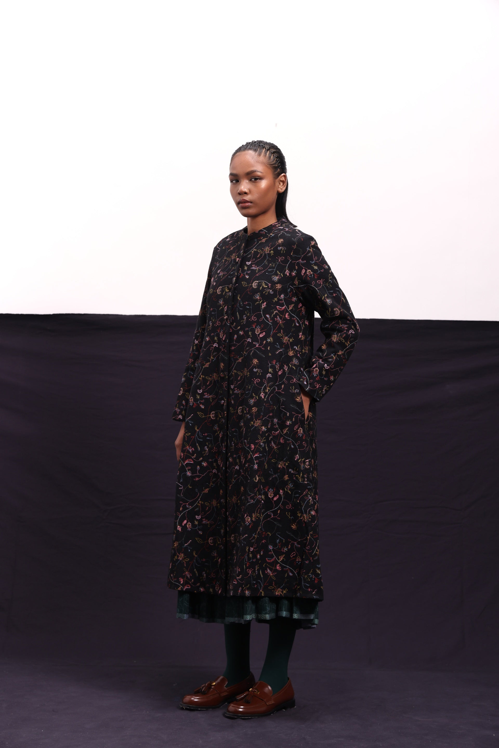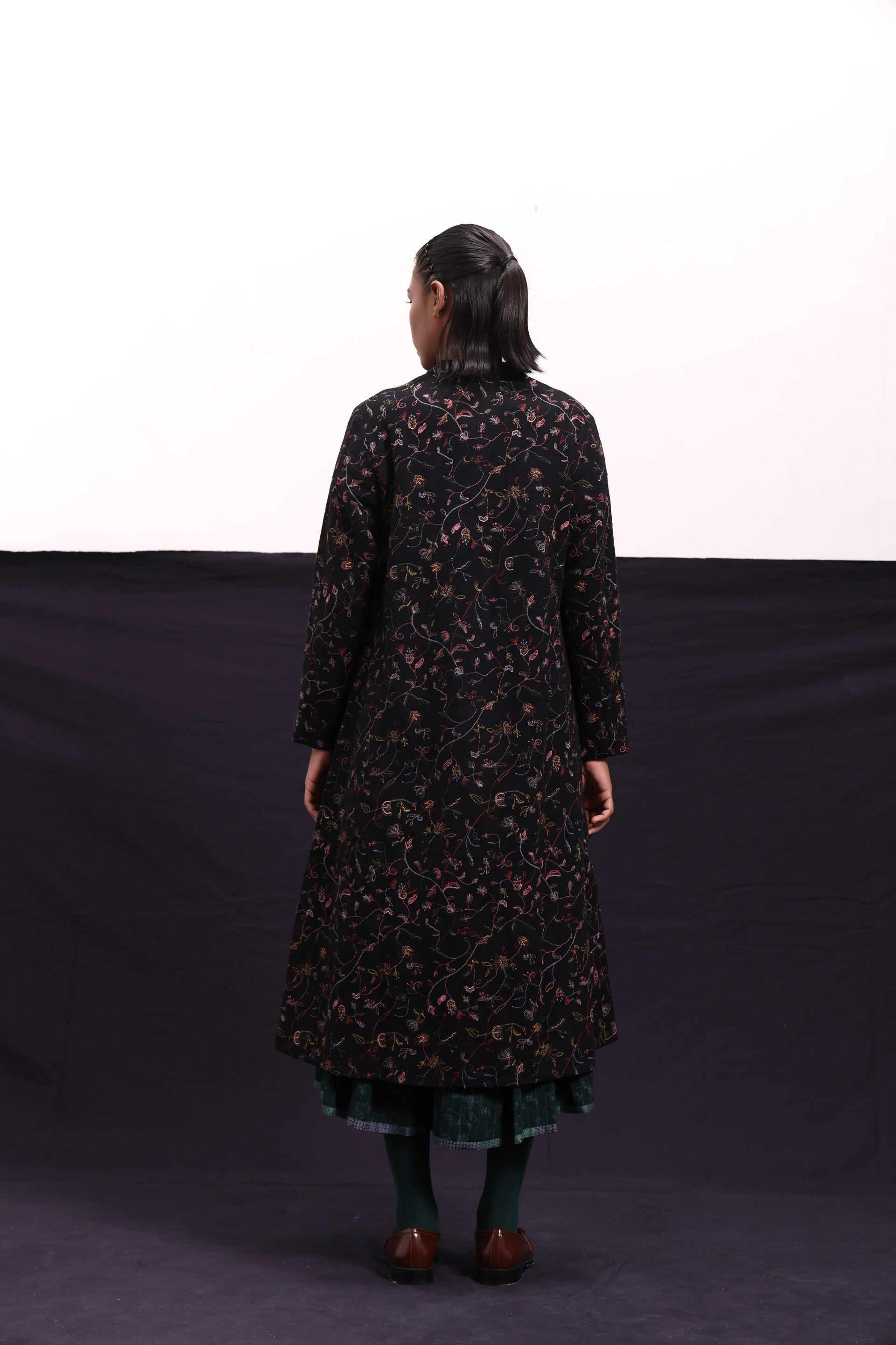 Front open jacket constructed in all over floral blocks printed wool. Comes with an attached hand block printed silk lining.