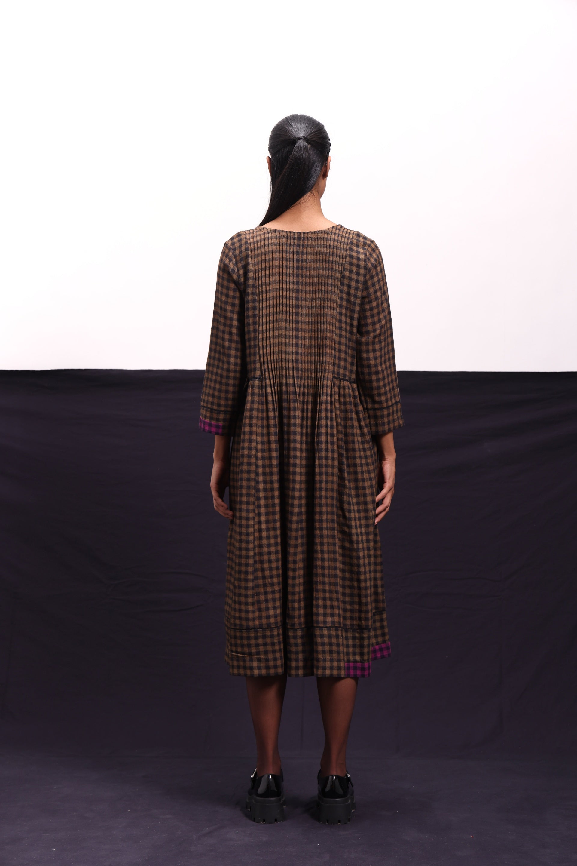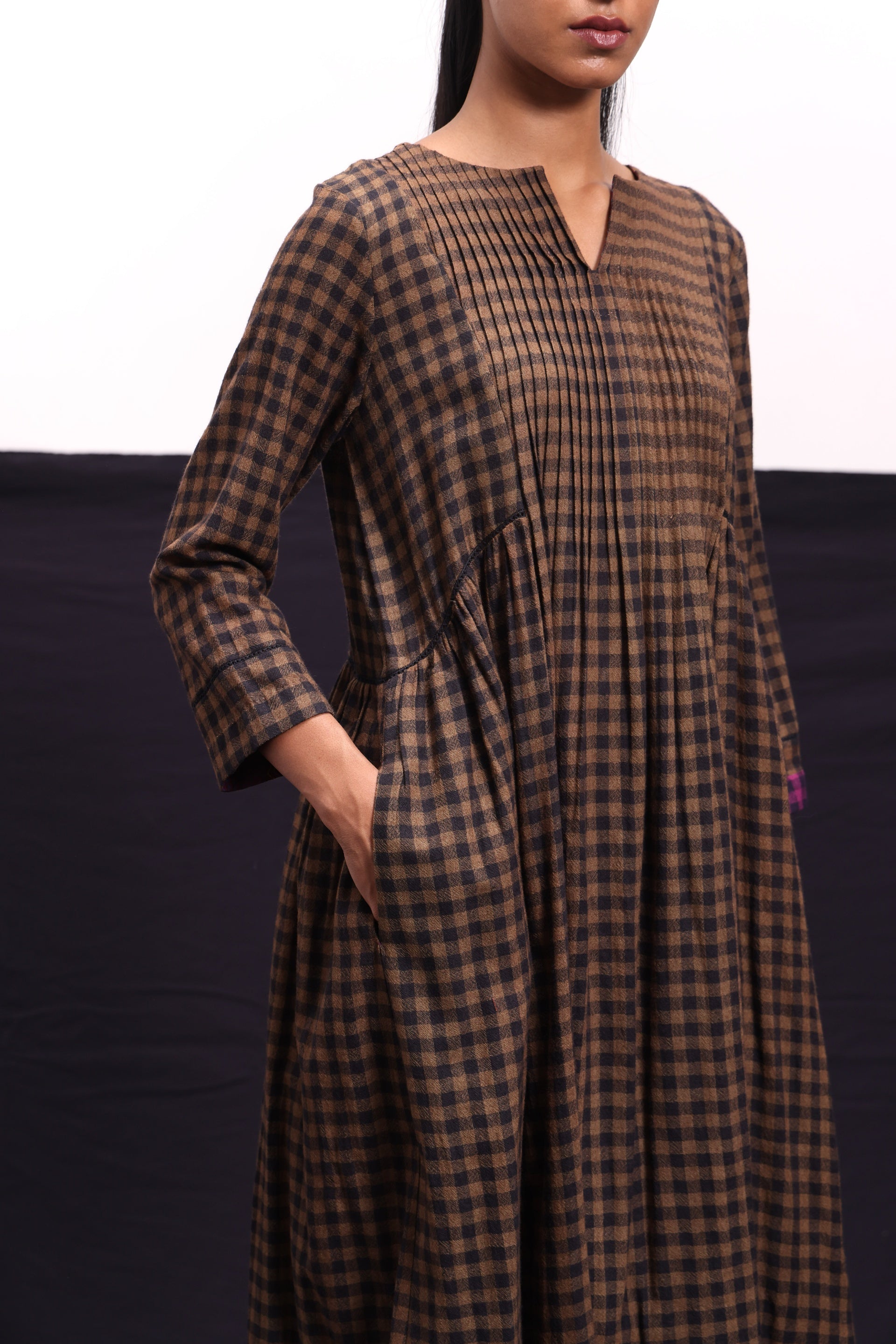 Midi dress with pintucks and lace inserts constructed in gingham checks wool.