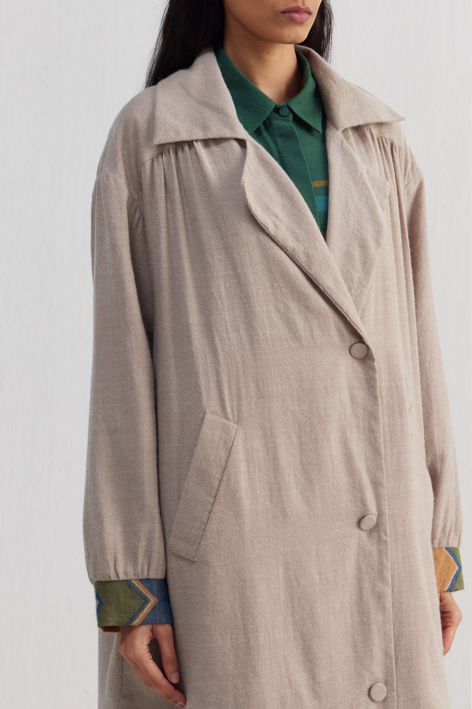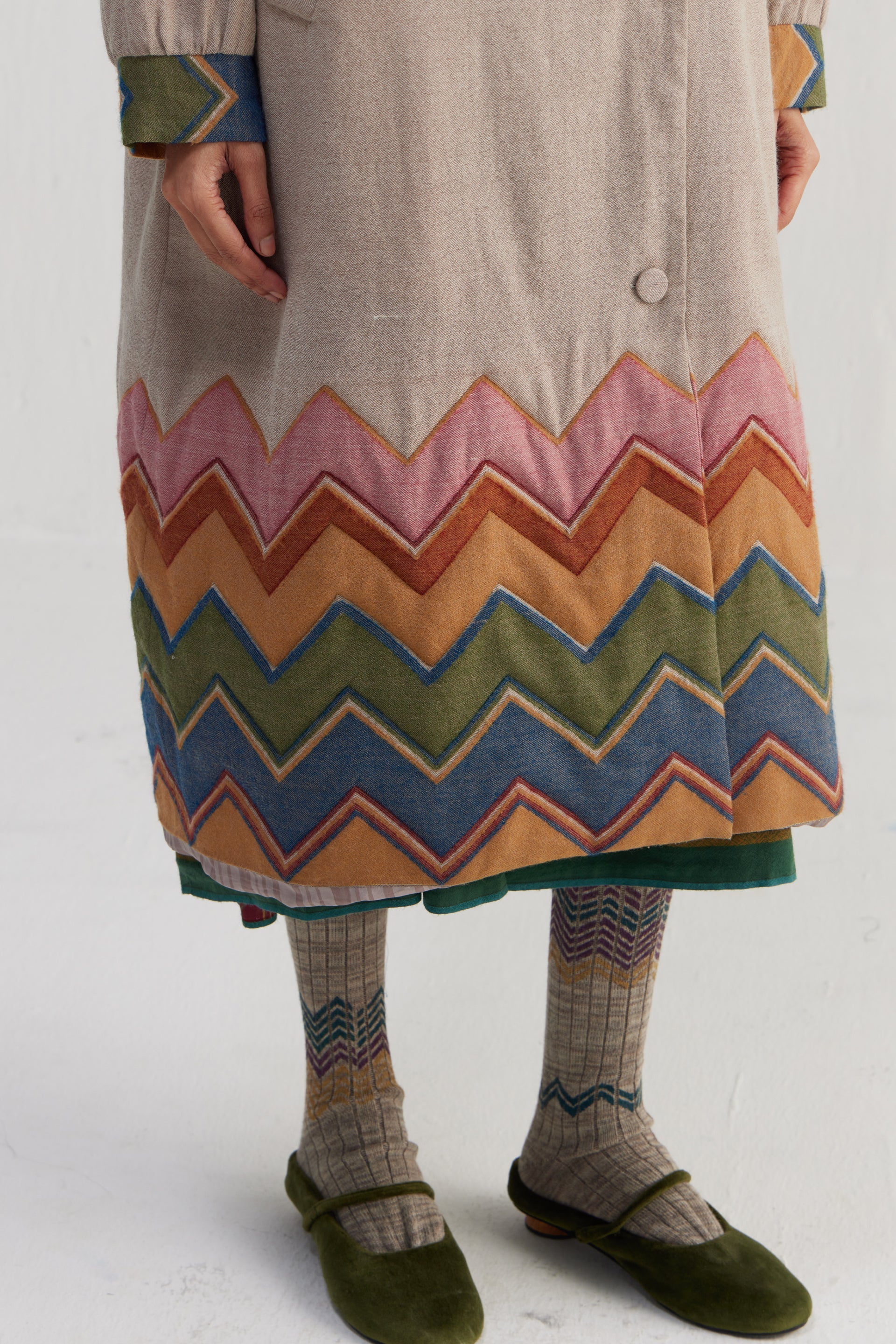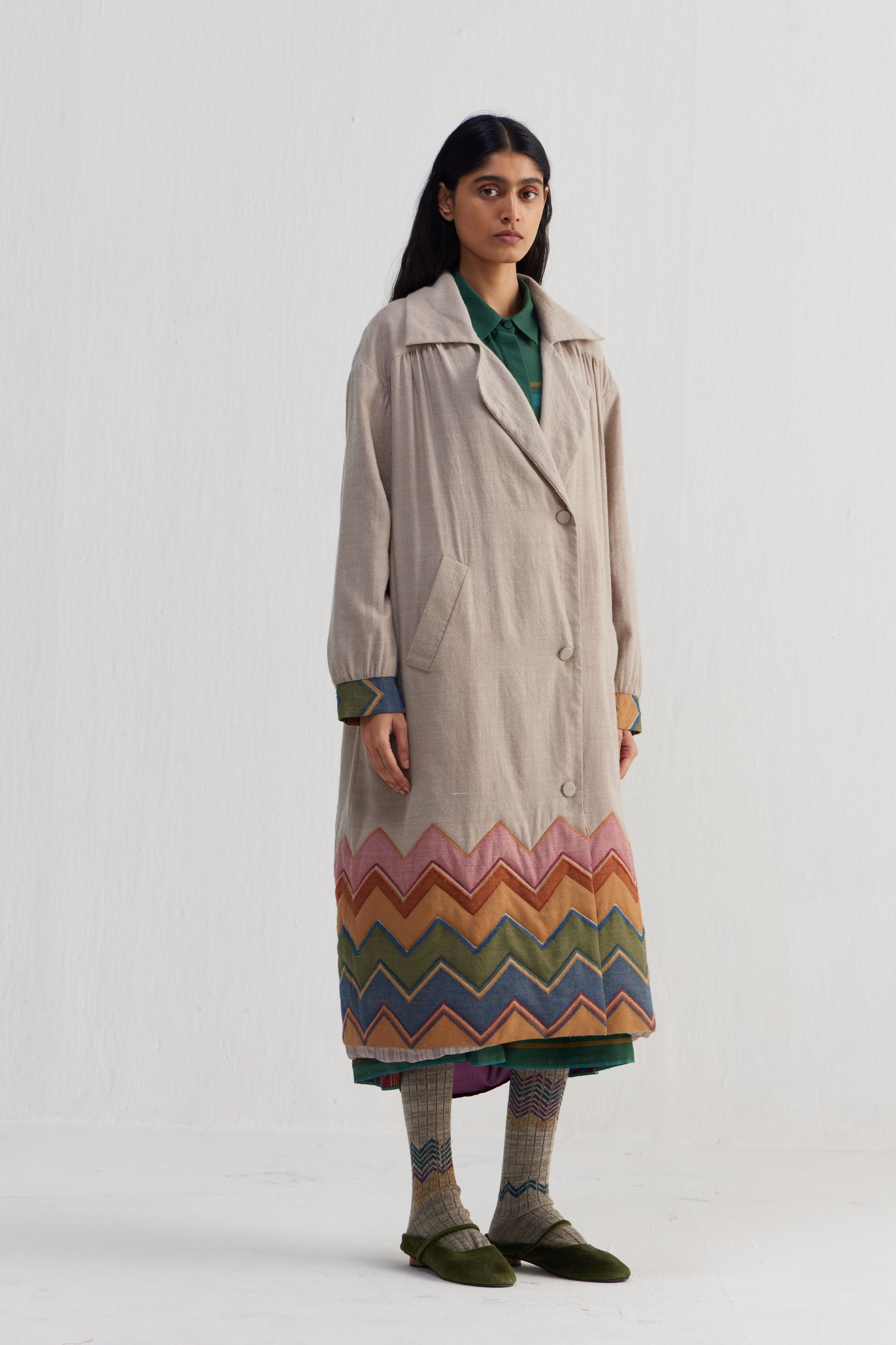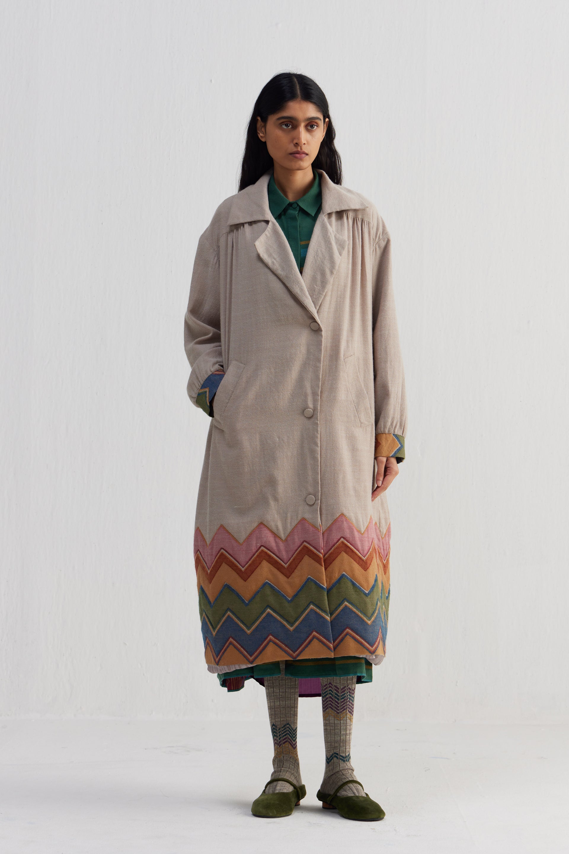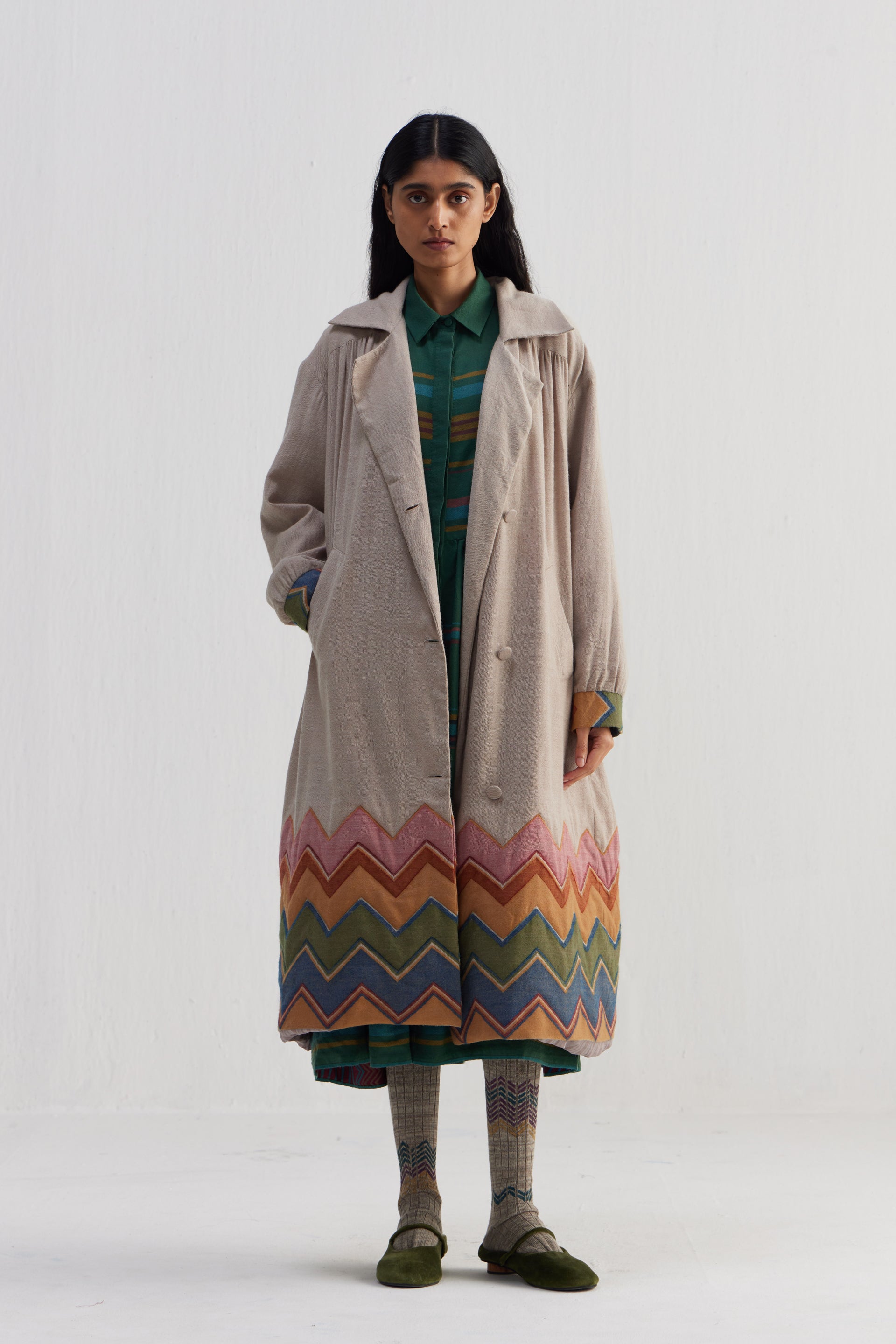 Relaxed fit notch collar double breasted long jacket with full puff sleeves and cuff detail. Constructed in multicolor chevron 100% merino wool Jacquard fabric. Finished with contrast collage hand block print 100% silk lining.