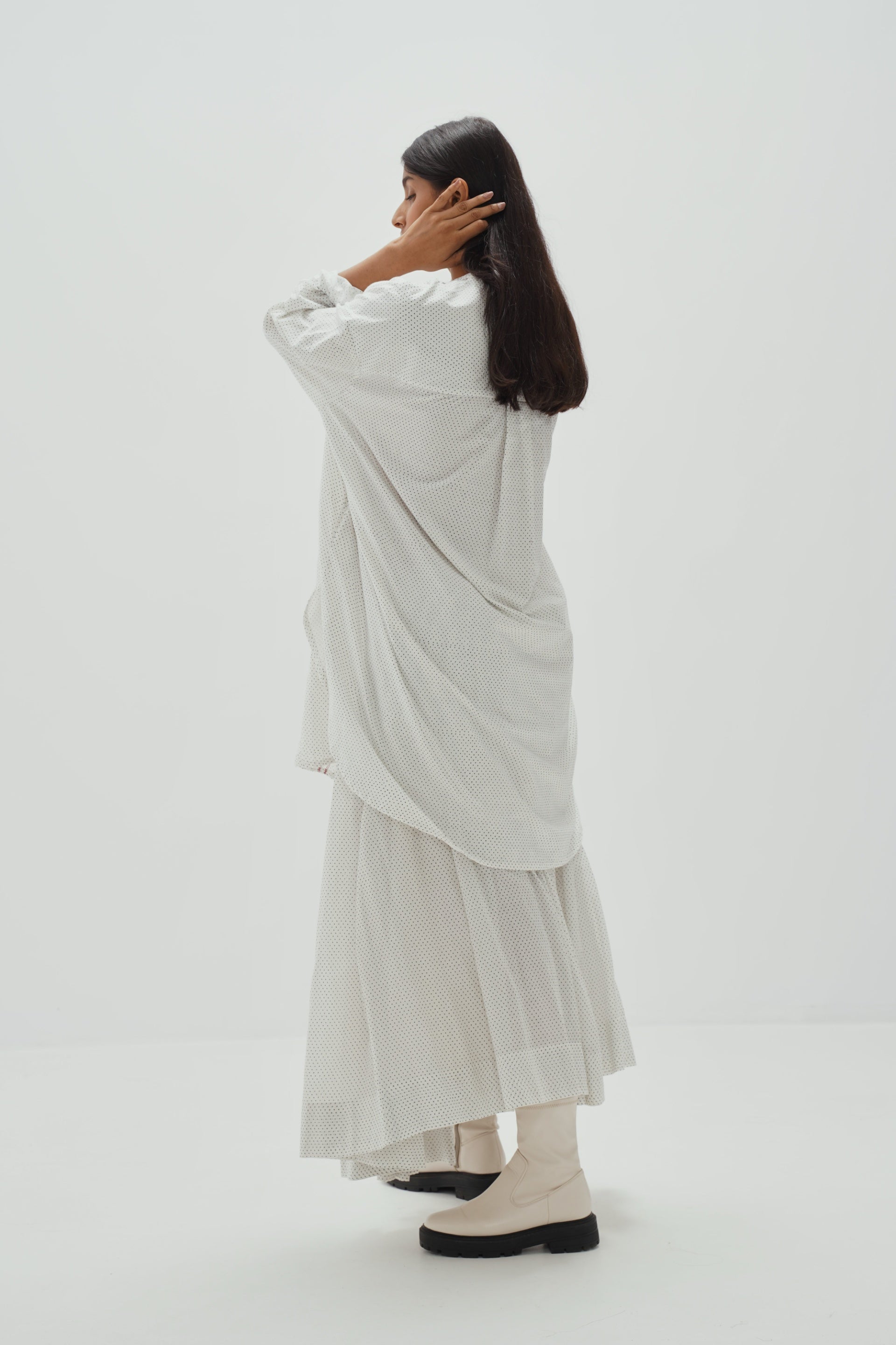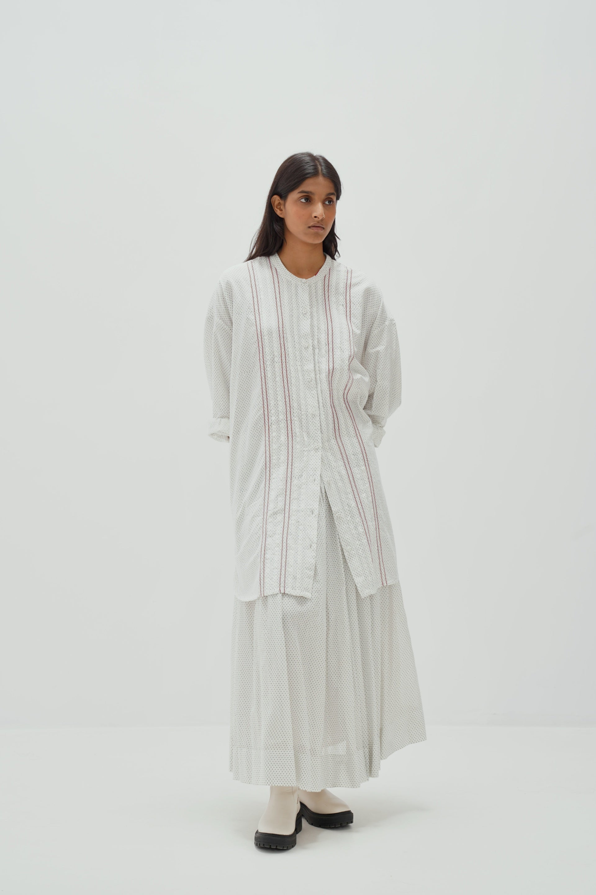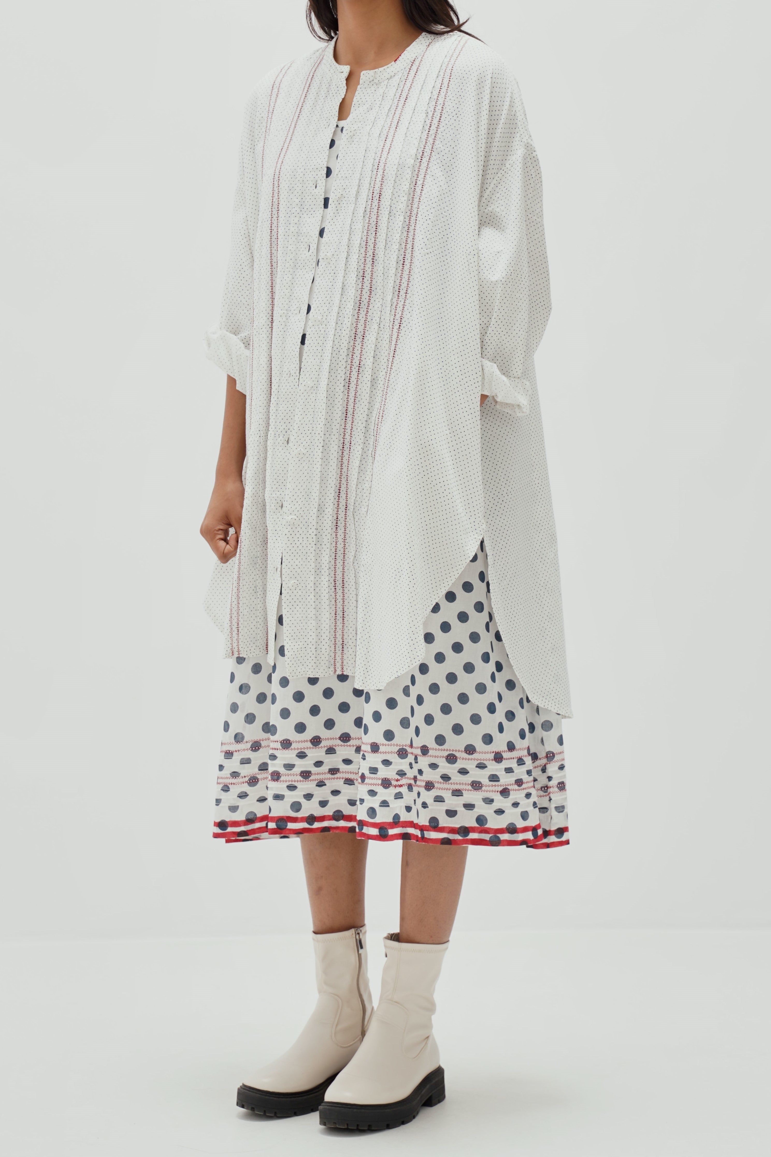 Longline, oversized button-down shirt with pintucks and contrast faggoting detail