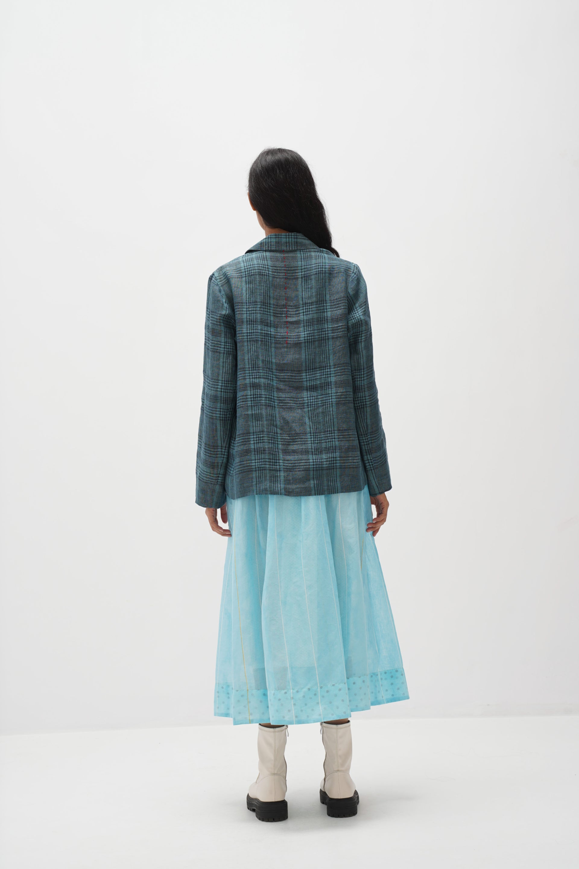 Front-open jacket with a notch collar in handwoven checkered fabric. Featuring hand embroidery detail with front patch pockets. Includes an attached hand-block printed cotton silk lining for added elegance.