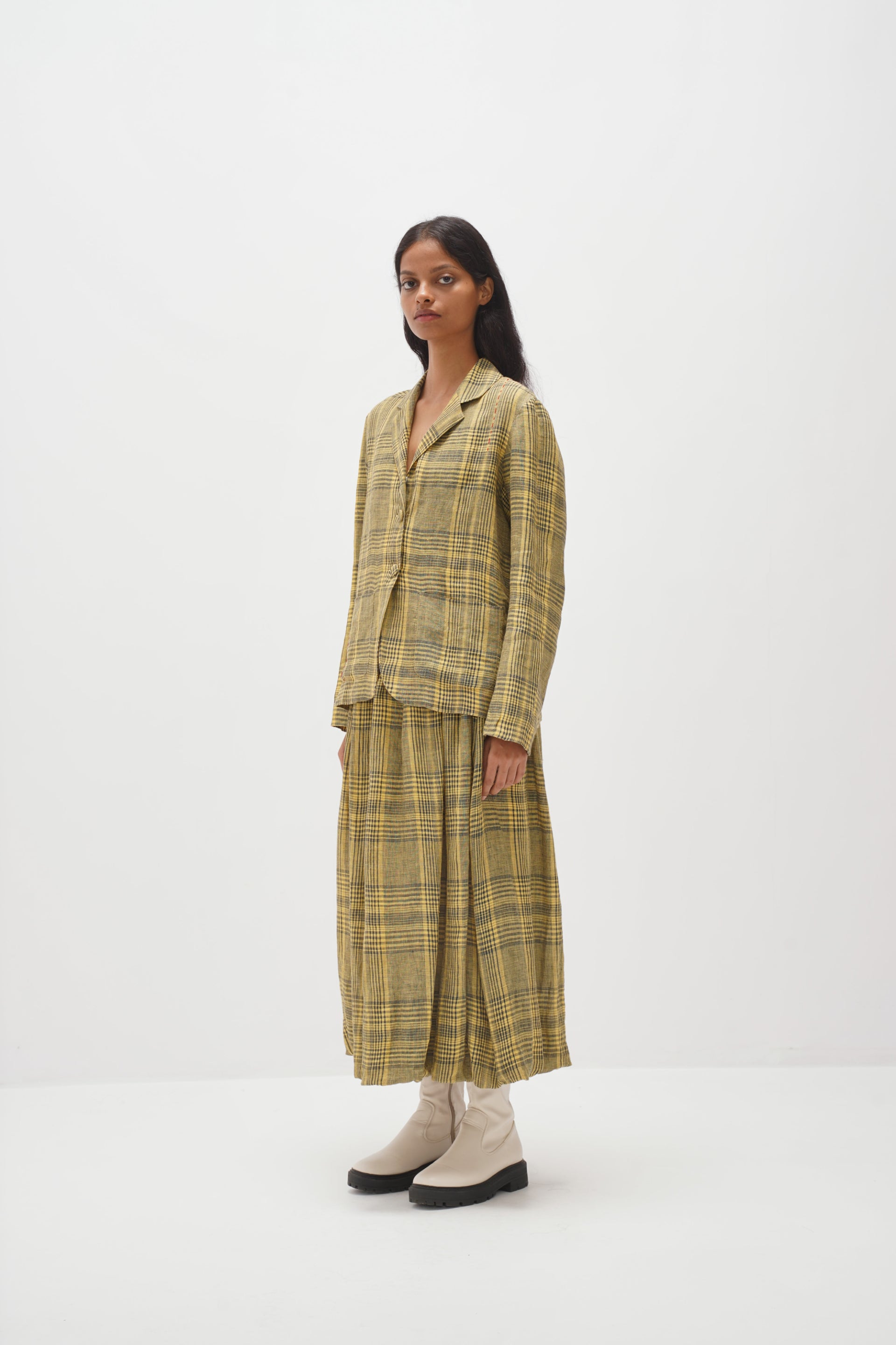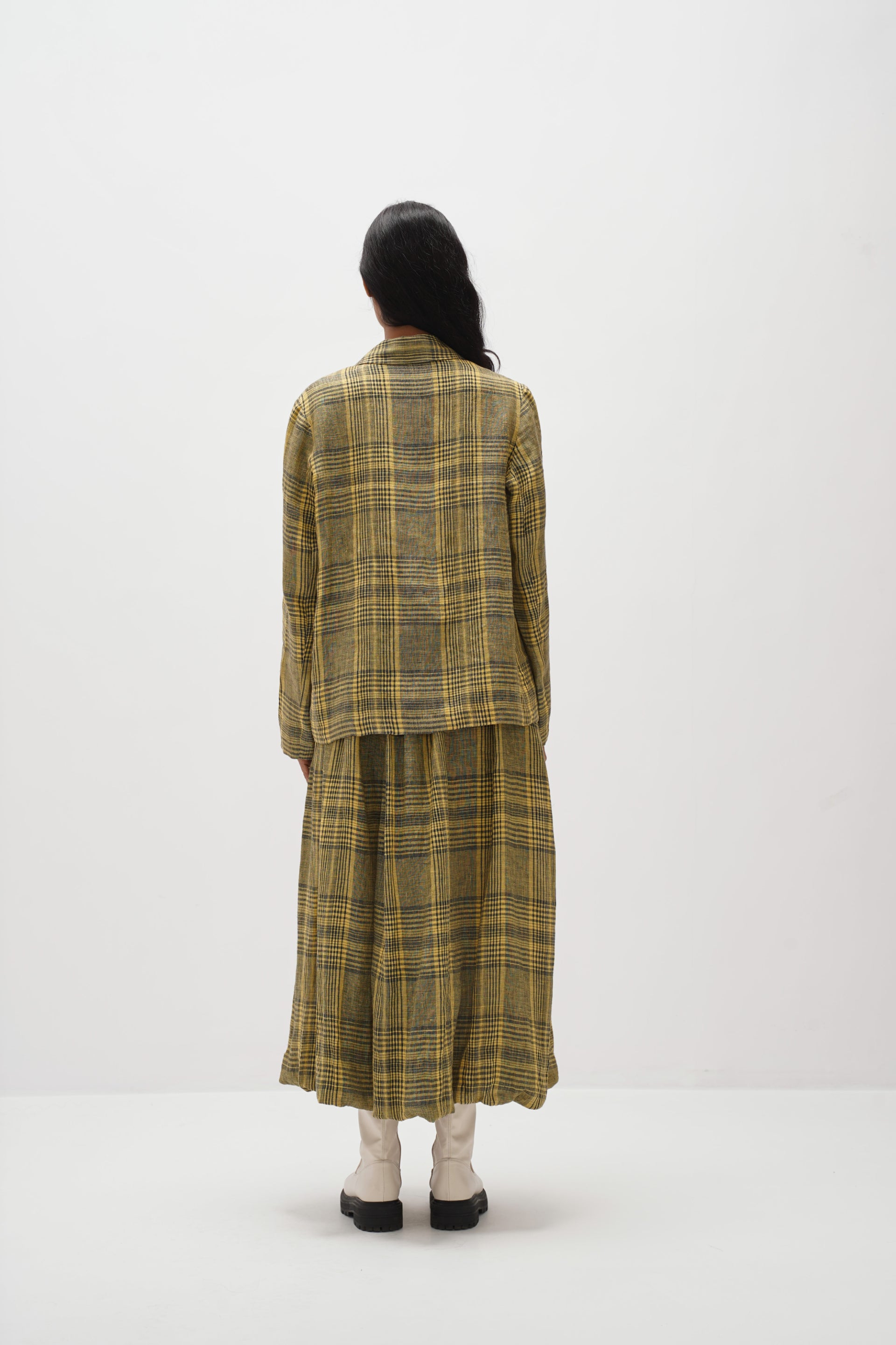 Short jacket with a notch collar in handwoven checkered fabric. Featuring hand embroidery detail and front patch pockets. Comes with an attached hand block printed cotton silk lining.