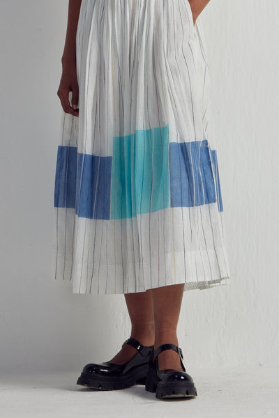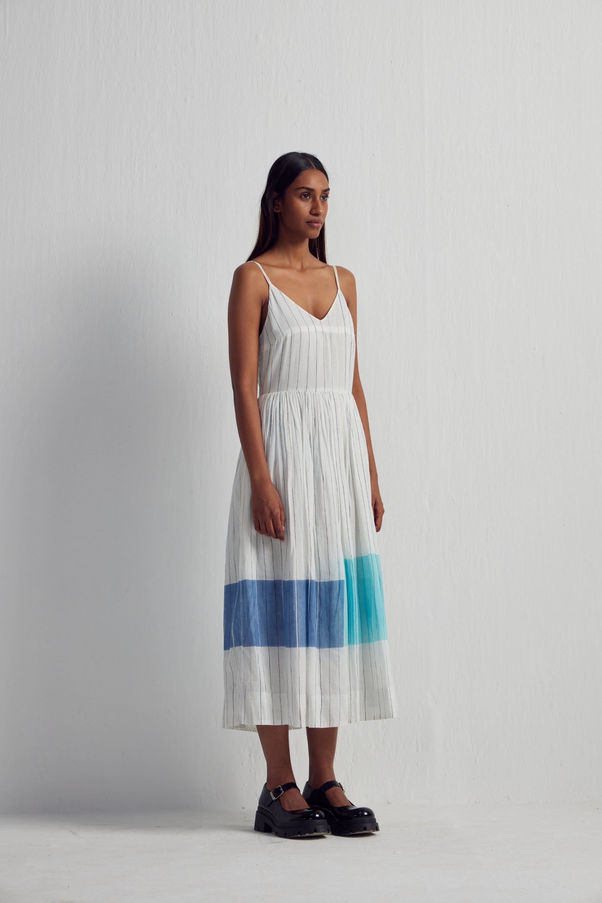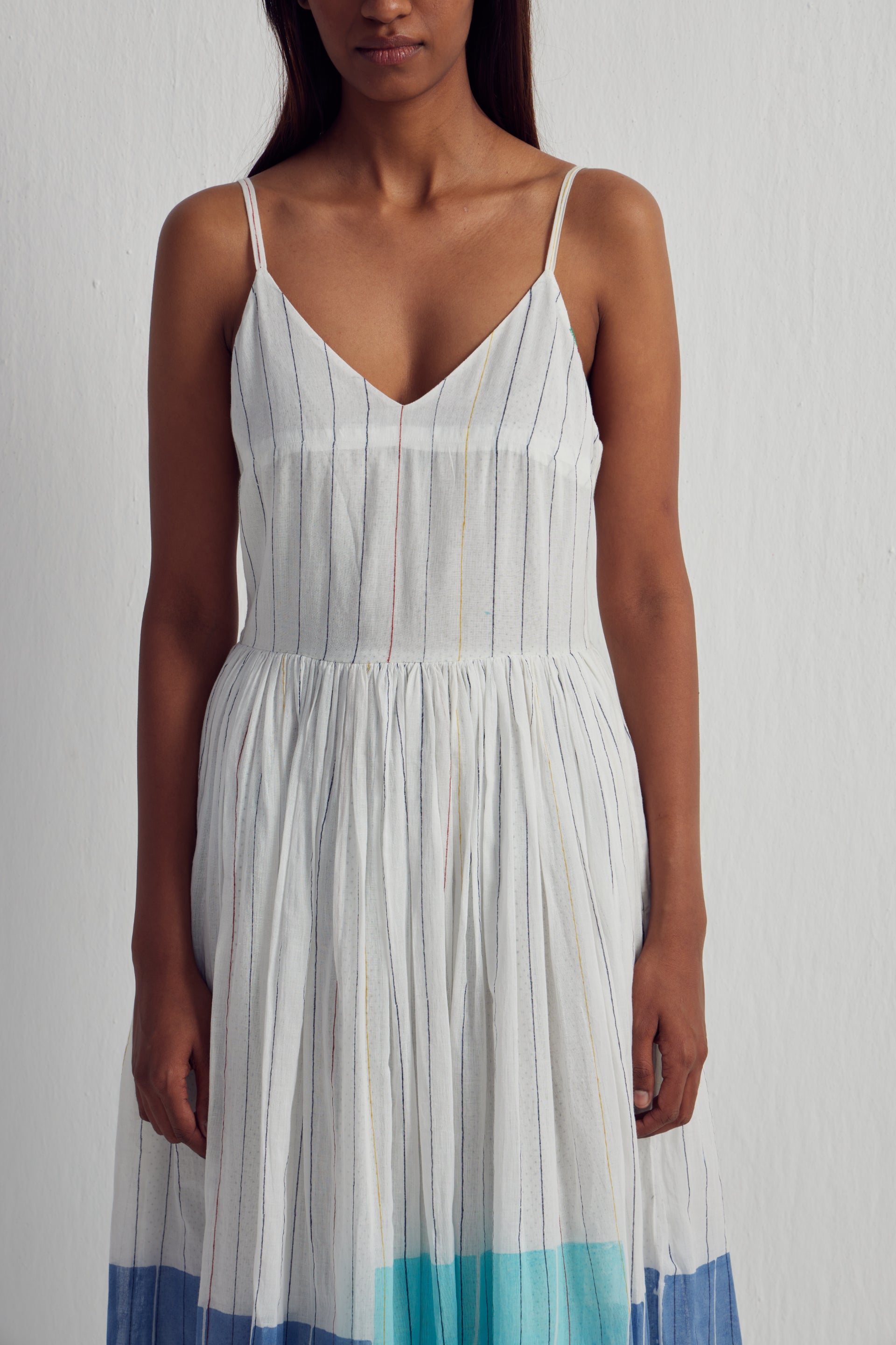 Spaghetti straps dress featuring an all-over hand-blocked stripes print with contrast hand block multi colour print panel on the bottom of the dress, detailed with gathers around the waist and back smocking detail, accompanied by an attached hand block printed cotton silk lining.
