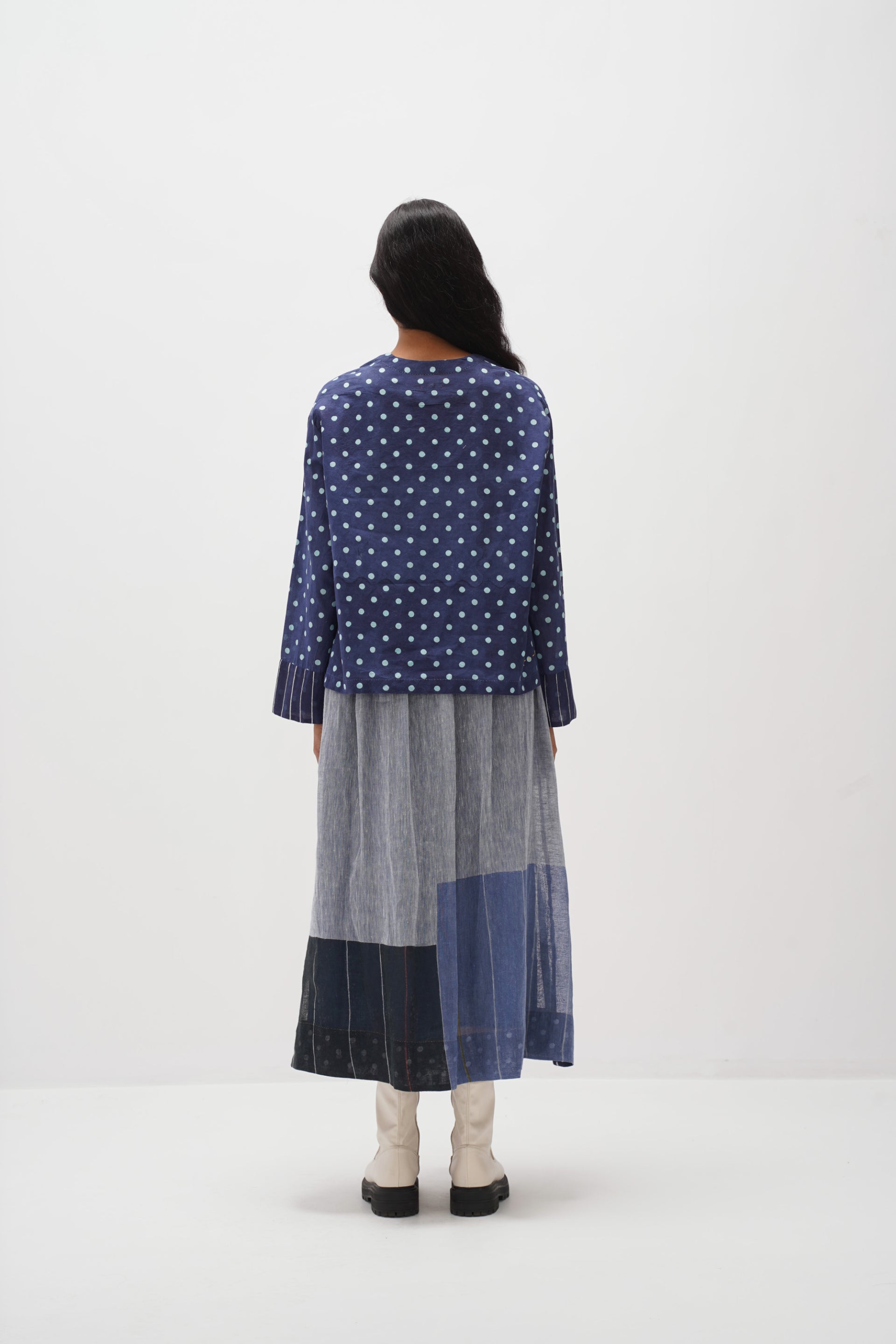 Explore our center-front open full sleeves top with a contrasting hand block stripe print placket, adorned in an all-over hand-block polka dot print with contrasting cuffs.