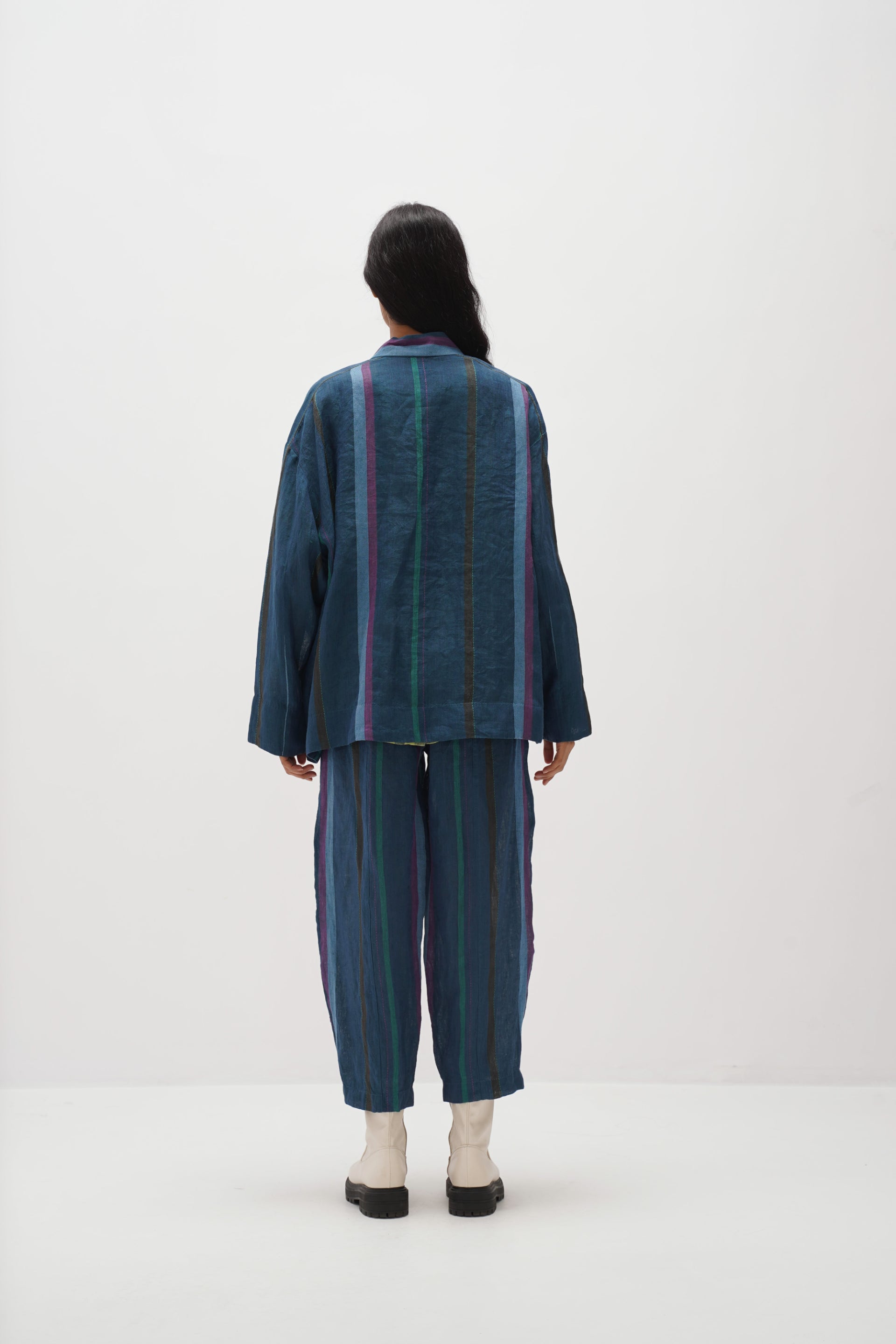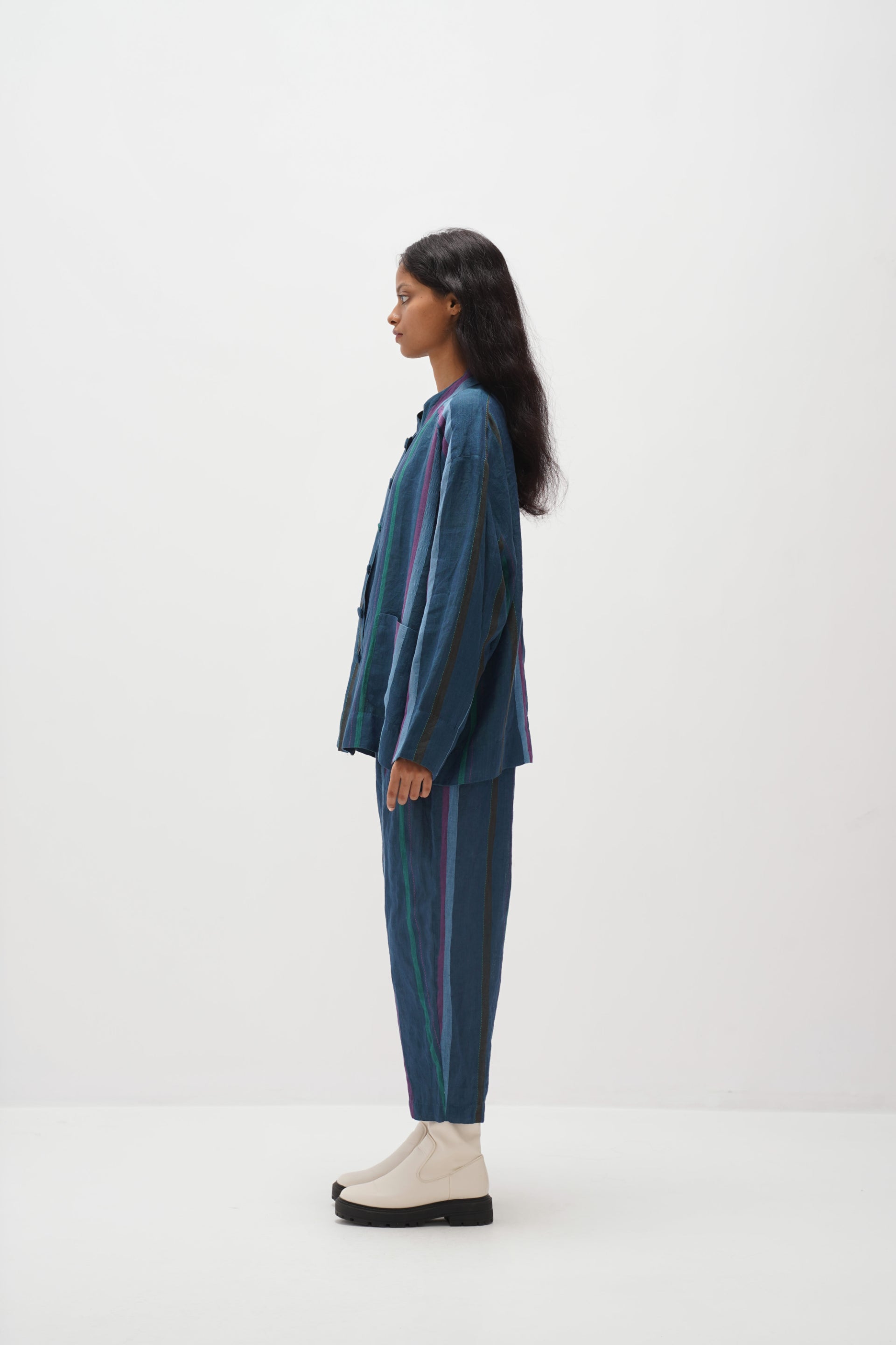 Oversized button-down jacket crafted from handwoven multi-colored thick and thin stripes. Features full sleeves and functional patch pockets.