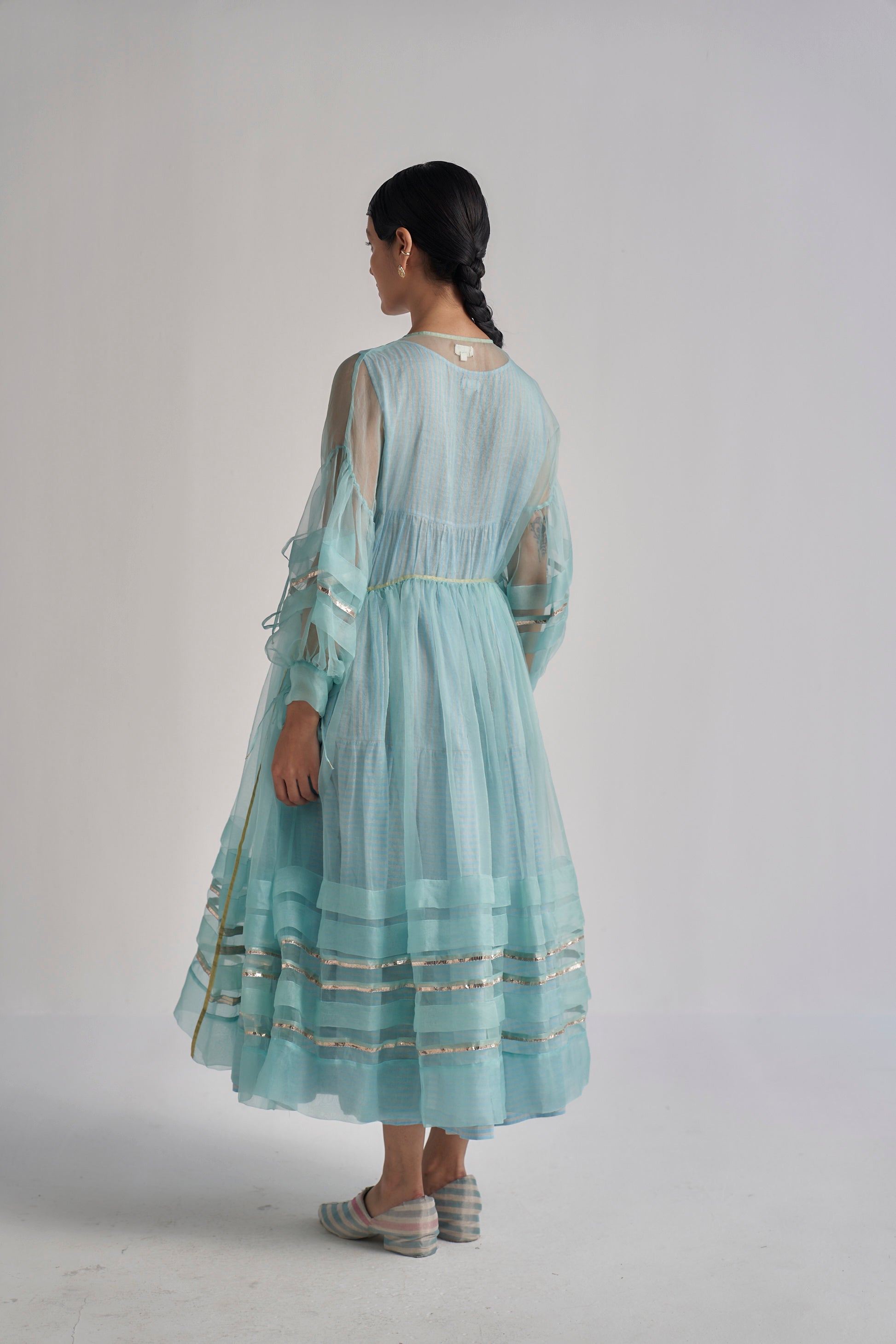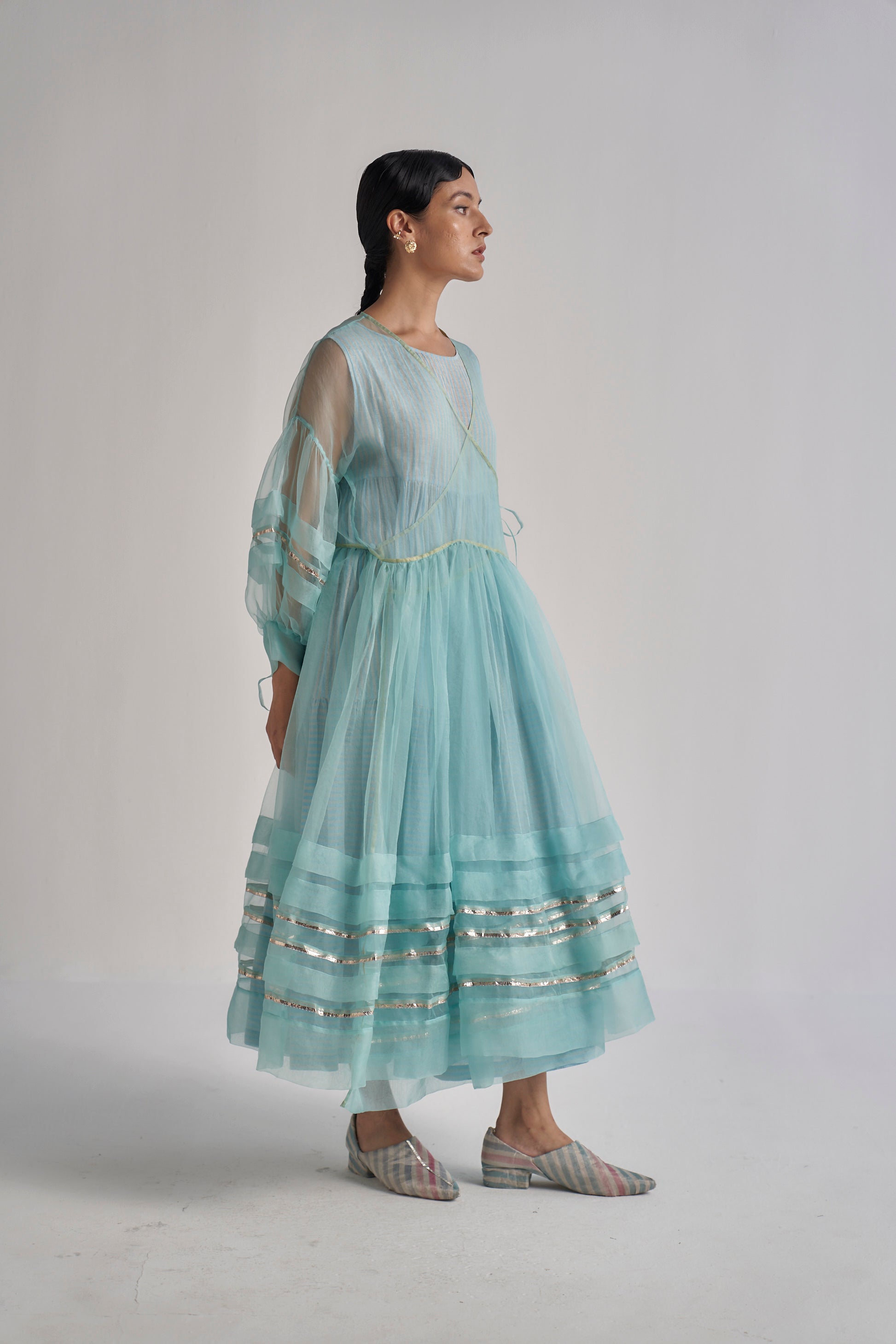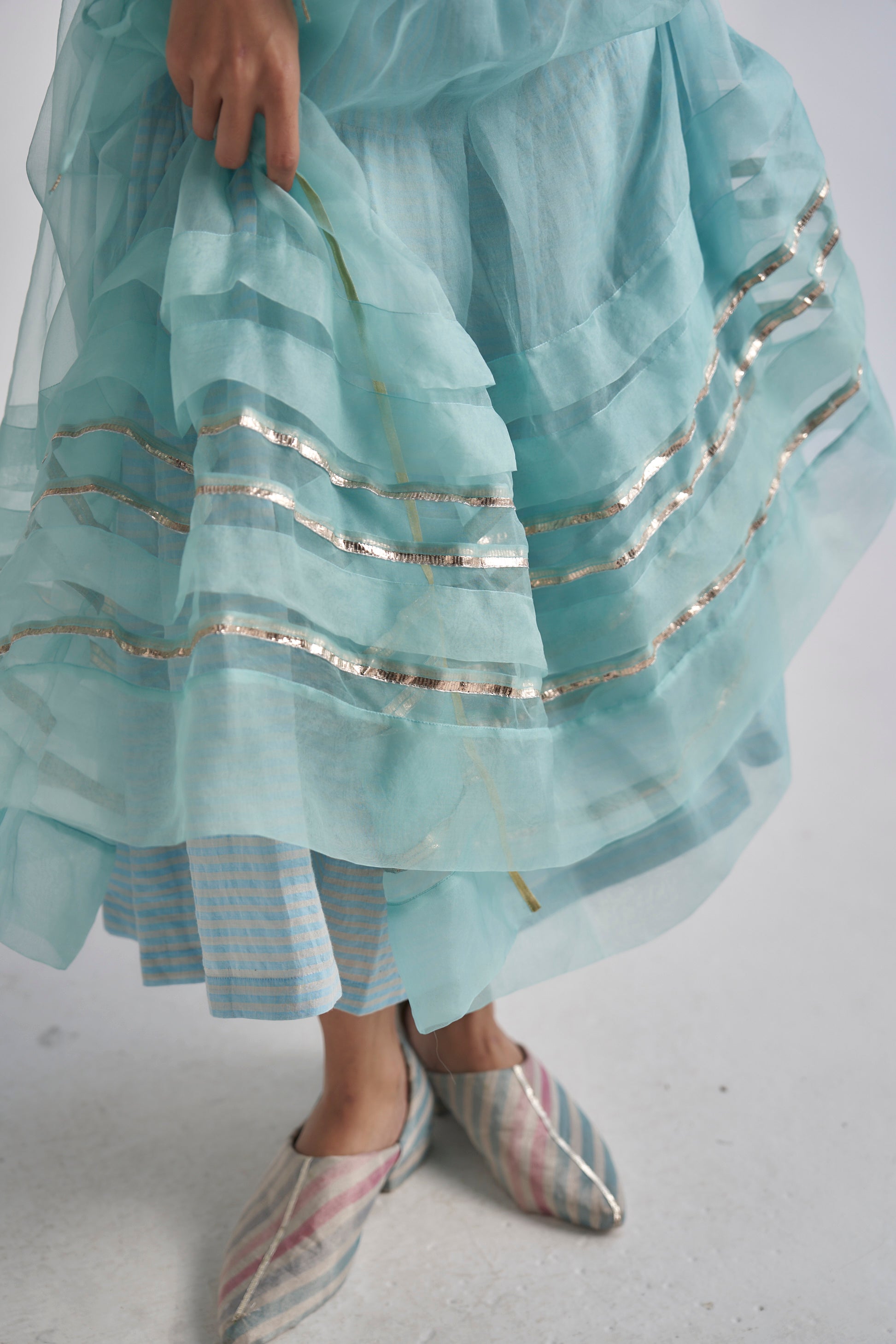 A tiered wrap-around overlay in organza, with metallic gota details on the hemline and sleeves , comes along with a separate hand block printed cotton silk lining.