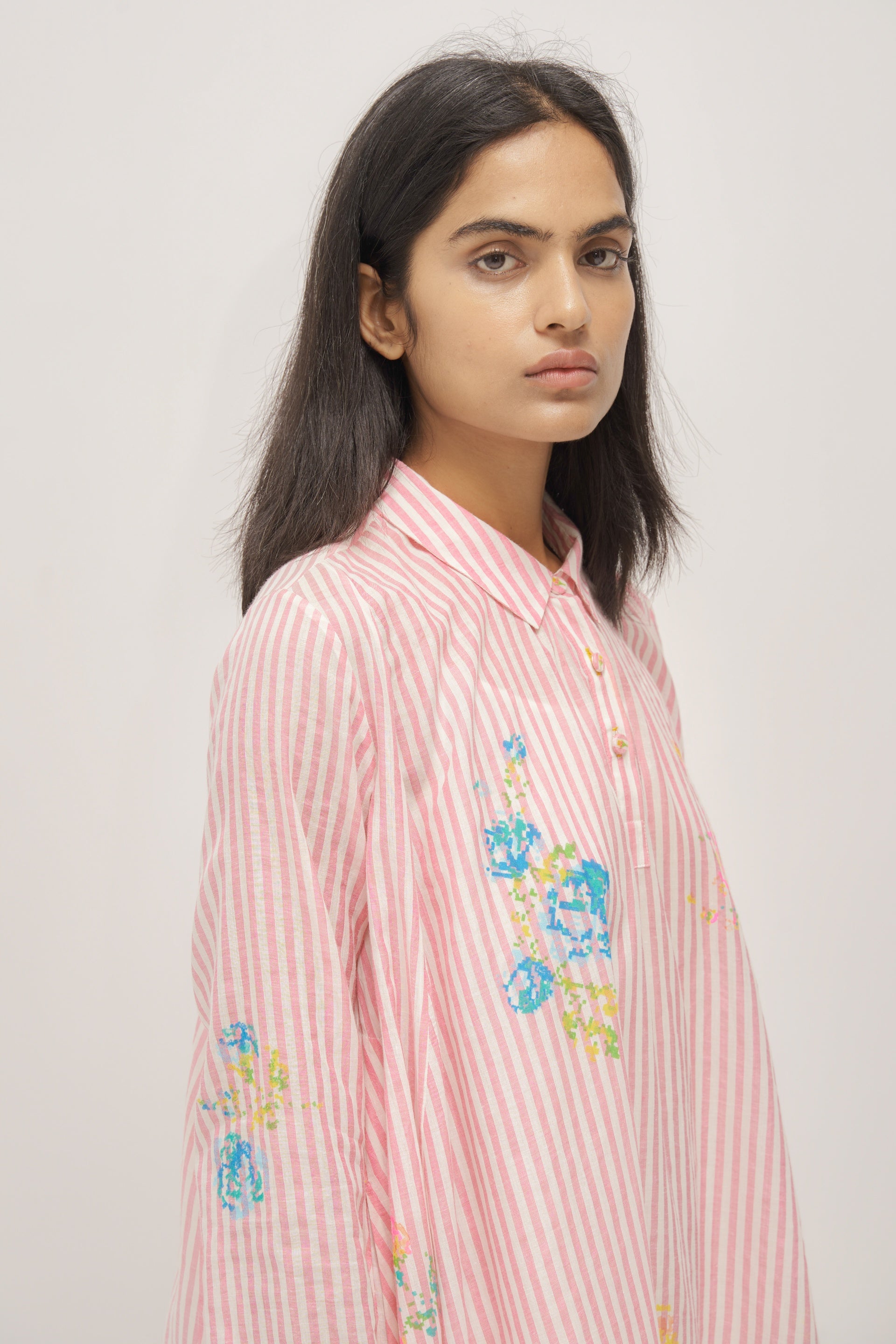 Pink A-line dress in cotton silk handloom with striper and polka printed base and multicolor floral placement print. Comes with a plain white cotton silk lining.