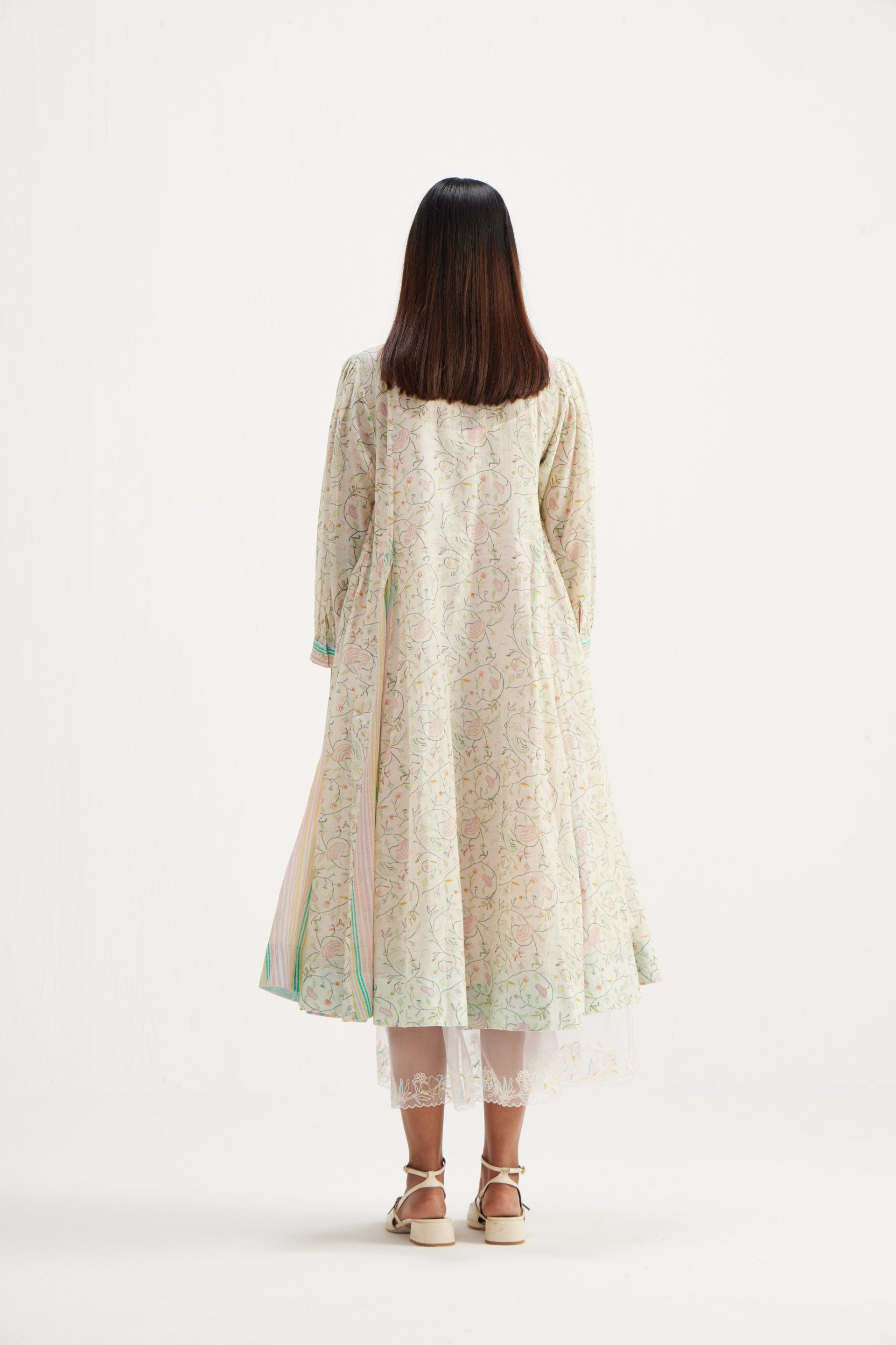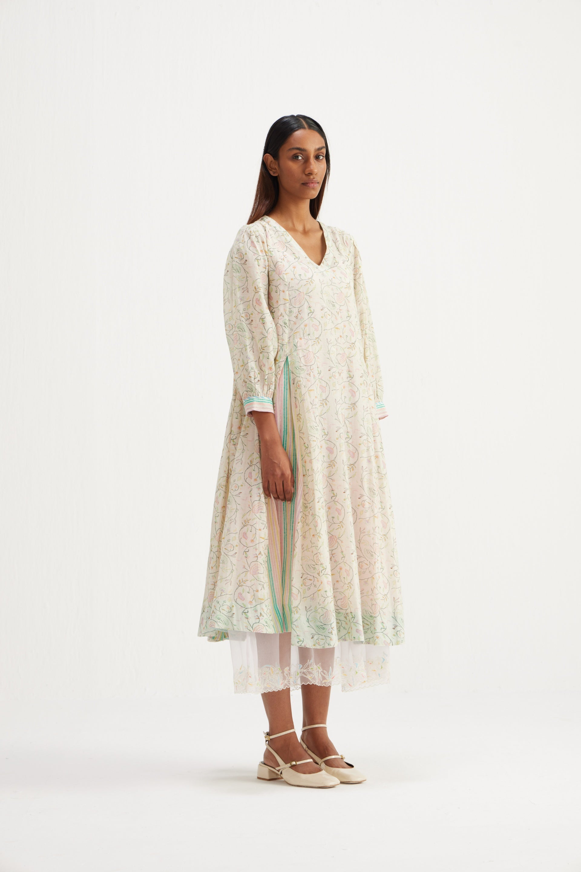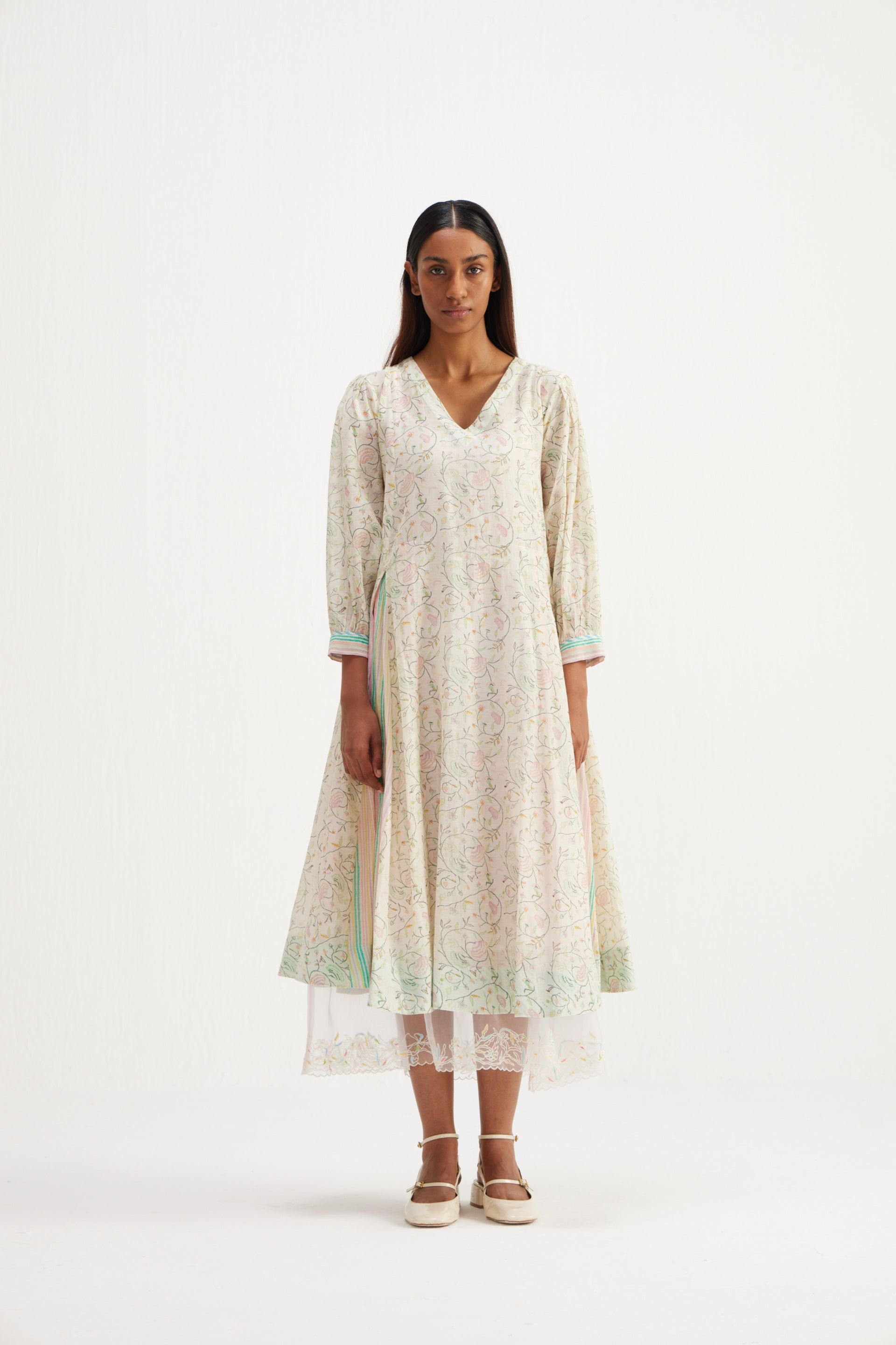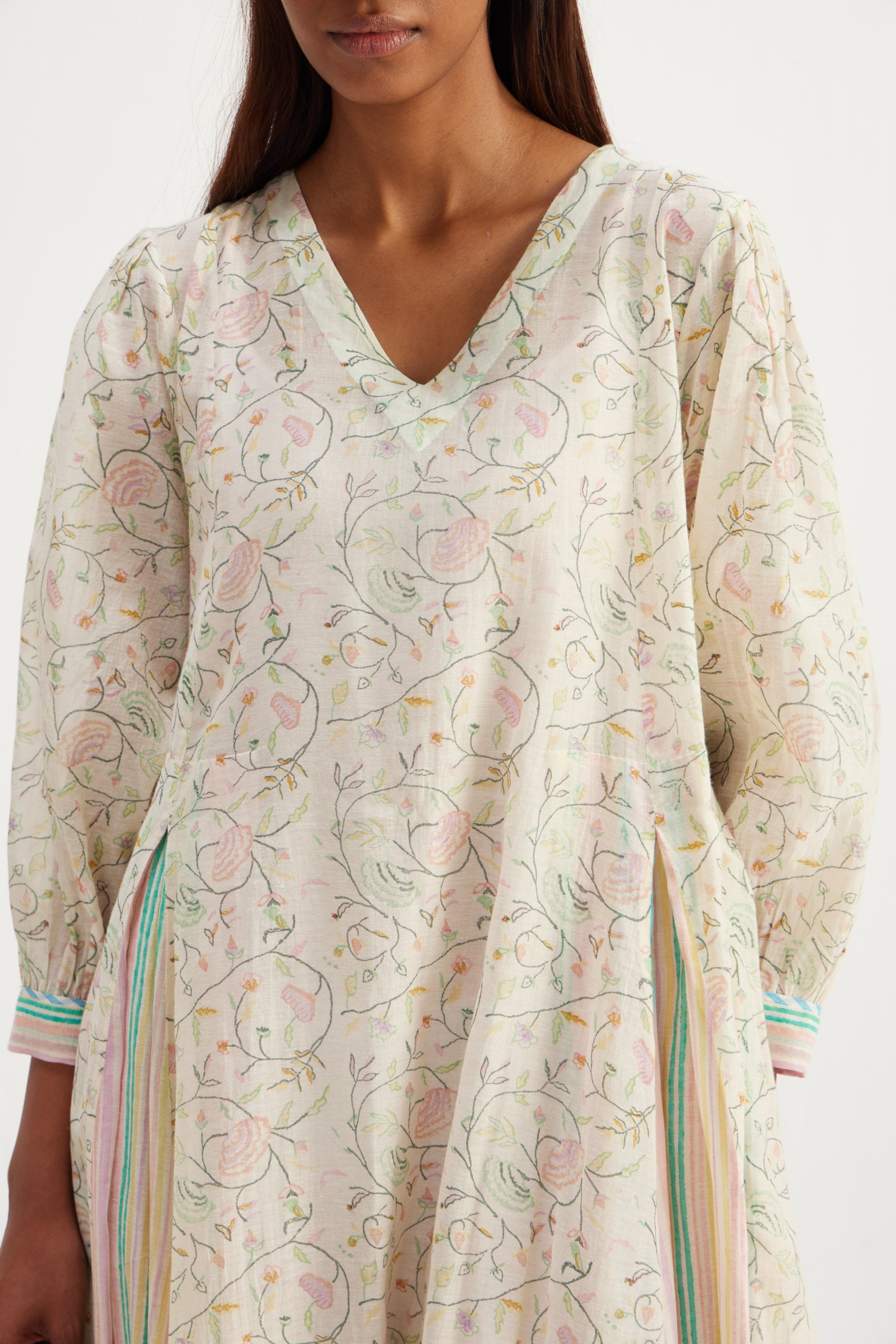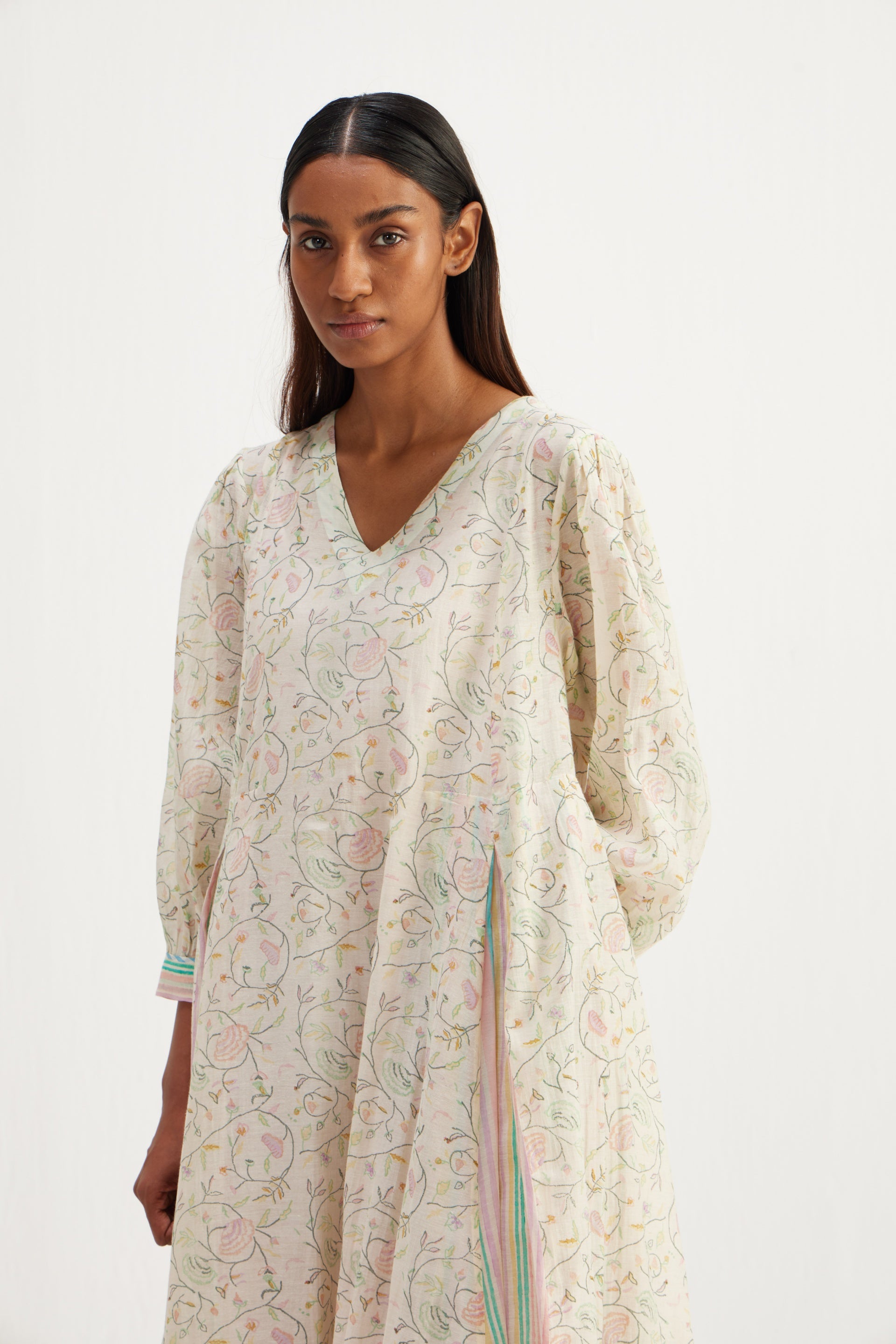 Midi dress in all over hand block floral bird print with multi striper inverted box pleat panels.