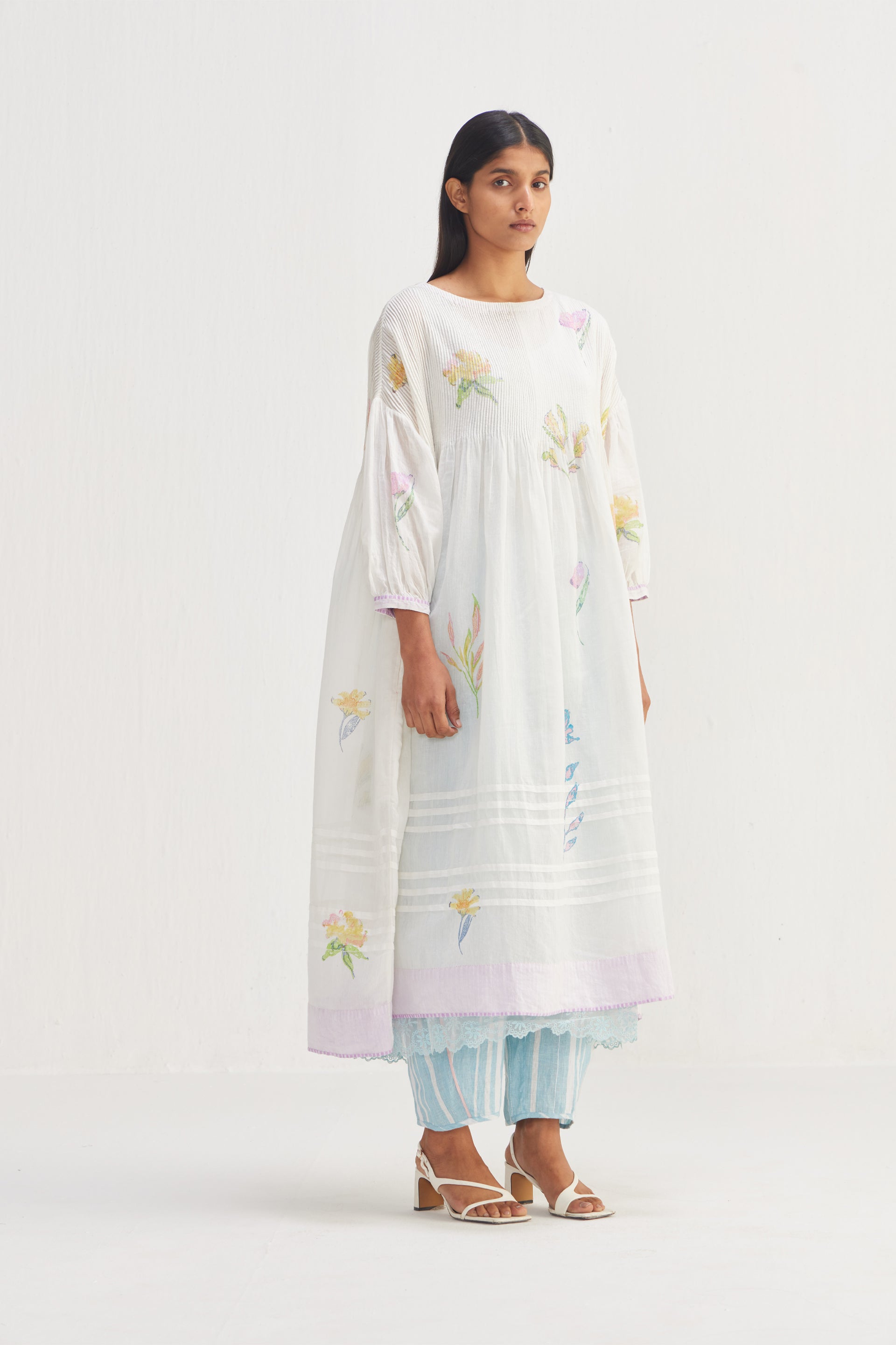A perfect blend of artistry designed to make a statement with its sophisticated details and vibrant patterns. The dress features an all-round pin tucks design, where delicate, evenly spaced tucks encircle the bodice, adding texture and creating a flattering, structured silhouette. These pin tucks are meticulously crafted, giving the dress a refined look while enhancing the overall fit. The floral motifs are created using a combination of 3-4 hand-carved blocks, layered to achieve a rich and detailed pattern. Comes with separate cotton silk lining.