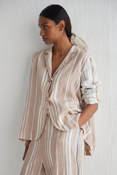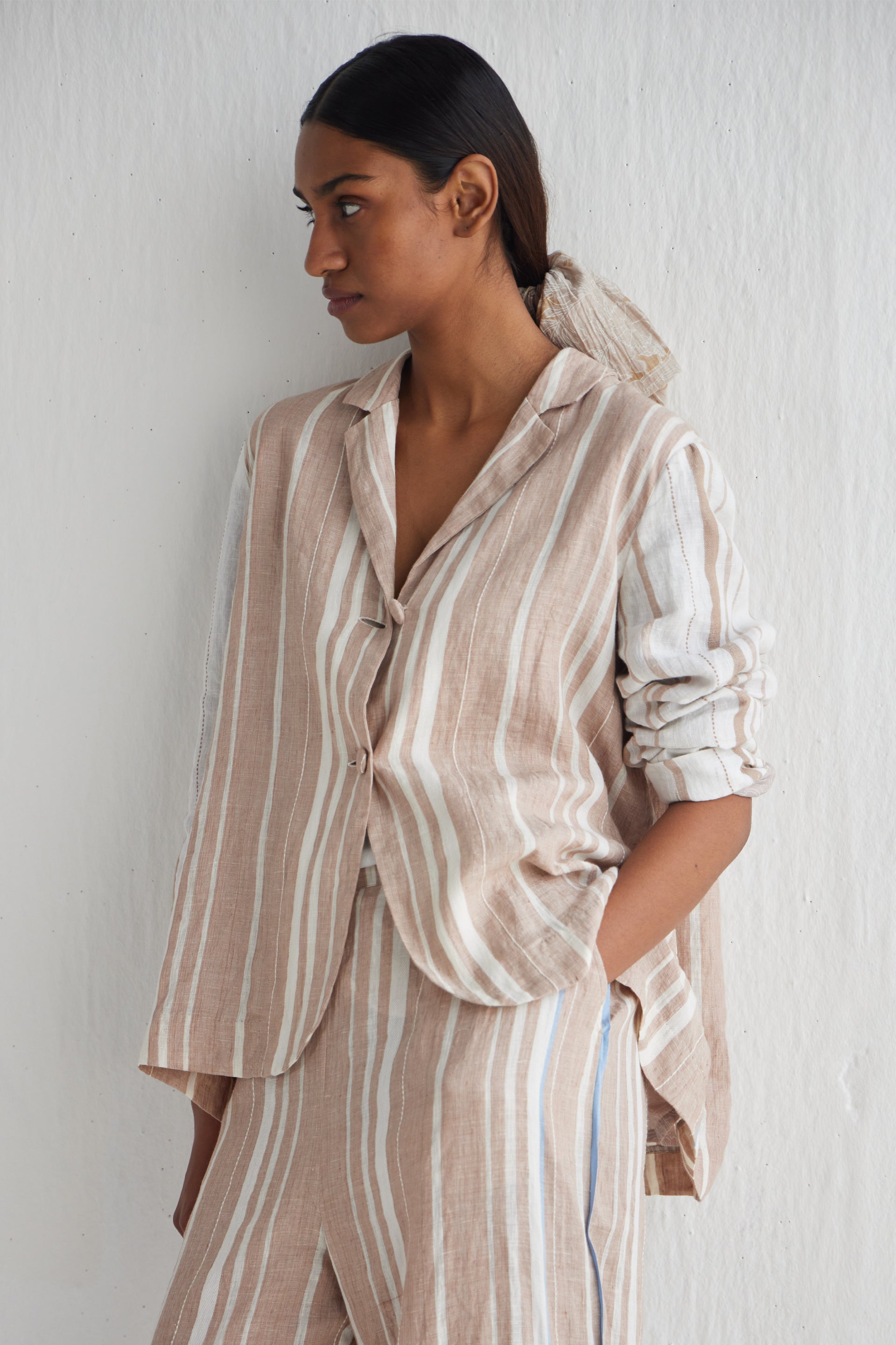 This short striper blazer combines classic tailoring with modern design elements, making it a versatile and stylish, the blazer's sharp lines and structured silhouette are softened by the playful contrast details. Comes with an attached floral printed lining.