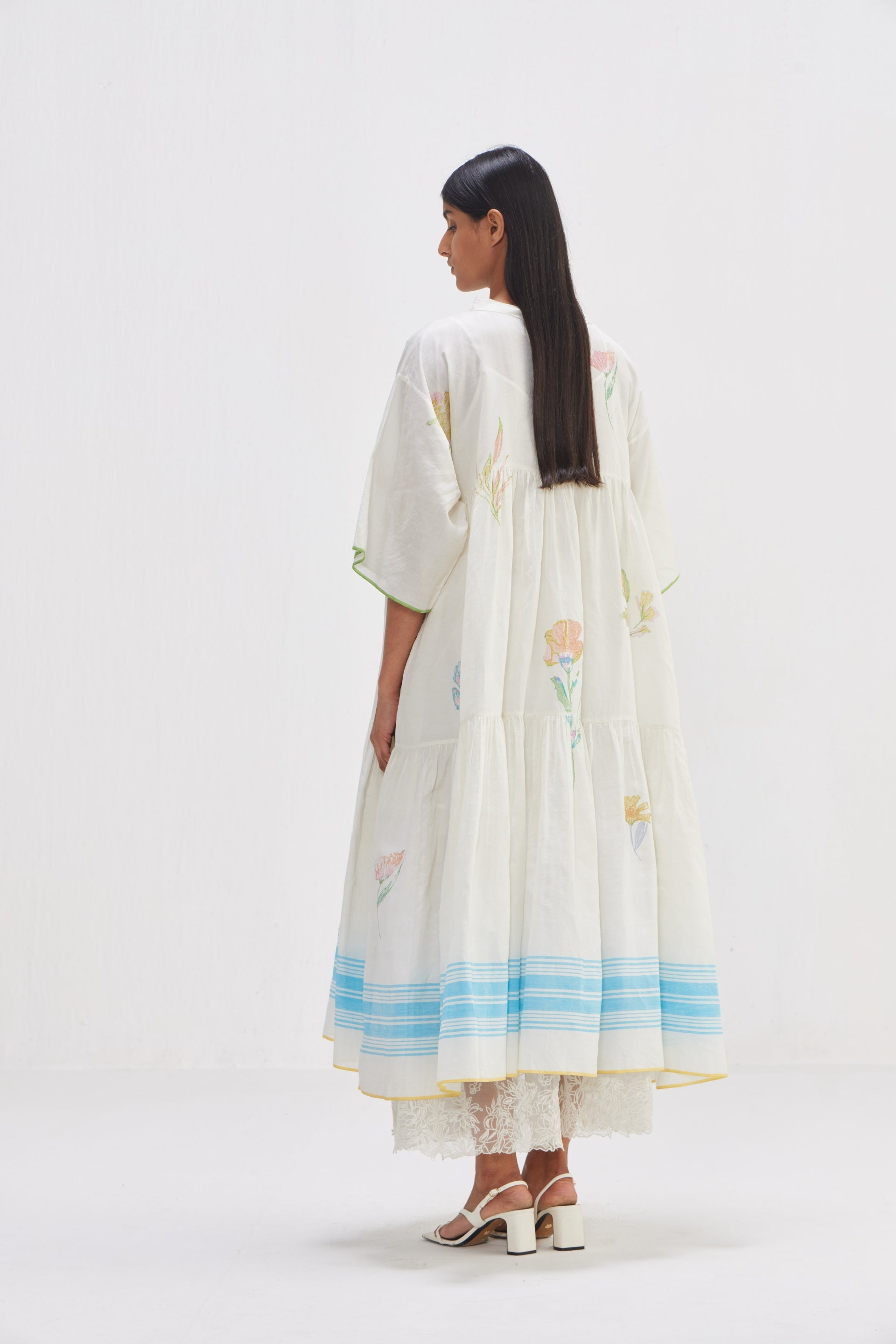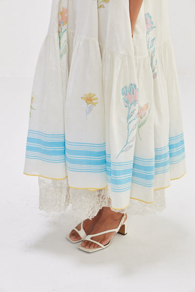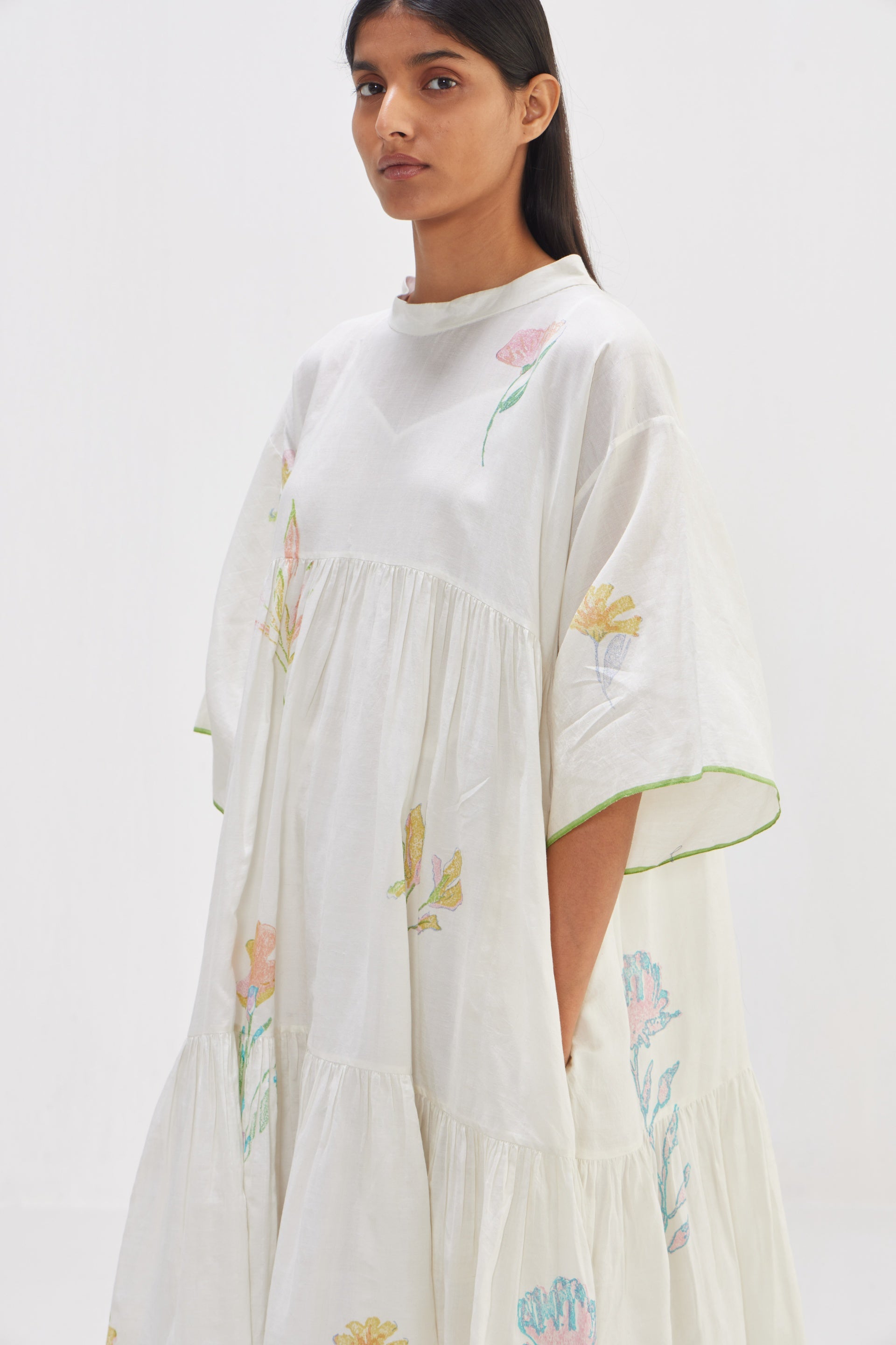 Tiered dress in multicolor placement hand block floral print and contrast woven border design.