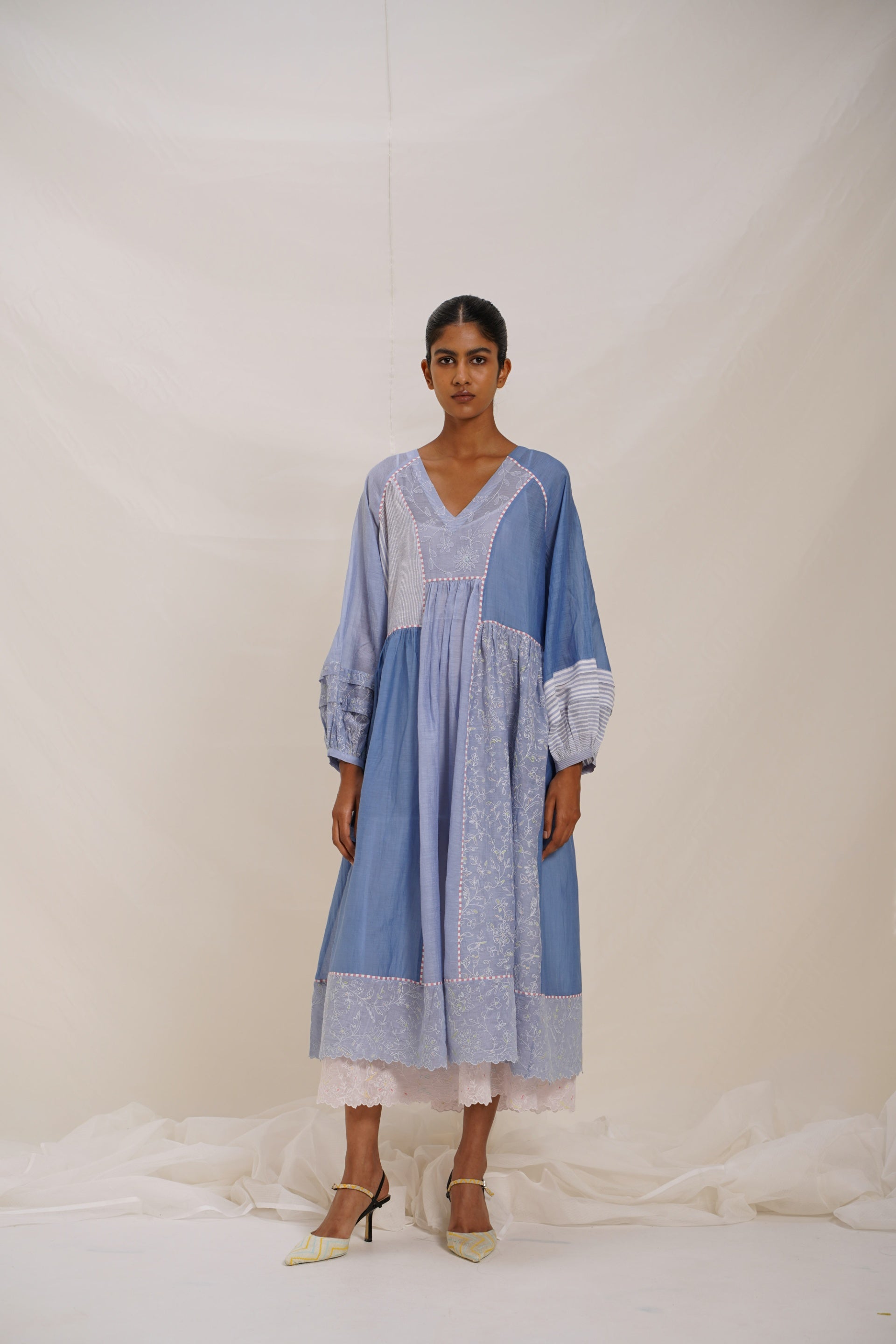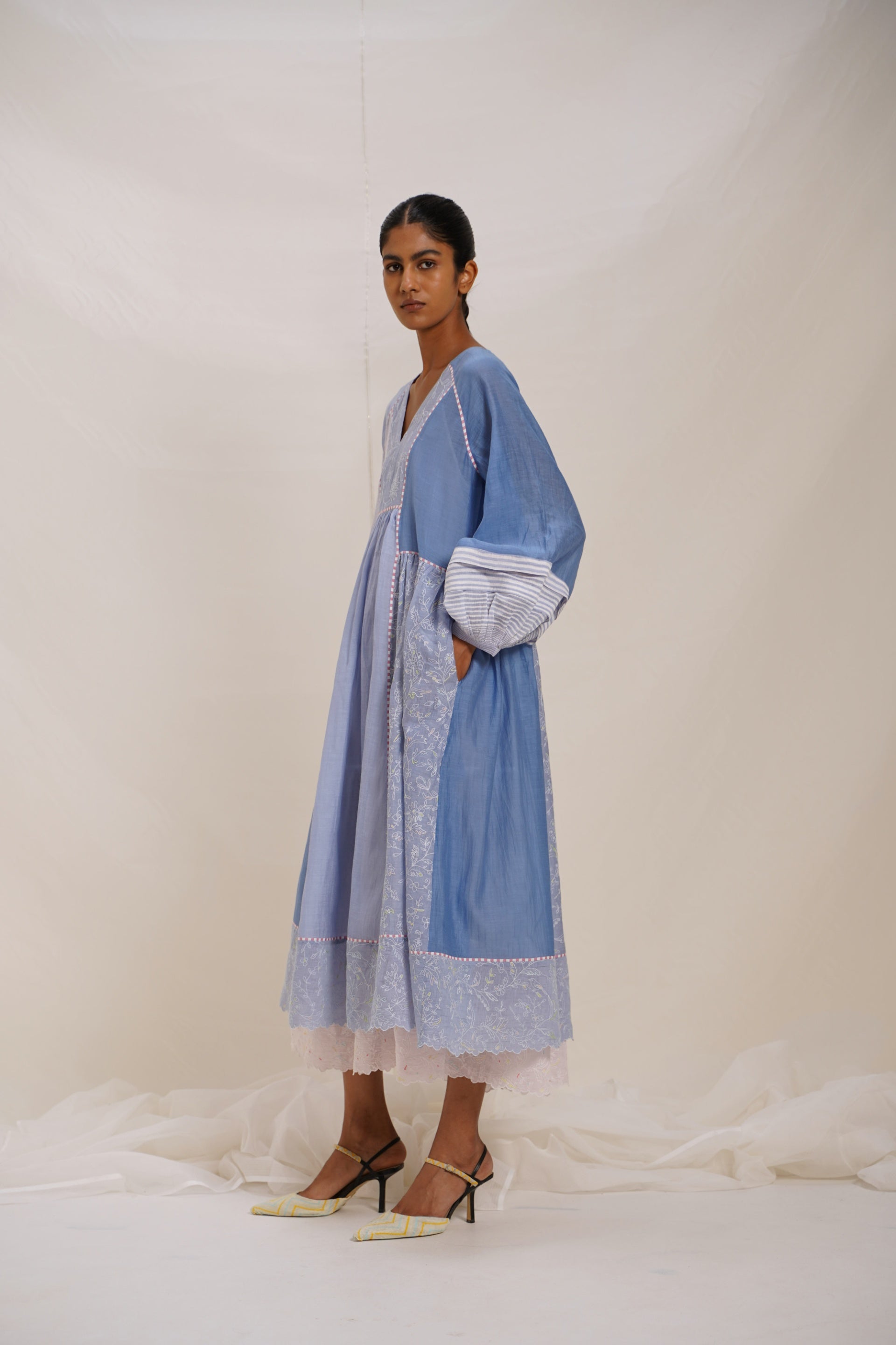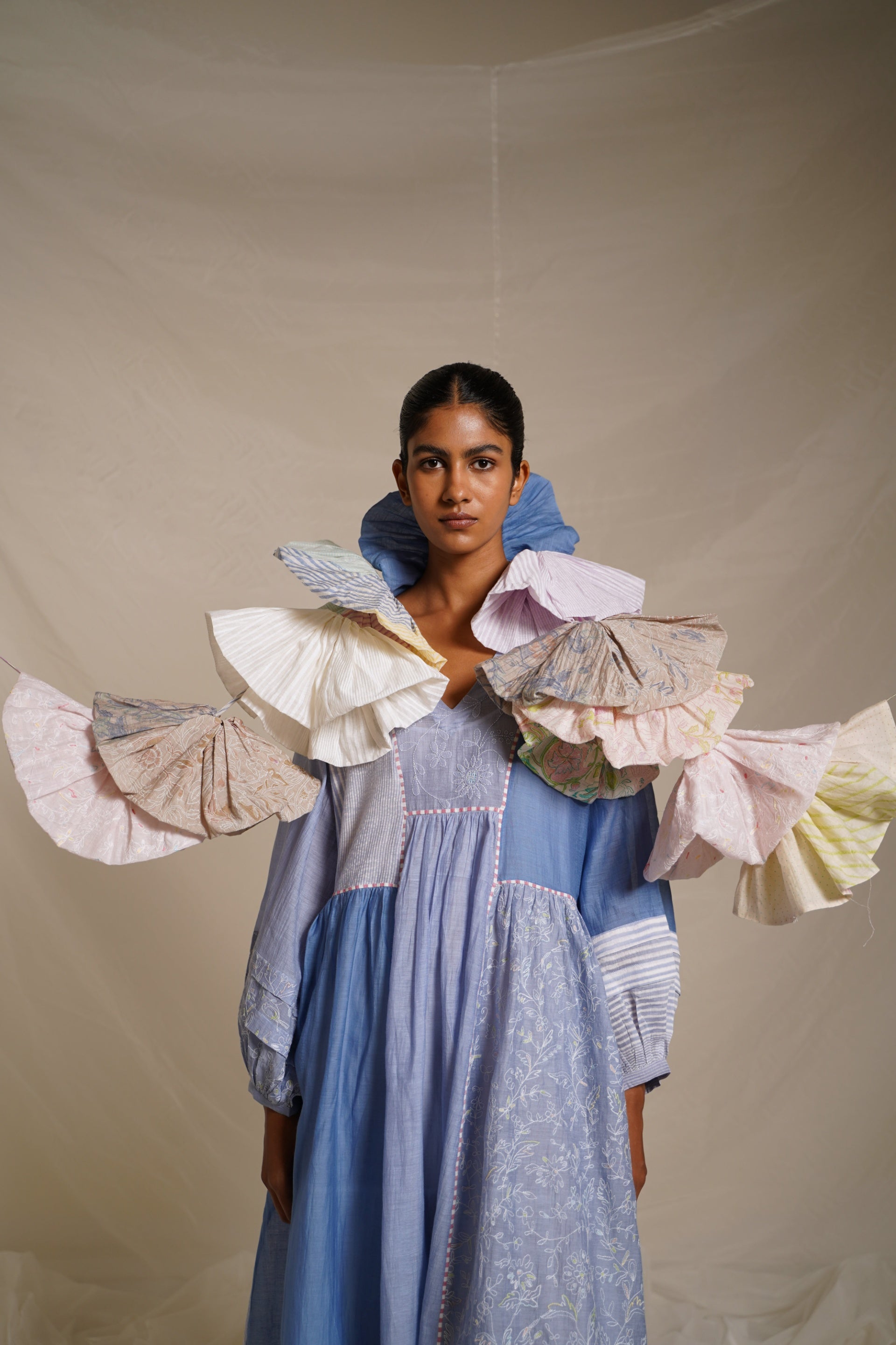 Midi dress fusion of traditional handwork and modern design featuring a patchwork of floral embroidery, hand block stripes and contrast piping carefully placed to create a harmonious balance of patterns and textures. The embroidery adds depth and a touch of luxury to the dress, making each piece unique. Blend of cotton silk fabric for comfort and light weight, The border is made from hand block print, complement the larger floral embroidery and stripes prints.