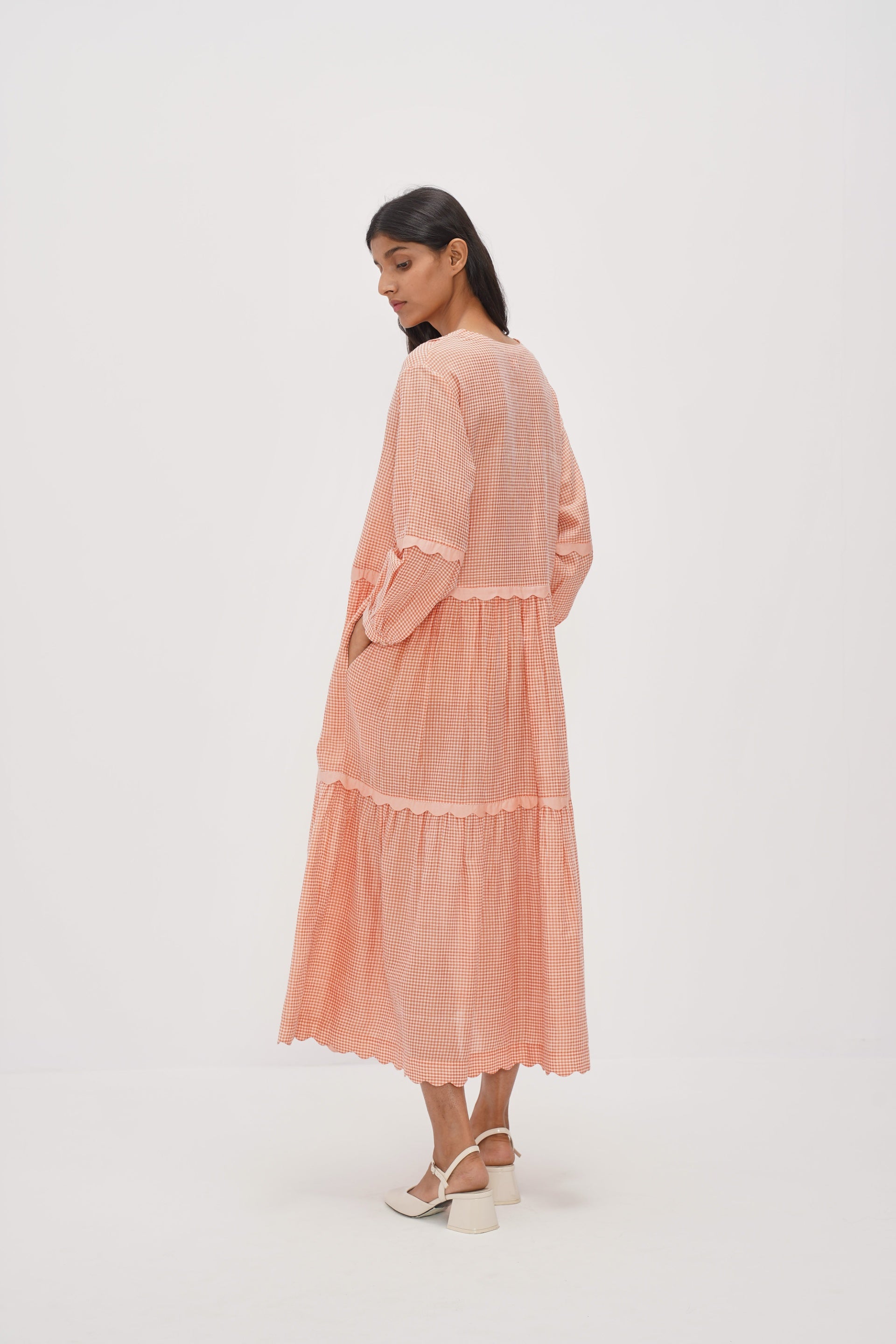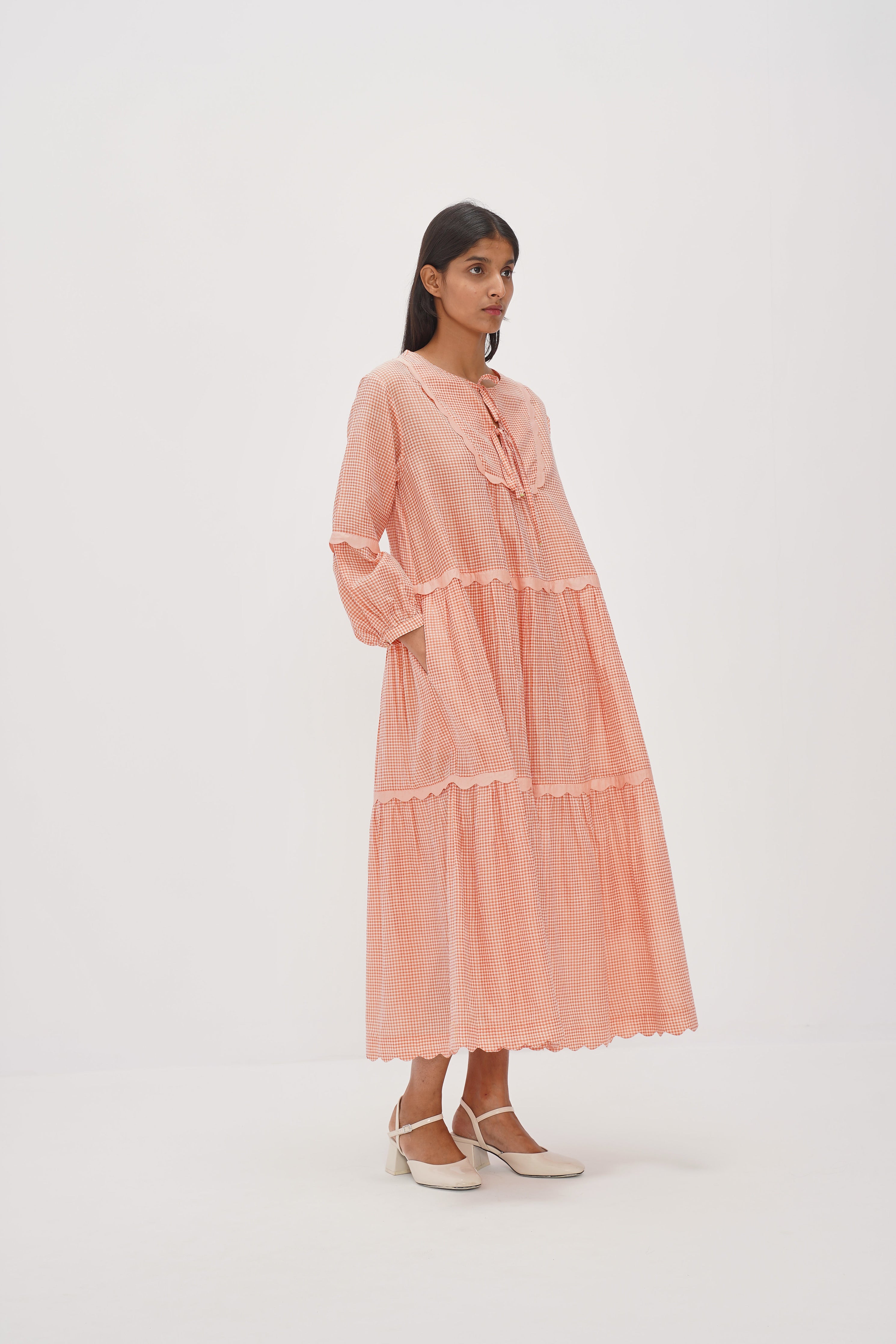 Coral checkered cotton silk dress with scallop detail insert and tie-up closure on the neckline
