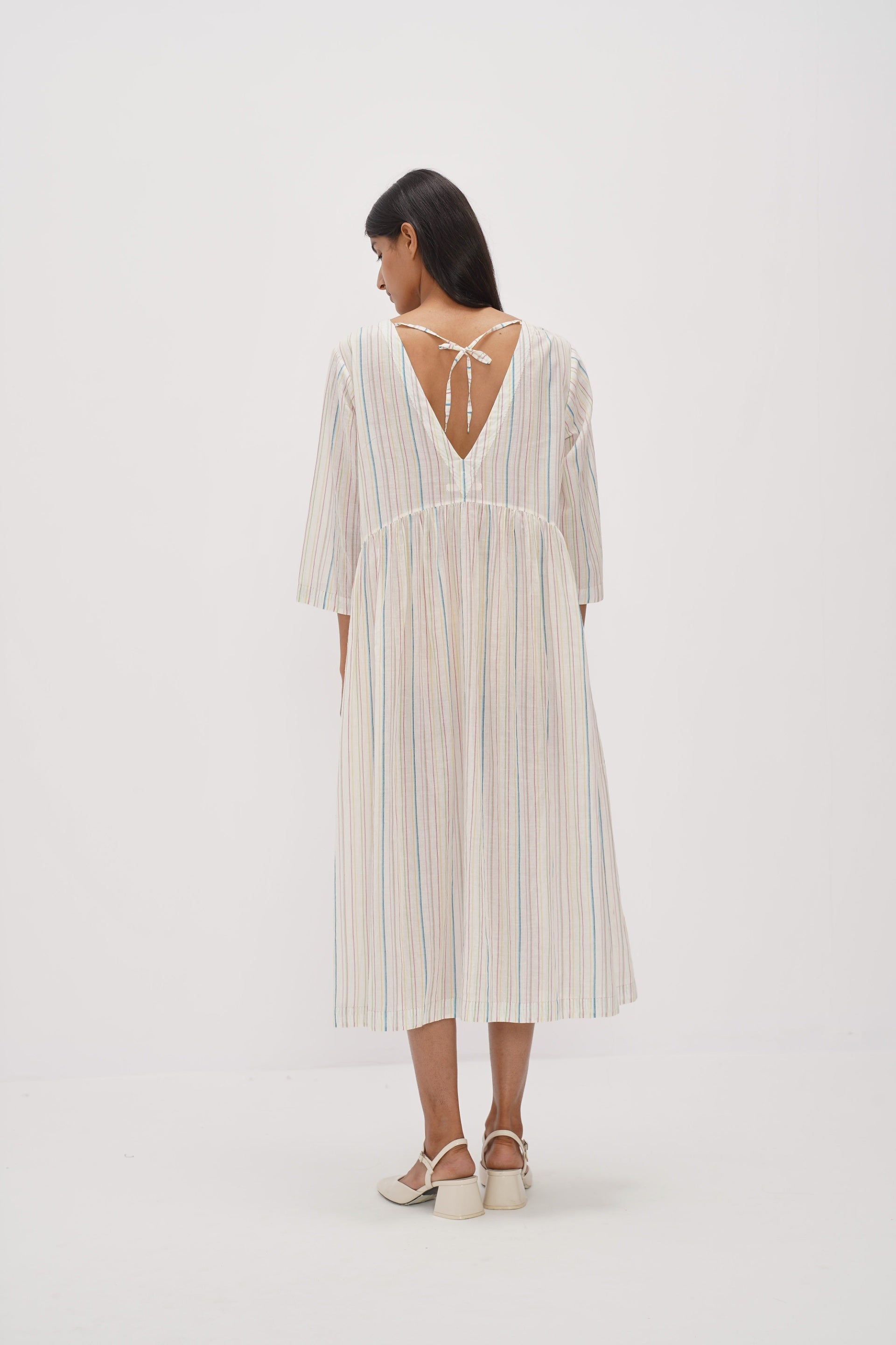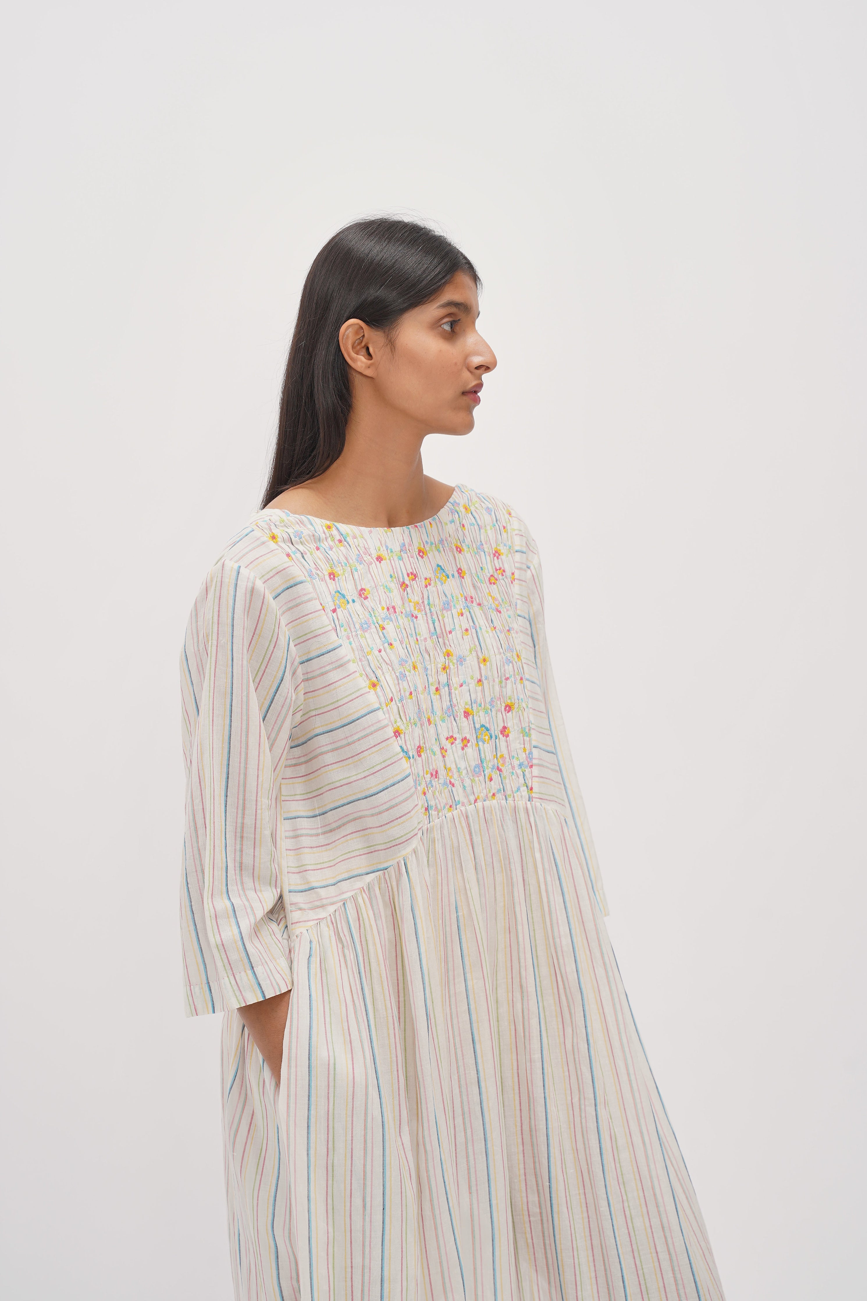 Multistriper cotton dress with floral multicolor embroidered yoke.