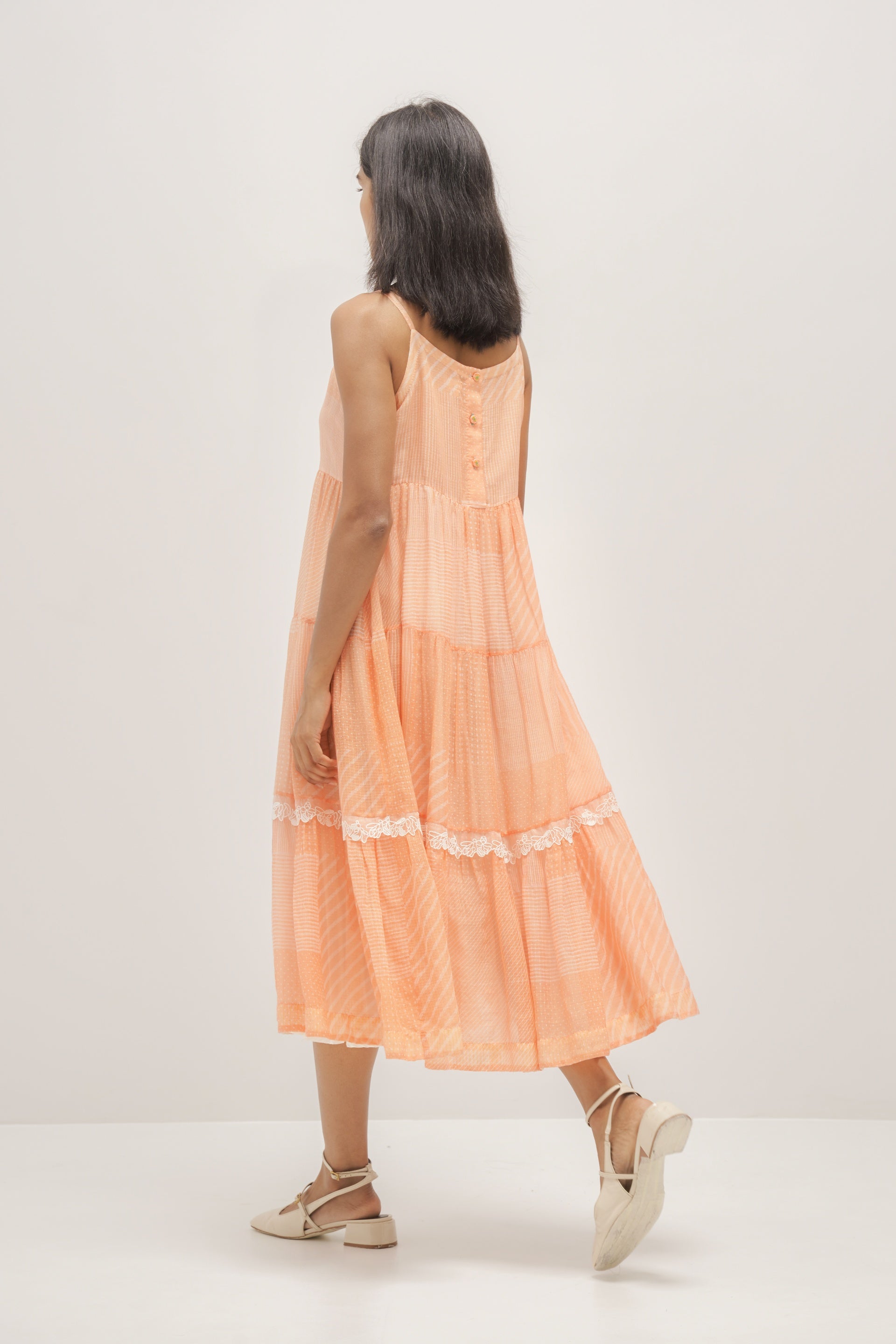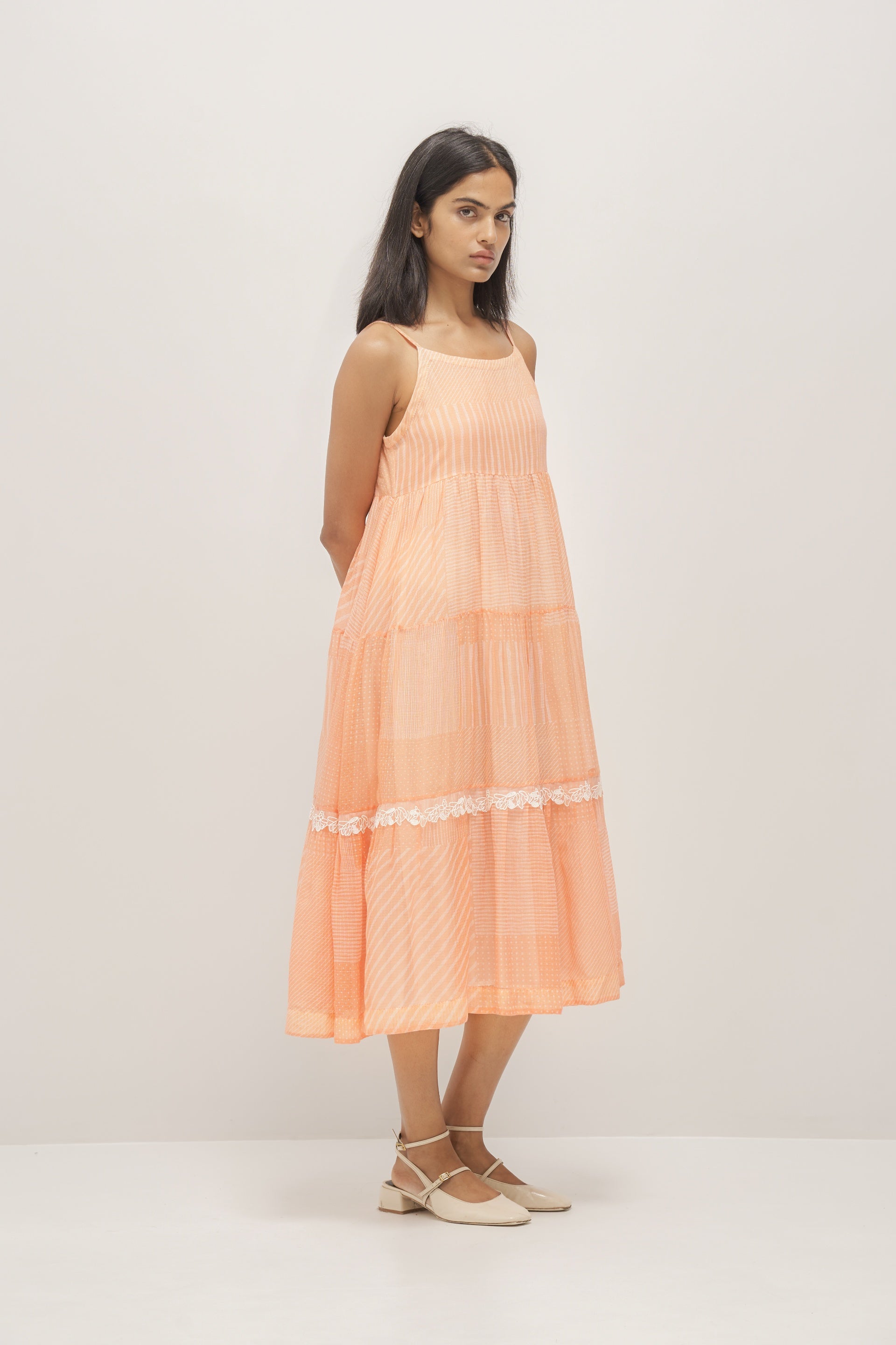 Coral sleeveless tiered kota doriya dress with discharged print collage and white organza trim detail. Comes with an attached cotton silk lining
