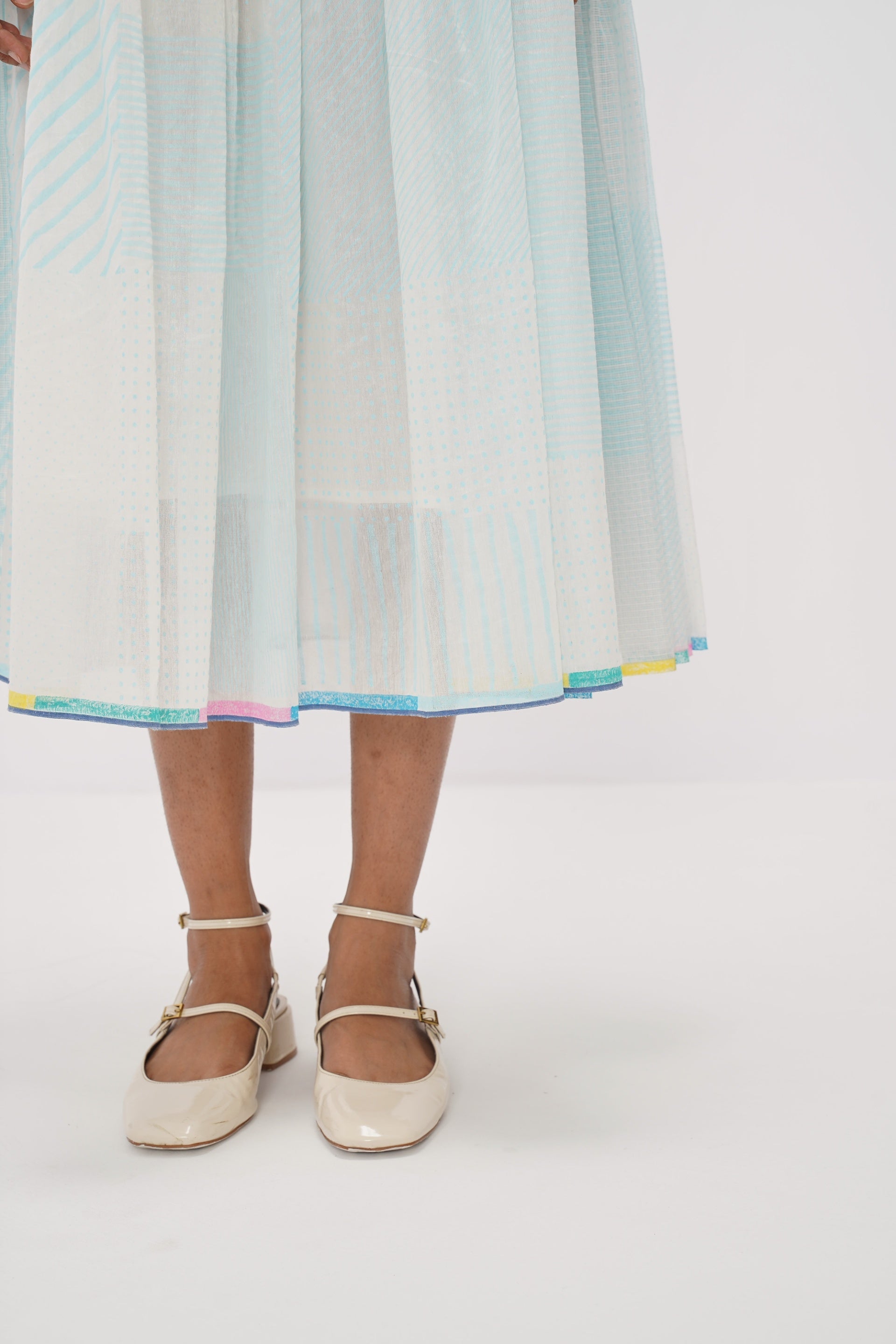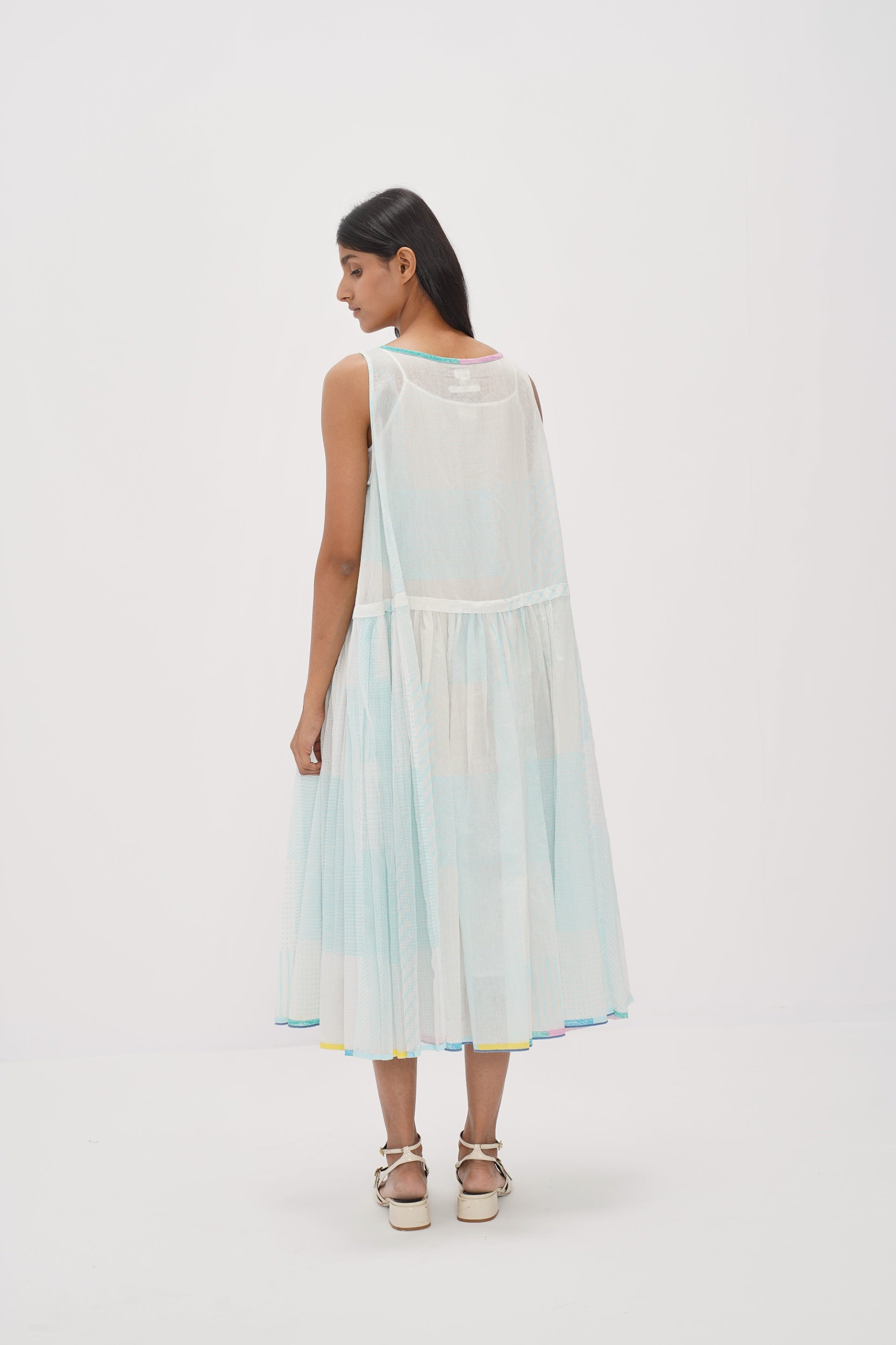 Ice blue sleeveless dress in cotton silk handloom and kota doriya with blue print collage and multicolor printed selvedge detail. Comes with a separate white cotton silk lining