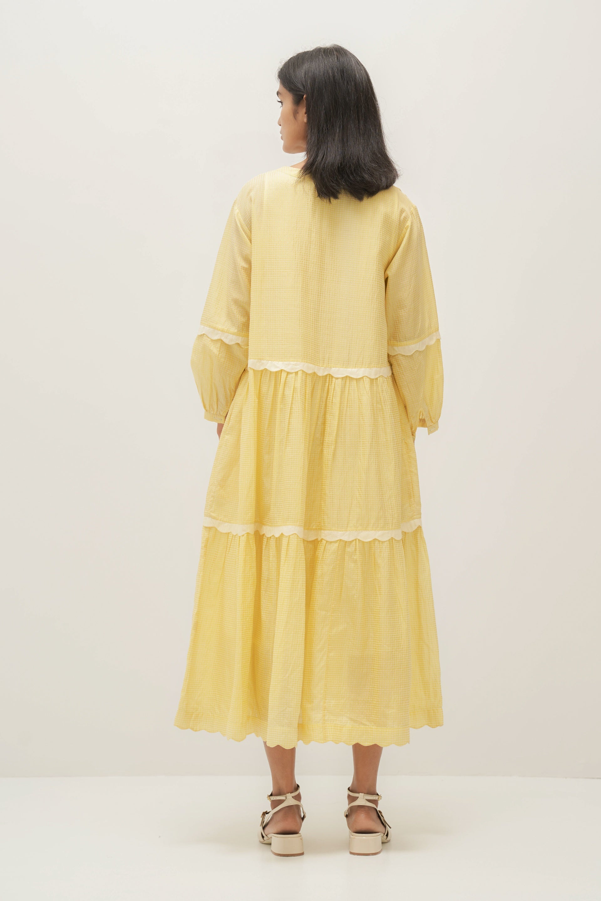 Yellow checkered dress in cotton silk with scallop inserts and tie-up detail