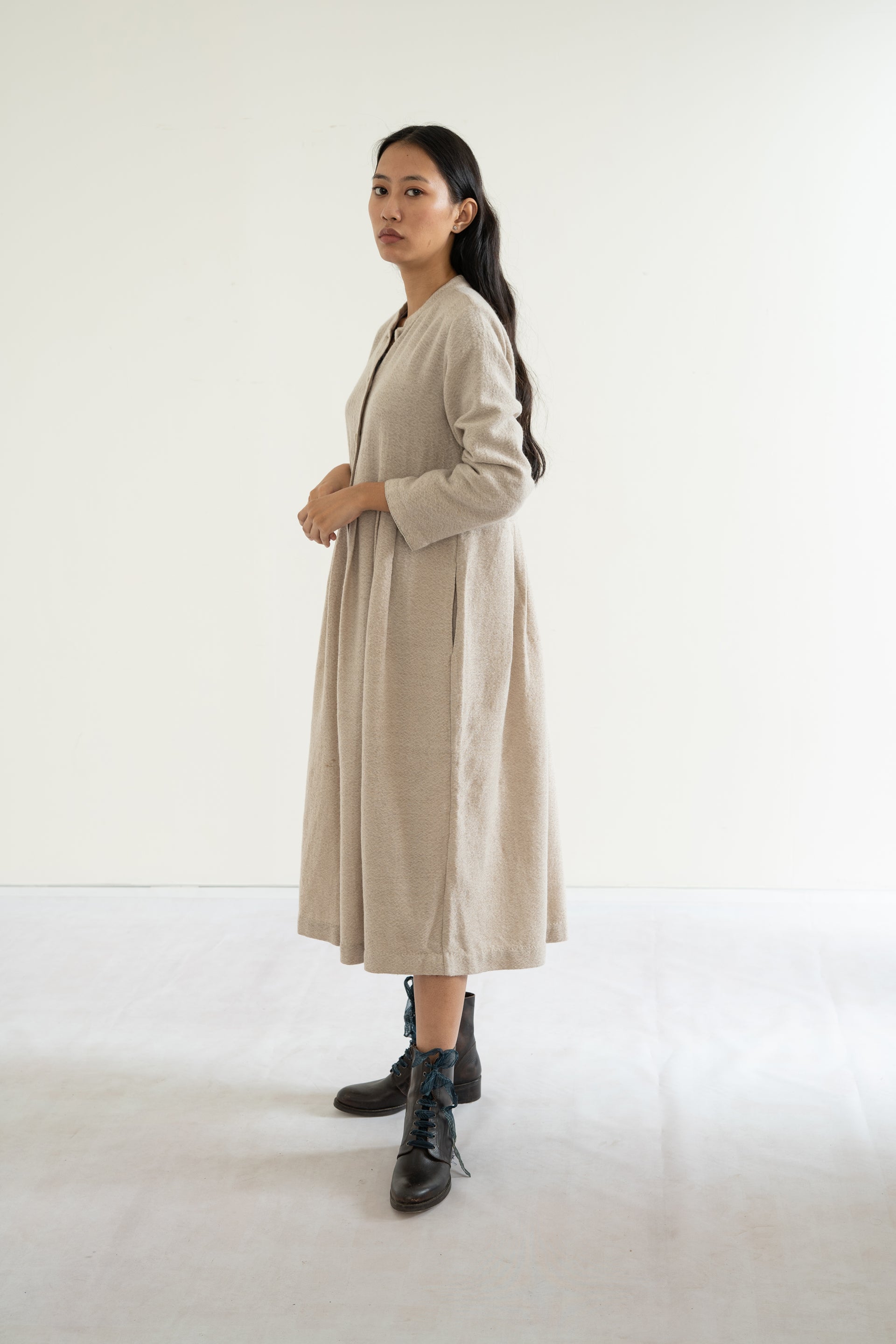 Pleated dress in 100% wool with button-down closure, side pockets and band collar