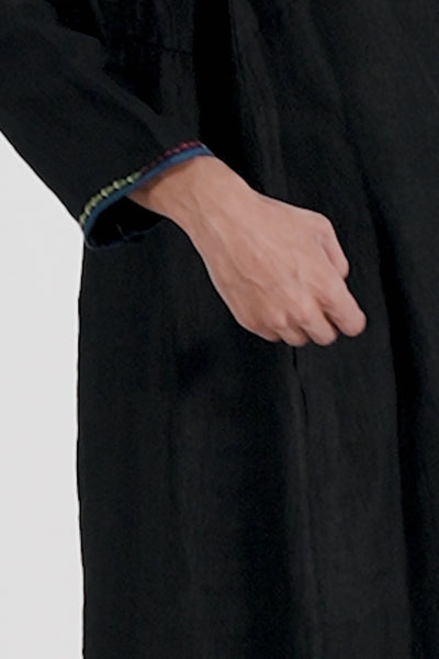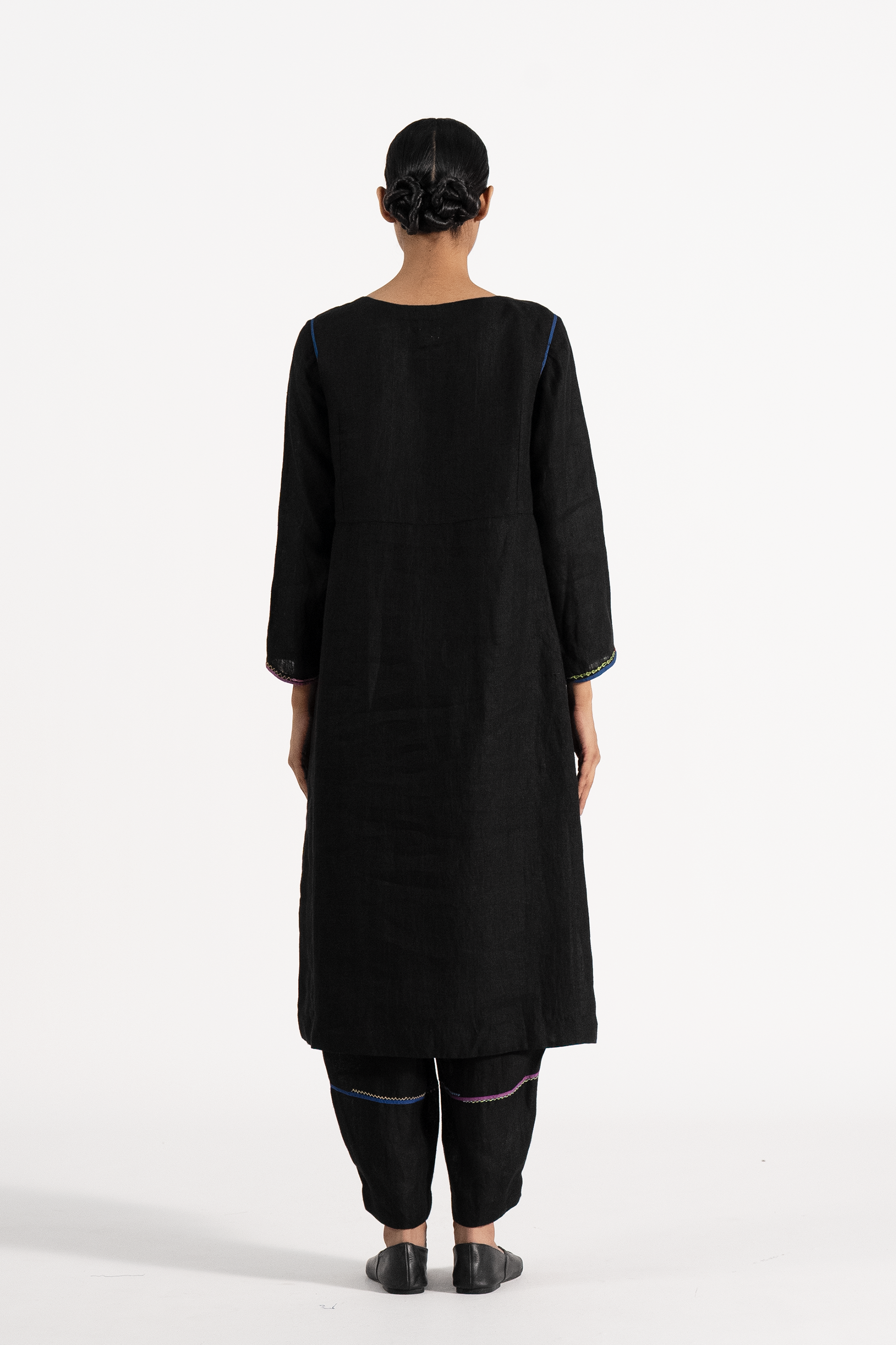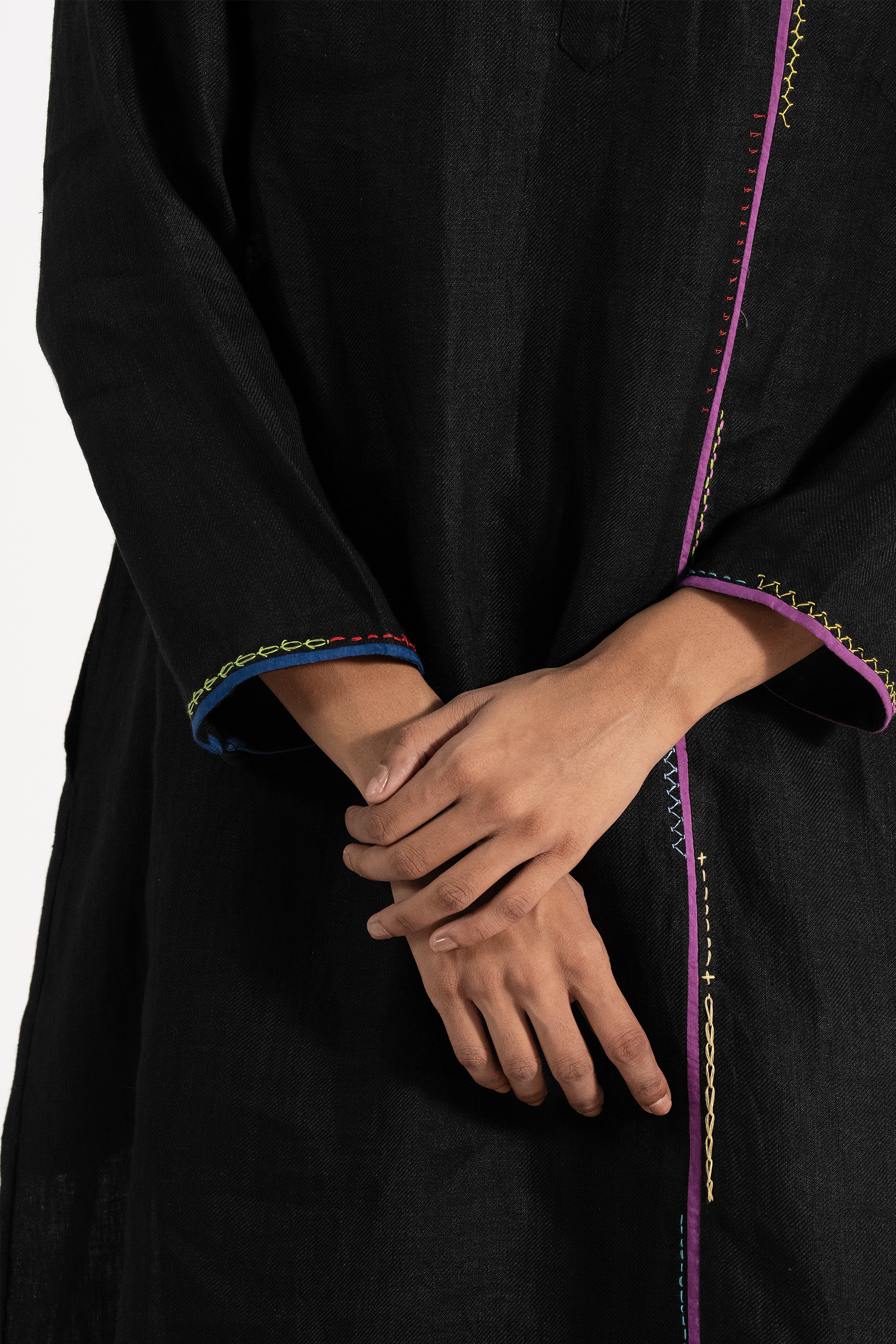 Round Neck Semi Fitted Midi Length Kurta Dress With 3/4th Sleeves With Multicolor Hand Stitch Detail In 100% Linen.