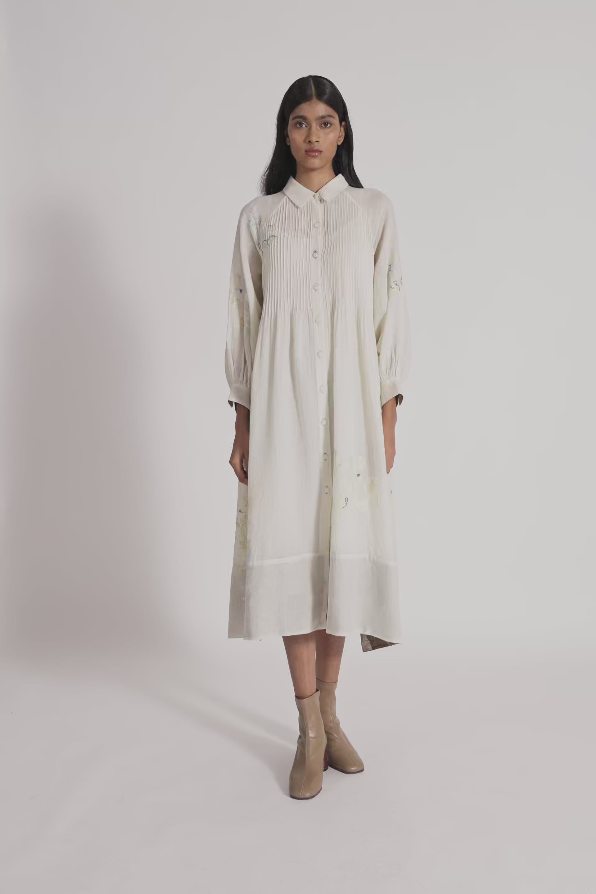 Relaxed Fit Button Down Midi Dress With Raglan Sleeves With Intricate Floral Placement Hand Embroidery In 100% Merino Wool With 100% Silk Quilted Hem.