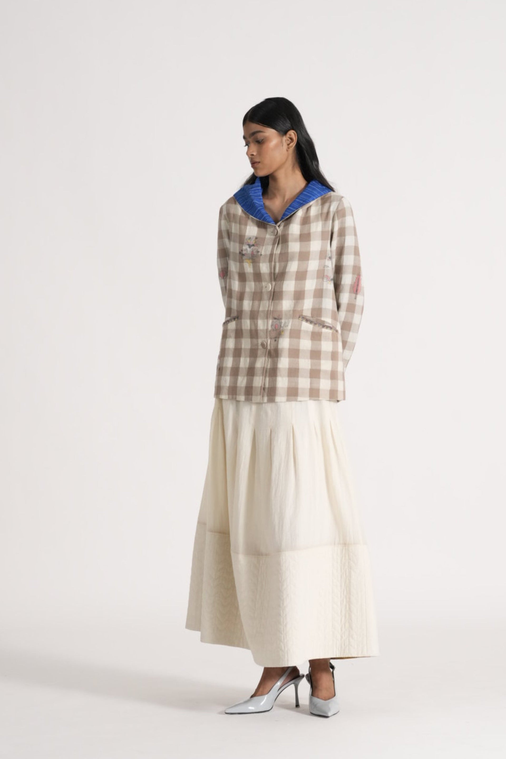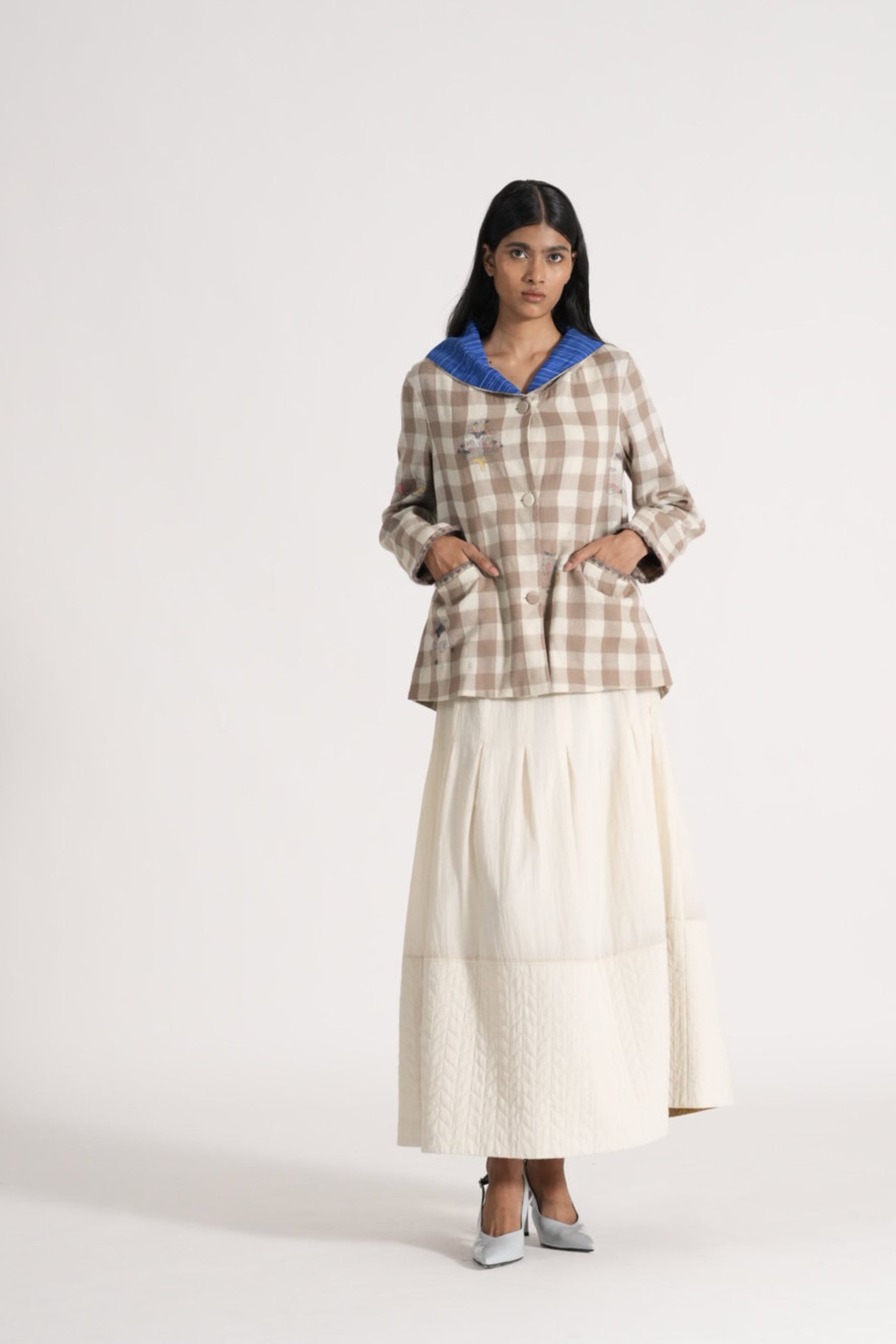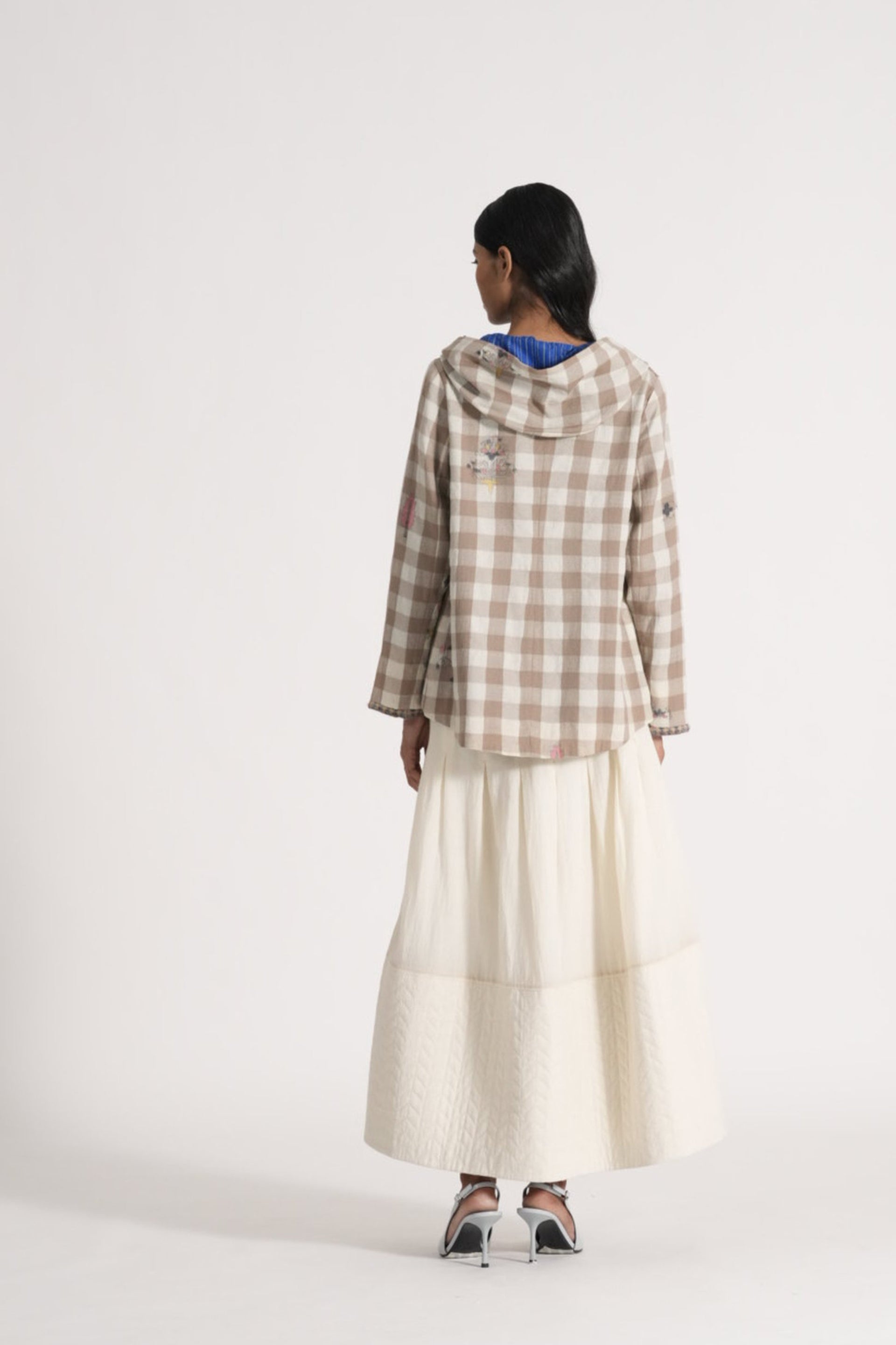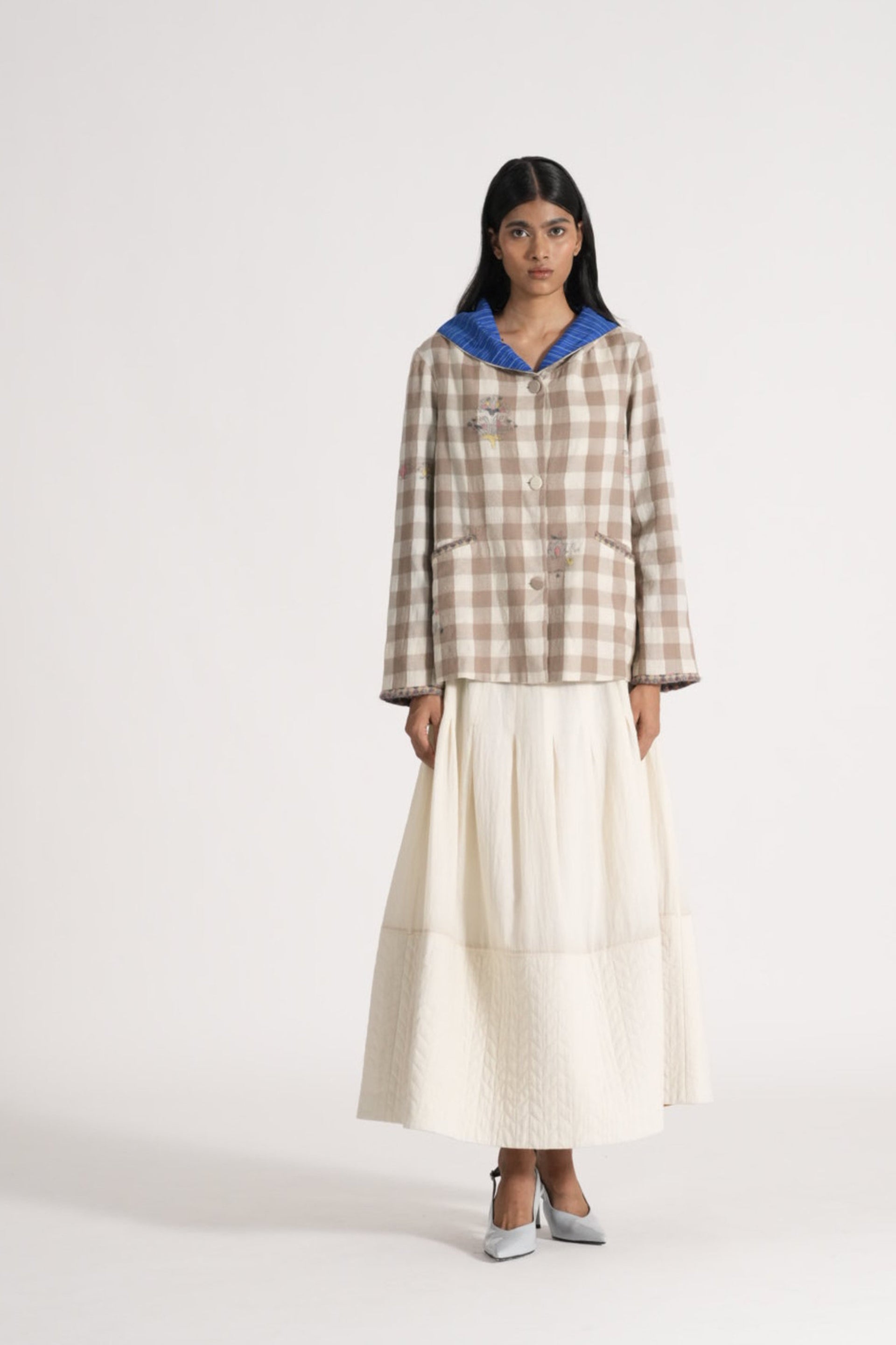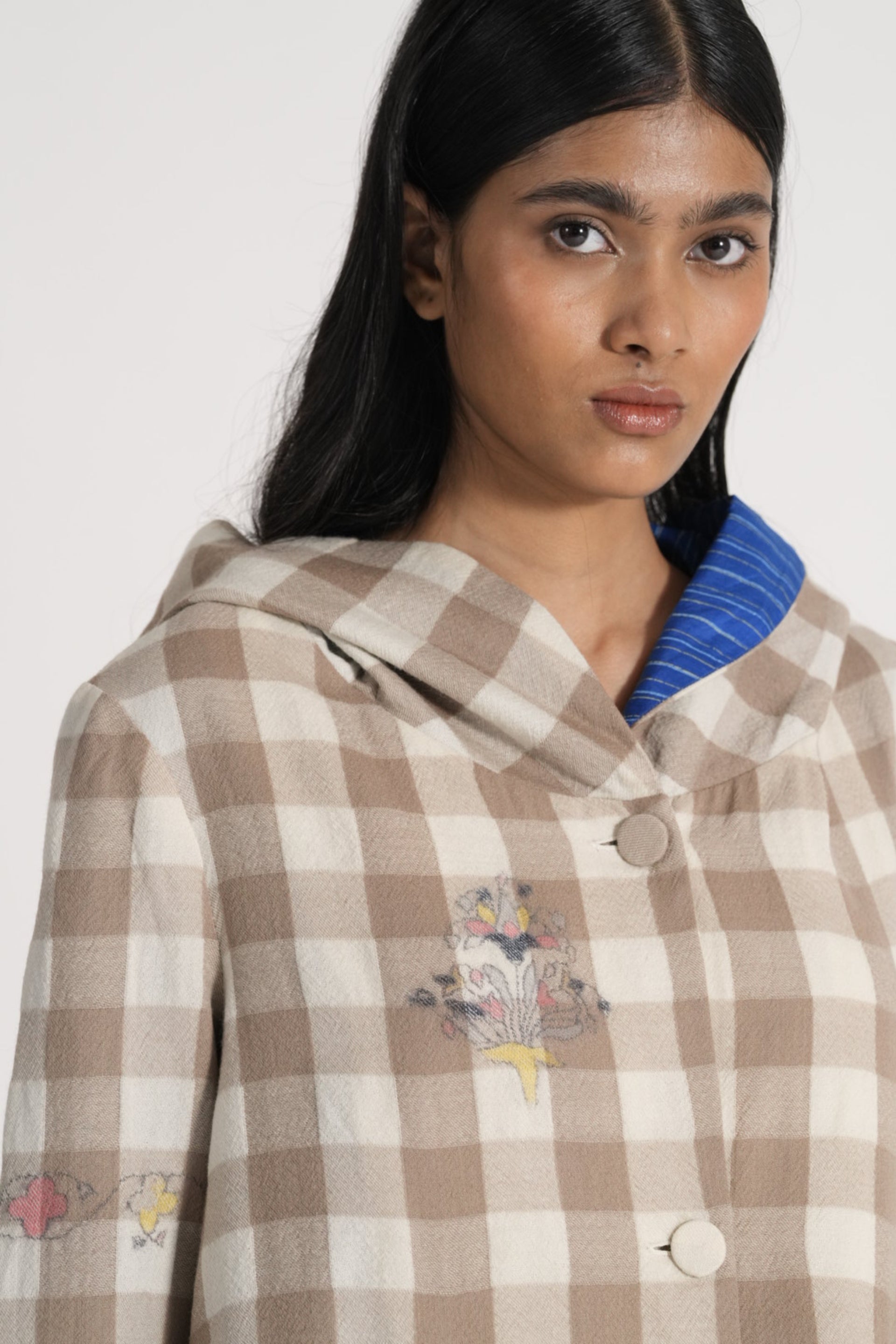 Button Down Hooded Jacket With Velt Pocket On Front Panel In Multicolor Self Checkered And Jacquard Floral Motifs 100% Merino Wool. Lined With Handblock Print 100% Silk.